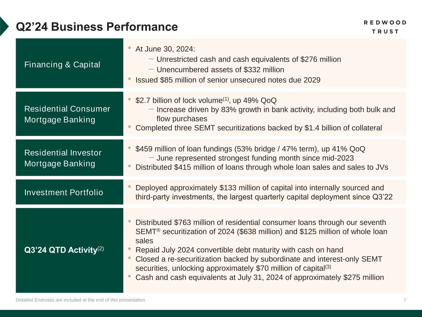 6 Single-Family Investment Portfolio 62% Multifamily Investment Portfolio 13% Residential Consumer MB 18% Residential Investor MB 6% Detailed Endnotes are included at the end of this presentation. Earnings Available for Distribution (“EAD”) and EAD Return on Equity (“EAD ROE”) are non-GAAP measures. See “Non-GAAP Measures” slides in the Endnotes for additional information and reconciliation to GAAP metrics. Note that percentages may not foot due to rounding. Q2’24 Financial Performance Recourse Leverage Ratio(6) Q2’24 Total Economic Return: +1.3%(2) 10.0% Indicative Dividend Yield as of June 30, 2024(3) GAAP ROE Non-GAAP EAD ROE(5) GAAP EPS (Diluted) Non-GAAP EAD Per Share(1) (Basic) Earnings Per Share GAAP Book Value Common Dividend Capital Allocation(4) Return on Equity Financing & Capital 24% Mortgage Banking Unrestricted Cash ($mm) $1.6 billion of allocated capital 76% Investment Portfolio $8.78 $8.73 Q1'24 Q2'24 $0.16 $0.16 Q1'24 Q2'24 $0.21 $0.10 Q1'24 Q2'24 $0.08 $0.13 Q1'24 Q2'24 10.0% 4.8% Q1'24 Q2'24 3.9% 6.5% Q1'24 Q2'24 1.9x 2.1x Q1'24 Q2'24 $275 $276 Q1'24 Q2'24