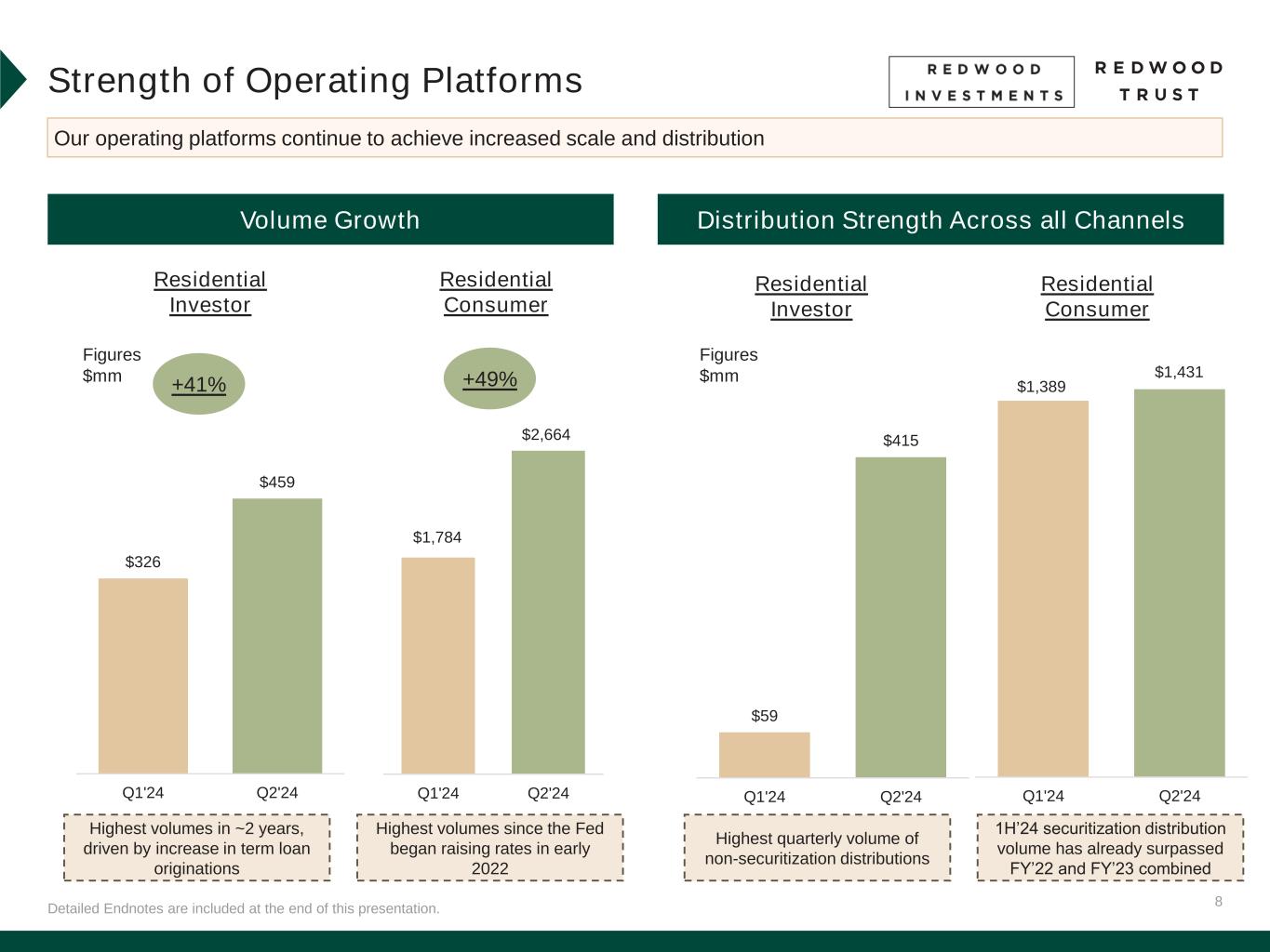 7Detailed Endnotes are included at the end of this presentation. Q2’24 Business Performance Financing & Capital • At June 30, 2024: – Unrestricted cash and cash equivalents of $276 million – Unencumbered assets of $332 million • Issued $85 million of senior unsecured notes due 2029 Residential Consumer Mortgage Banking • $2.7 billion of lock volume(1), up 49% QoQ – Increase driven by 83% growth in bank activity, including both bulk and flow purchases • Completed three SEMT securitizations backed by $1.4 billion of collateral Residential Investor Mortgage Banking • $459 million of loan fundings (53% bridge / 47% term), up 41% QoQ – June represented strongest funding month since mid-2023 • Distributed $415 million of loans through whole loan sales and sales to JVs Investment Portfolio • Deployed approximately $133 million of capital into internally sourced and third-party investments, the largest quarterly capital deployment since Q3’22 Q3’24 QTD Activity(2) • Distributed $763 million of residential consumer loans through our seventh SEMT® securitization of 2024 ($638 million) and $125 million of whole loan sales • Repaid July 2024 convertible debt maturity with cash on hand • Closed a re-securitization backed by subordinate and interest-only SEMT securities, unlocking approximately $70 million of capital(3) • Cash and cash equivalents at July 31, 2024 of approximately $275 million