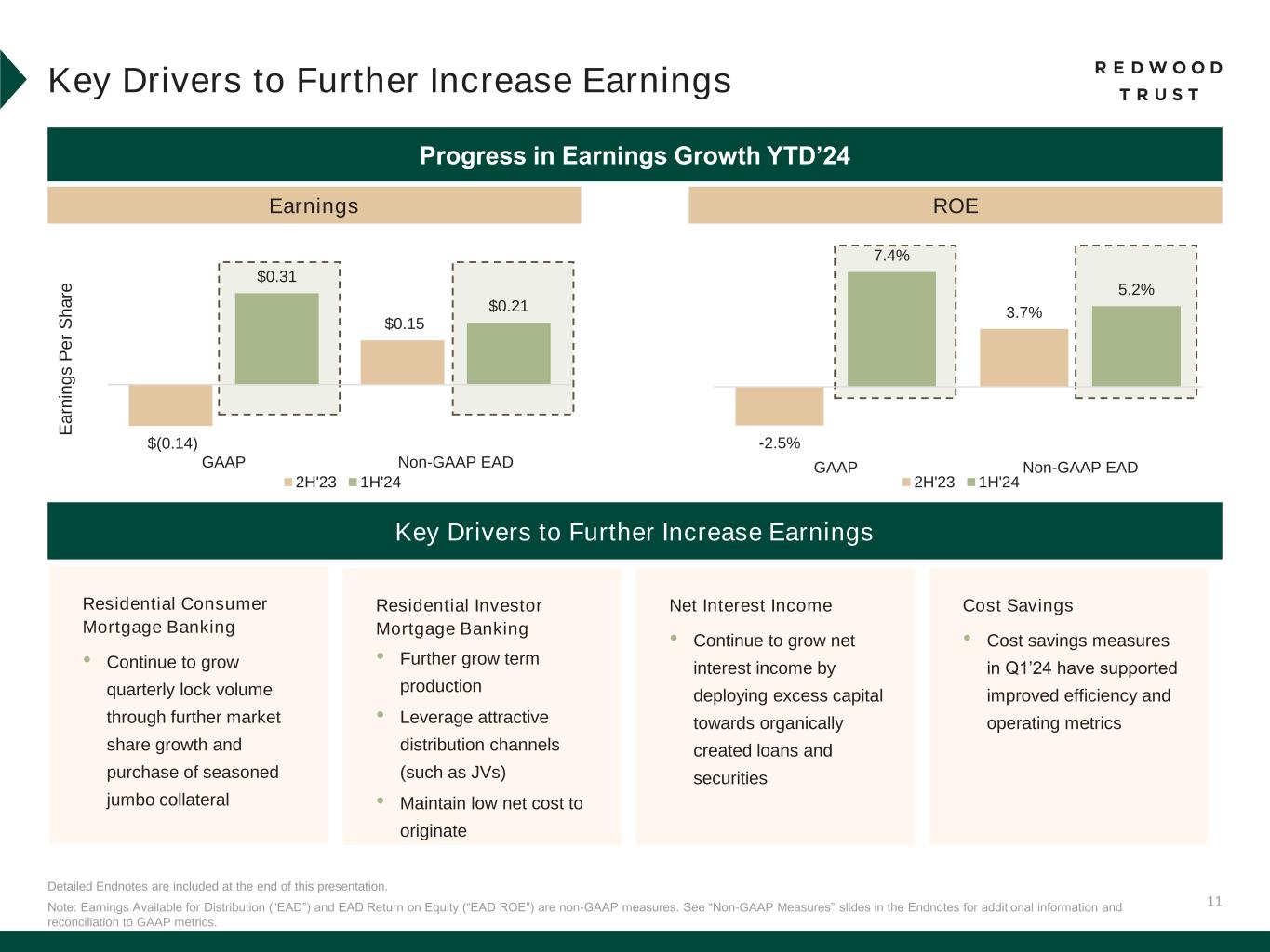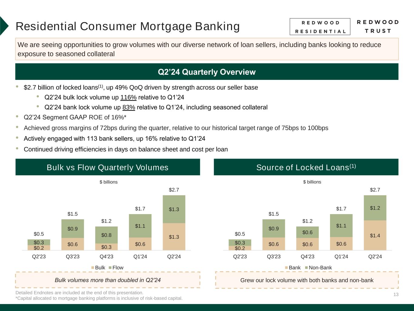 11 Detailed Endnotes are included at the end of this presentation. Key Drivers to Further Increase Earnings Key Drivers to Further Increase Earnings Note: Earnings Available for Distribution (“EAD”) and EAD Return on Equity (“EAD ROE”) are non-GAAP measures. See “Non-GAAP Measures” slides in the Endnotes for additional information and reconciliation to GAAP metrics. E a rn in g s P e r S h a re $(0.14) $0.15 $0.31 $0.21 GAAP Non-GAAP EAD 2H'23 1H'24 Progress in Earnings Growth YTD’24 Earnings ROE -2.5% 3.7% 7.4% 5.2% GAAP Non-GAAP EAD 2H'23 1H'24 Residential Consumer Mortgage Banking • Continue to grow quarterly lock volume through further market share growth and purchase of seasoned jumbo collateral Residential Investor Mortgage Banking • Further grow term production • Leverage attractive distribution channels (such as JVs) • Maintain low net cost to originate Net Interest Income • Continue to grow net interest income by deploying excess capital towards organically created loans and securities Cost Savings • Cost savings measures in Q1’24 have supported improved efficiency and operating metrics