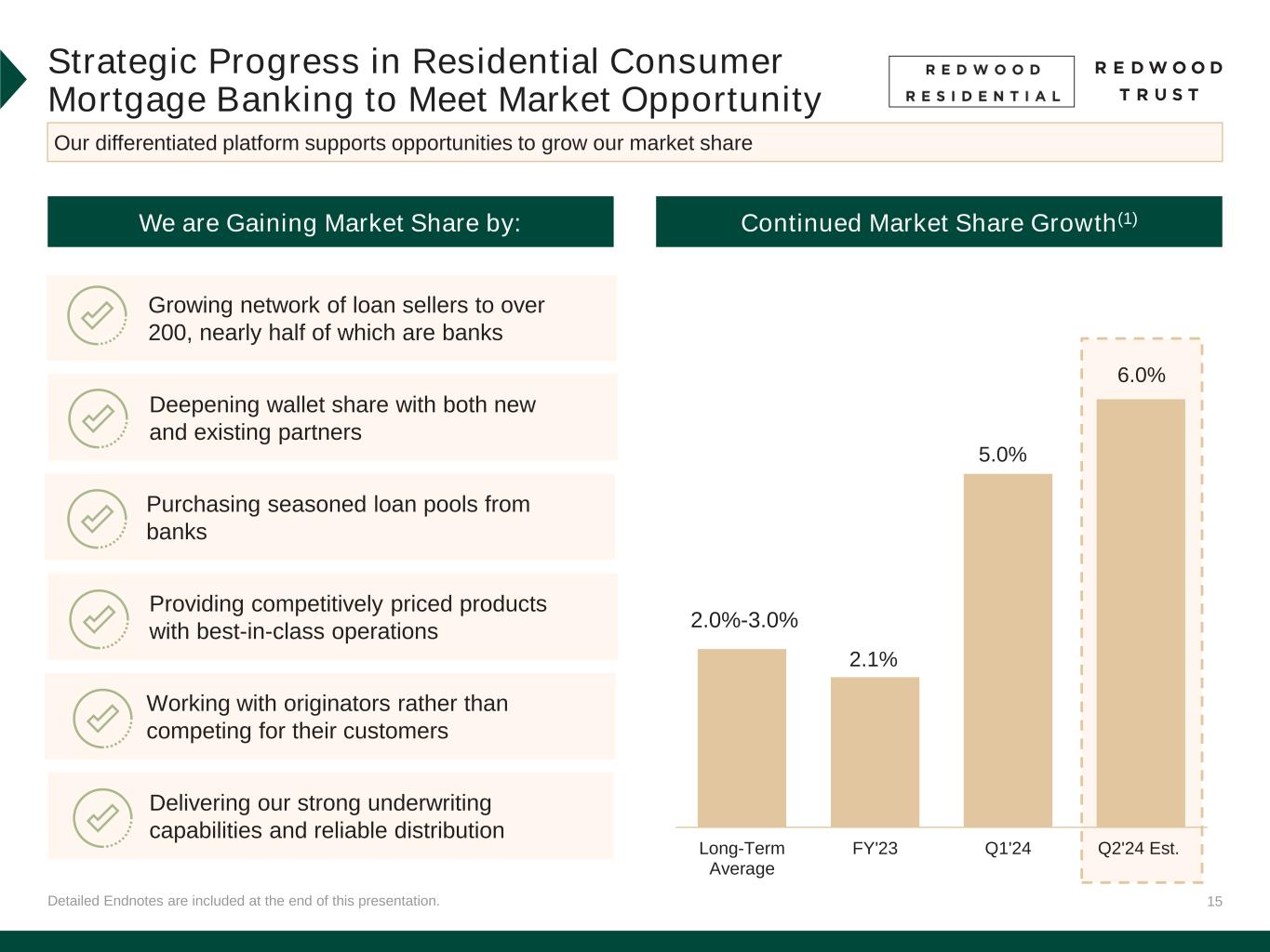 14 500 600 700 800 900 1,000 1,100 1,200 1,300 1,400 '18 '19 '20 '21 '22 '23 '24 $ B ill io ns Detailed Endnotes are included at the end of this presentation. Significant Opportunity in Residential Consumer We are complementing wallet share gains in forward flow production with bulk purchases of seasoned collateral Flow OpportunitiesBulk Opportunities Of the $2.8 trillion of residential assets held on bank balance sheets, $1.3 trillion are jumbo loans ~$200bn We estimate that ~60% of this constituency currently has a flow arrangement with Redwood(3) Estimated FY’24 Jumbo Production by Top 50 Originators(2) Holdings of Jumbo Loans by Bank Portfolios(1) Unlocking market share by building and re-establishing relationships with a significant number of banking partners Working with banks to support capital relief and liquidity objectives through purchases of seasoned loan pools Non-Bank, 17% Regional Bank, 29% Money-Center Bank, 54%