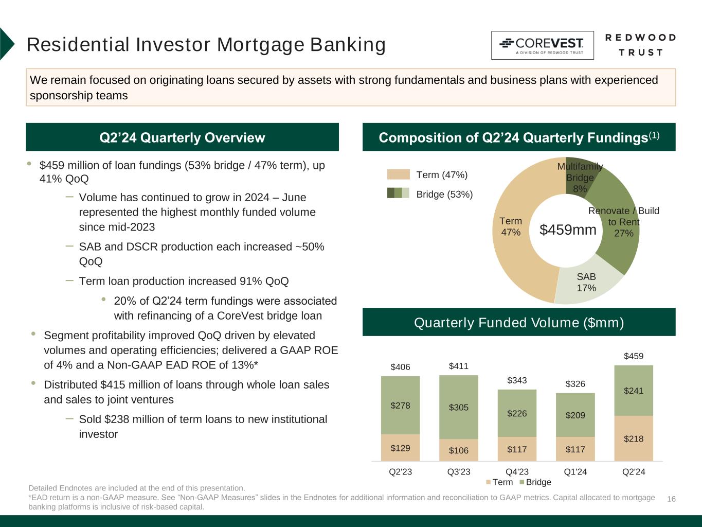 33 Slide 8 (Strength of Operating Platforms)​ Source: Company financial data as of June 30, 2024 unless otherwise noted. Slide 9 (Ongoing Operating Efficiencies)​ Source: Company financial data as of June 30, 2024 unless otherwise noted. Slide 10 (Update on CPP Investments Partnership)​ Source: Company financial data as of June 30, 2024 unless otherwise noted. Slide 11 (Key Drivers to Further Increase Earnings)​ Source: Company financial data as of June 30, 2024 unless otherwise noted. Slide 13 (Residential Consumer Mortgage Banking)​ Source: Company financial data as of June 30, 2024 unless otherwise noted. 1. Lock volume represents loans identified for purchase from loan sellers. Lock volume does not account for potential fallout from pipeline that typically occurs through the lending process. Slide 14 (Significant Opportunity in Residential Consumer )​ Source: Company financial data as of June 30, 2024 unless otherwise noted. 1. Source: JP Morgan Research, CoreLogic, Bank Filings and S&P. 2. Source: Estimated FY’24 jumbo production opportunity based on MBA Mortgage Finance Forecast for full year 2024 (as of July 2024), adjusted for estimated 12% share to jumbo production. 3. Source: Composition of Top 50 jumbo originators based on Inside Mortgage Finance LTM total jumbo origination production. Slide 15 (Strategic Progress in Residential Consumer Mortgage Banking to Meet Market Opportunity)​ Source: Company financial data as of June 30, 2024 unless otherwise noted. 1. Q2’24 market share calculated as Q2’24 Residential Consumer lock volume divided by estimated Q2’24 total market jumbo volume. Based on management’s estimates and actual results may differ materially. Slide 16 (Residential Investor Mortgage Banking)​ Source: Company financial data as of June 30, 2024 unless otherwise noted. 1. Composition percentages are based on unpaid principal balance. Slide 18 (Investment Portfolio)​ Source: Company financial data as of June 30, 2024 unless otherwise noted. 1. Represents management’s estimates and actual results may differ materially. 2. Figures reflect our investments held in our Investment Portfolio on balance sheet and our economic interests in securities we own in securitizations we consolidate in accordance with GAAP (and excludes the assets within these consolidated securitizations that appear on our balance sheet) as of June 30, 2024. 3. $199 million of “Other Investments” includes $41 million net investment of multifamily securities, $54 million of third-party securities, and $104 million of other investments. Slide 19 (Potential Book Value Per Share Upside Driven by Underlying Asset Strength)​ Source: Company financial data as of June 30, 2024 unless otherwise noted. 1. Source: Bloomberg (HPI LTV (Amort) %), Home Price Indexed Amortized Loan to Value. 2. Bridge loan delinquency rate calculations were updated in Q2'24 to include full UPB values for loans in JVs (prior period presented was conformed to updated calculation methodology). Calculation excludes third-party originated bridge loans. 3. Represents management’s estimates of potential book value per share upside on our securities portfolio due to the net discount to par value, net of portfolio hedges. There are several factors that may impact our ability to realize all, or a portion, of this amount which may be outside our control, including credit performance and prepayment speeds. Actual realized book value returns may differ materially. 4. Represents the market value of subordinate securities at June 30, 2024 divided by the outstanding principal balance at June 30, 2024 as a dollar price per $100 par value. Endnotes
