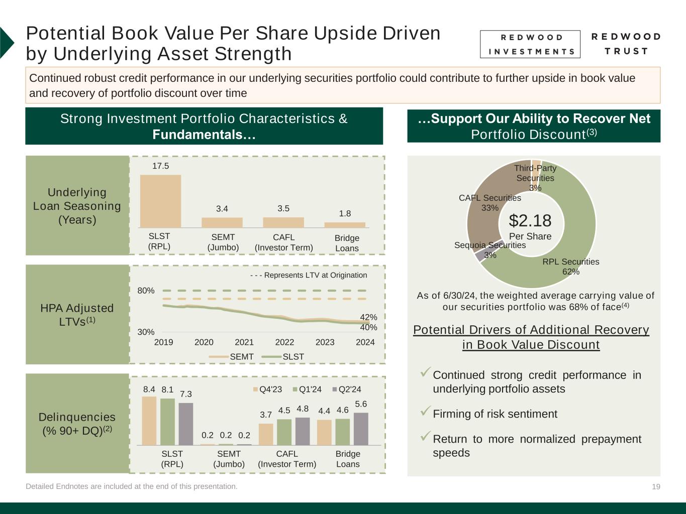 18 Detailed Endnotes are included at the end of this presentation. Note: Numbers may not foot due to rounding. Investment Portfolio During the first quarter, we actively deployed capital into accretive new investments Q2’24 Quarterly Performance $3.4 of Billion Housing Credit Investments Organically Created (80%) $1.2bn Residential Consumer $0.4bn (12%) Residential Investor $2.2bn (65%) Third-Party $0.8bn (22%) Figures ($mm) Summary of Investment Portfolio at 6/30/24 by Economic Investments(2) by Capital • Credit fundamentals within our single-family investment portfolio remained strong • We deployed $133 million of capital into organic and third-party assets, our highest quarterly capital deployment since Q3’22 • Looking ahead, we will continue to target new organic and third-party investments for our portfolio with mid-teens returns(1) • Reduced Residential Investor balance sheet exposure through joint venture and whole loan sales • Portfolio secured recourse leverage declined to 0.6x relative to 0.9x in Q1’24 (3) MSR/Risk- Share 3% Residential Jumbo (SEMT) 15% SFR (CAFL) Securities 14% Multifamily Bridge Loans 16% Single-Family Bridge Loans 16% RPL (SLST) Securities 7% HEI 15% Other Investments 14%(3) MSR/Risk-Share, $52 Residential Jumbo (SEMT), $367 SFR (CAFL) Securities, $337 Multifamily Bridge Loans, $831 Single-Family Bridge Loans, $1,052 RPL (SLST) Securities, $258 HEI, $294 Other Investments, $199