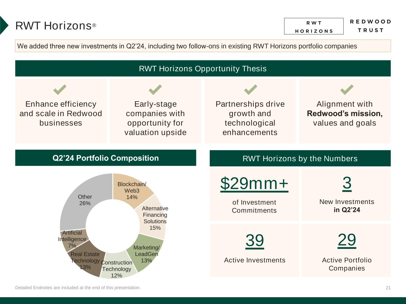 21Detailed Endnotes are included at the end of this presentation. RWT Horizons® We added three new investments in Q2’24, including two follow-ons in existing RWT Horizons portfolio companies RWT Horizons by the Numbers RWT Horizons Opportunity Thesis Enhance efficiency and scale in Redwood businesses Early-stage companies with opportunity for valuation upside Partnerships drive growth and technological enhancements Alignment with Redwood’s mission, values and goals Q2’24 Portfolio Composition of Investment Commitments $29mm+ 3 New Investments in Q2’24 39 Active Investments 29 Active Portfolio Companies Blockchain/ Web3 14% Alternative Financing Solutions 15% Marketing/ LeadGen 13%Construction Technology 12% Real Estate Technology 13% Artificial Intelligence 7% Other 26%