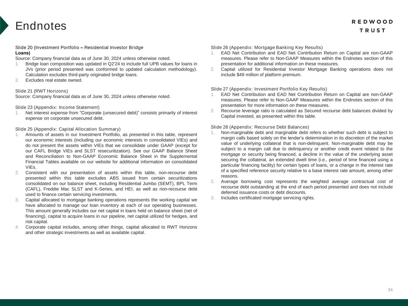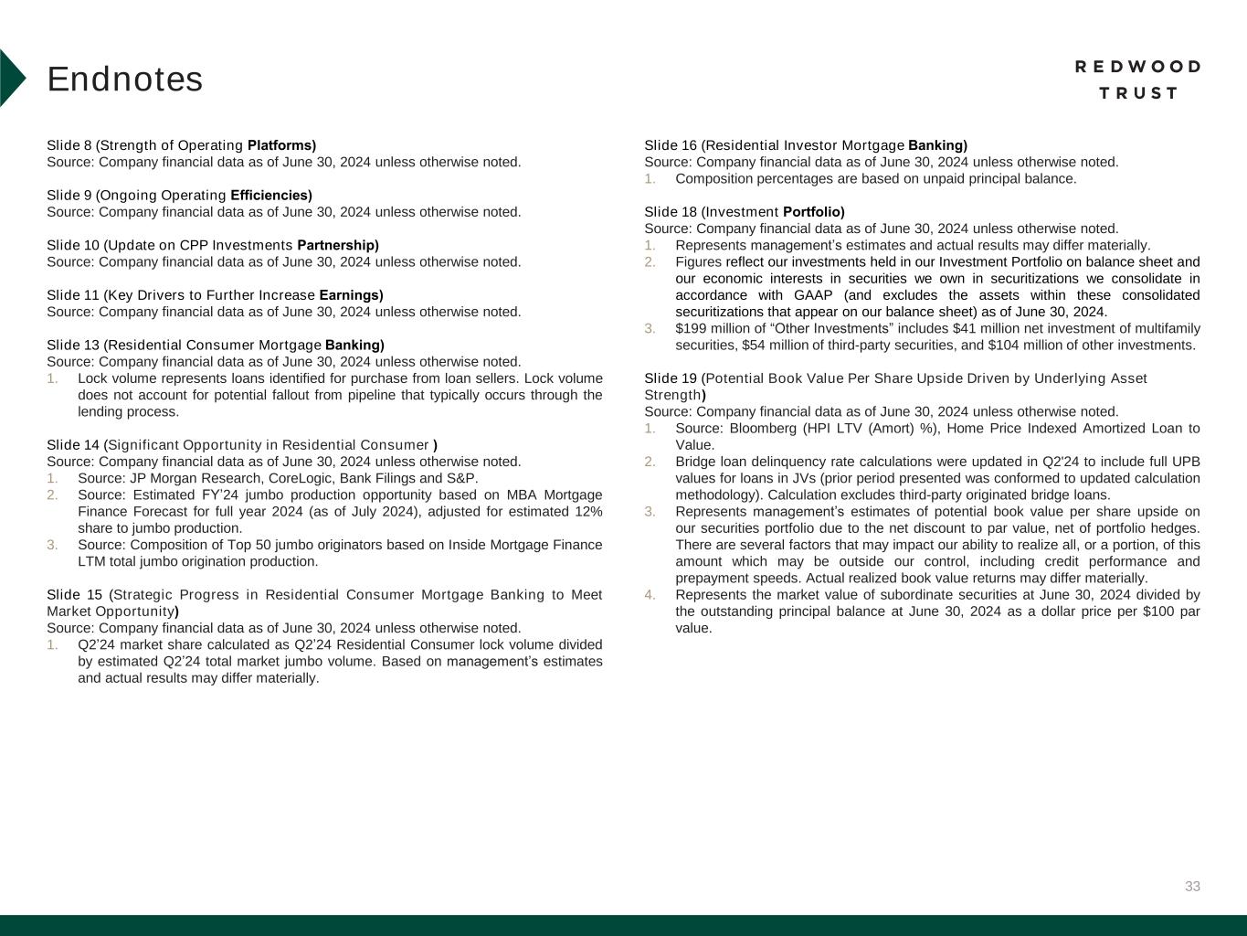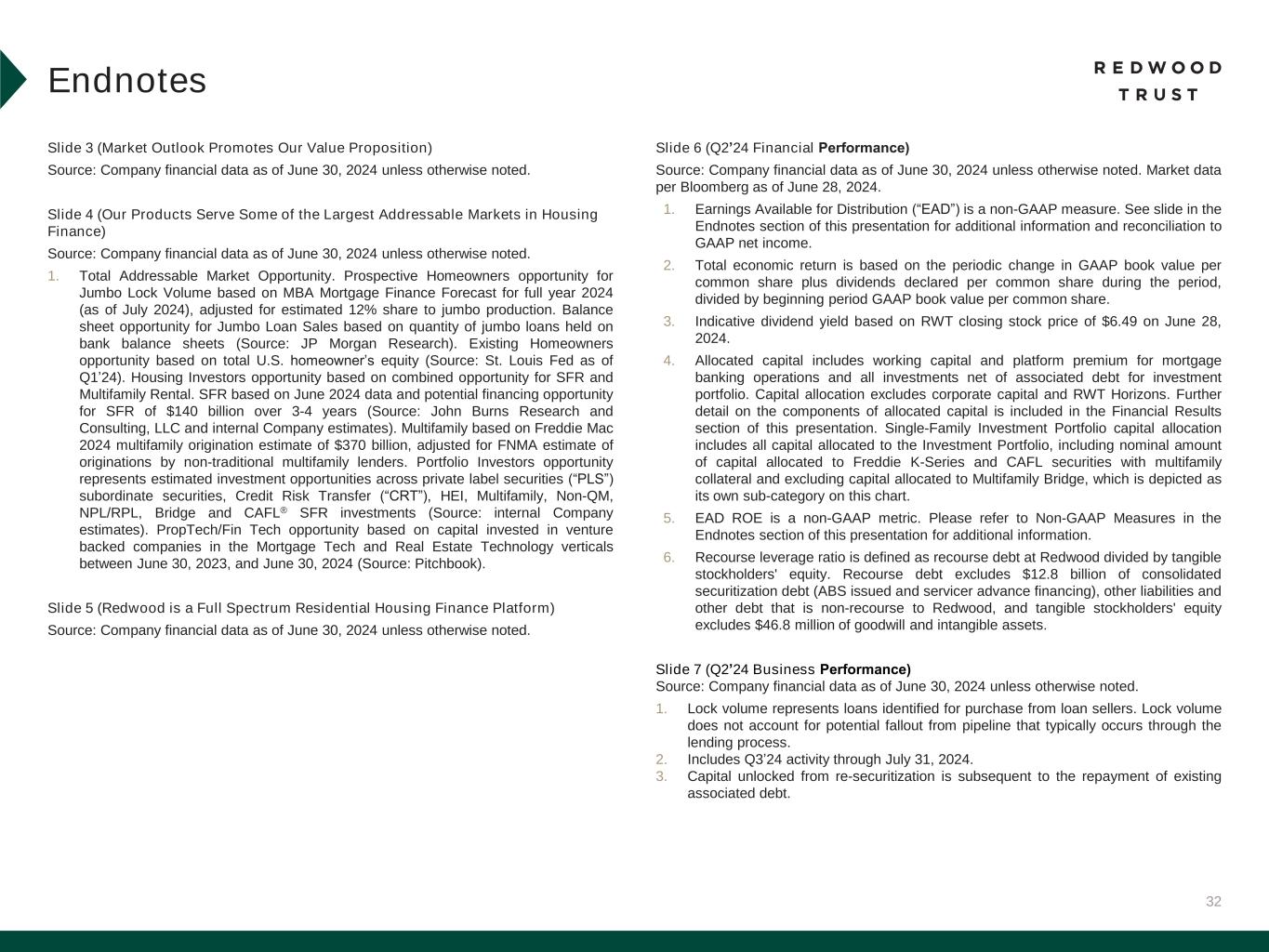 32 Slide 3 (Market Outlook Promotes Our Value Proposition) Source: Company financial data as of June 30, 2024 unless otherwise noted. Slide 4 (Our Products Serve Some of the Largest Addressable Markets in Housing Finance) Source: Company financial data as of June 30, 2024 unless otherwise noted. 1. Total Addressable Market Opportunity. Prospective Homeowners opportunity for Jumbo Lock Volume based on MBA Mortgage Finance Forecast for full year 2024 (as of July 2024), adjusted for estimated 12% share to jumbo production. Balance sheet opportunity for Jumbo Loan Sales based on quantity of jumbo loans held on bank balance sheets (Source: JP Morgan Research). Existing Homeowners opportunity based on total U.S. homeowner’s equity (Source: St. Louis Fed as of Q1’24). Housing Investors opportunity based on combined opportunity for SFR and Multifamily Rental. SFR based on June 2024 data and potential financing opportunity for SFR of $140 billion over 3-4 years (Source: John Burns Research and Consulting, LLC and internal Company estimates). Multifamily based on Freddie Mac 2024 multifamily origination estimate of $370 billion, adjusted for FNMA estimate of originations by non-traditional multifamily lenders. Portfolio Investors opportunity represents estimated investment opportunities across private label securities (“PLS”) subordinate securities, Credit Risk Transfer (“CRT”), HEI, Multifamily, Non-QM, NPL/RPL, Bridge and CAFL® SFR investments (Source: internal Company estimates). PropTech/Fin Tech opportunity based on capital invested in venture backed companies in the Mortgage Tech and Real Estate Technology verticals between June 30, 2023, and June 30, 2024 (Source: Pitchbook). Slide 5 (Redwood is a Full Spectrum Residential Housing Finance Platform) Source: Company financial data as of June 30, 2024 unless otherwise noted. Slide 6 (Q2’24 Financial Performance)​ Source: Company financial data as of June 30, 2024 unless otherwise noted. Market data per Bloomberg as of June 28, 2024. 1. Earnings Available for Distribution (“EAD”) is a non-GAAP measure. See slide in the Endnotes section of this presentation for additional information and reconciliation to GAAP net income. 2. Total economic return is based on the periodic change in GAAP book value per common share plus dividends declared per common share during the period, divided by beginning period GAAP book value per common share. 3. Indicative dividend yield based on RWT closing stock price of $6.49 on June 28, 2024. 4. Allocated capital includes working capital and platform premium for mortgage banking operations and all investments net of associated debt for investment portfolio. Capital allocation excludes corporate capital and RWT Horizons. Further detail on the components of allocated capital is included in the Financial Results section of this presentation. Single-Family Investment Portfolio capital allocation includes all capital allocated to the Investment Portfolio, including nominal amount of capital allocated to Freddie K-Series and CAFL securities with multifamily collateral and excluding capital allocated to Multifamily Bridge, which is depicted as its own sub-category on this chart. 5. EAD ROE is a non-GAAP metric. Please refer to Non-GAAP Measures in the Endnotes section of this presentation for additional information. 6. Recourse leverage ratio is defined as recourse debt at Redwood divided by tangible stockholders' equity. Recourse debt excludes $12.8 billion of consolidated securitization debt (ABS issued and servicer advance financing), other liabilities and other debt that is non-recourse to Redwood, and tangible stockholders' equity excludes $46.8 million of goodwill and intangible assets. Slide 7 (Q2’24 Business Performance)​ Source: Company financial data as of June 30, 2024 unless otherwise noted. 1. Lock volume represents loans identified for purchase from loan sellers. Lock volume does not account for potential fallout from pipeline that typically occurs through the lending process. 2. Includes Q3’24 activity through July 31, 2024. 3. Capital unlocked from re-securitization is subsequent to the repayment of existing associated debt. Endnotes