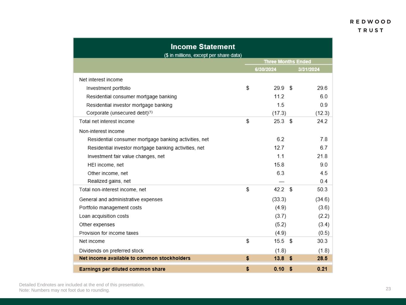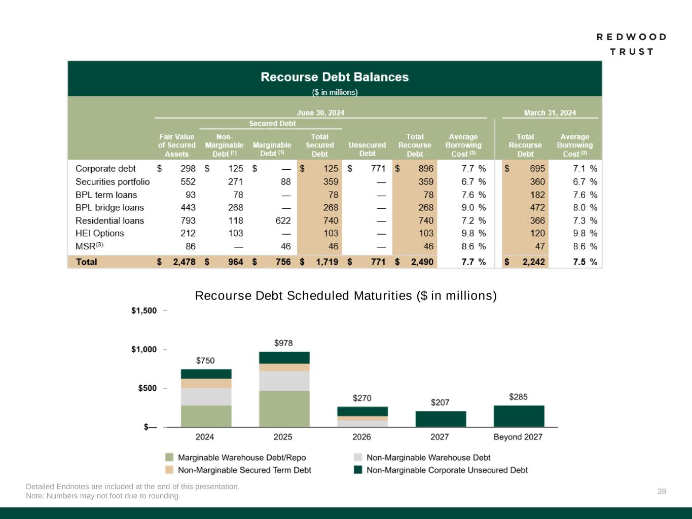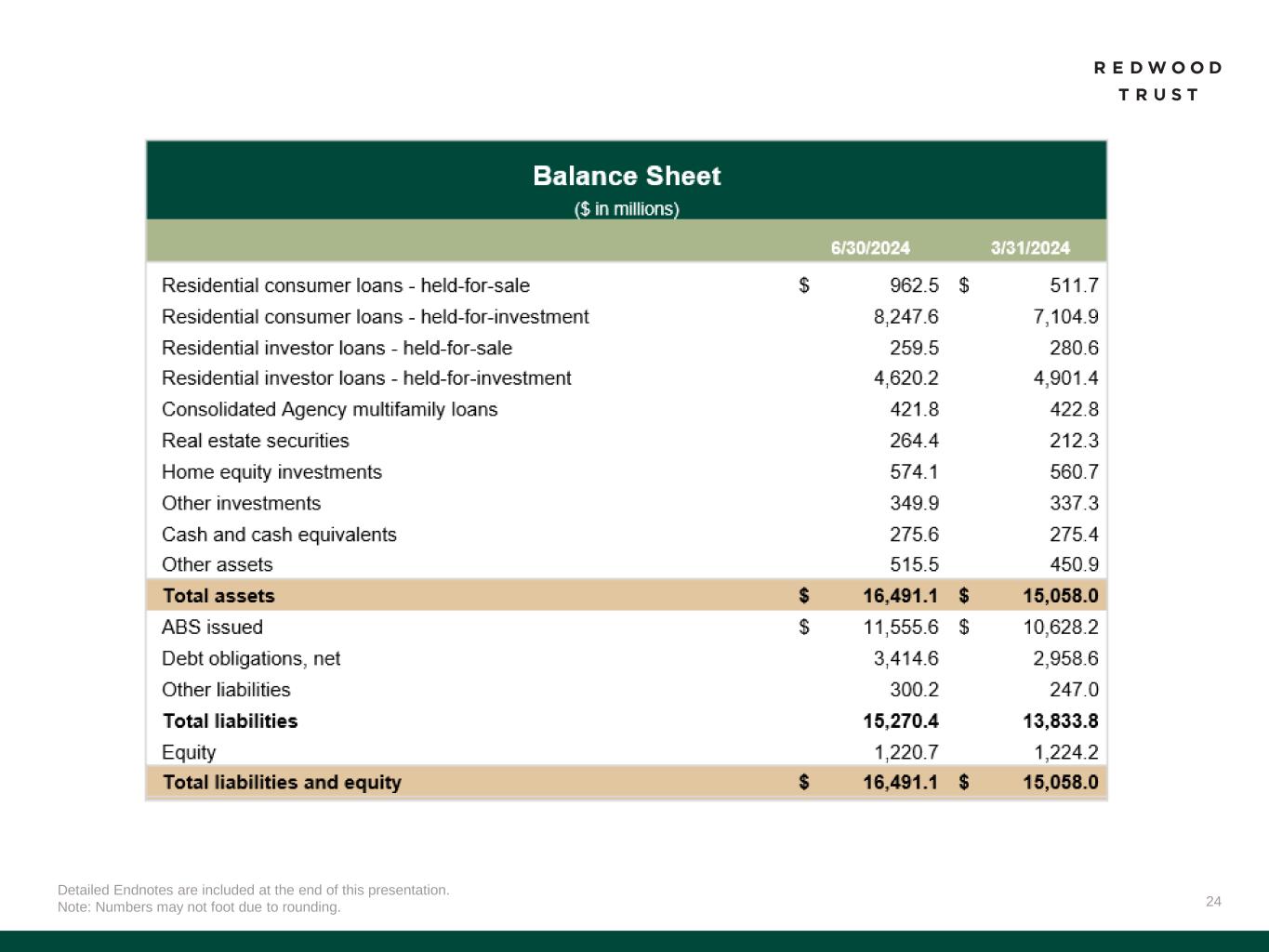 32 Slide 3 (Market Outlook Promotes Our Value Proposition) Source: Company financial data as of June 30, 2024 unless otherwise noted. Slide 4 (Our Products Serve Some of the Largest Addressable Markets in Housing Finance) Source: Company financial data as of June 30, 2024 unless otherwise noted. 1. Total Addressable Market Opportunity. Prospective Homeowners opportunity for Jumbo Lock Volume based on MBA Mortgage Finance Forecast for full year 2024 (as of July 2024), adjusted for estimated 12% share to jumbo production. Balance sheet opportunity for Jumbo Loan Sales based on quantity of jumbo loans held on bank balance sheets (Source: JP Morgan Research). Existing Homeowners opportunity based on total U.S. homeowner’s equity (Source: St. Louis Fed as of Q1’24). Housing Investors opportunity based on combined opportunity for SFR and Multifamily Rental. SFR based on June 2024 data and potential financing opportunity for SFR of $140 billion over 3-4 years (Source: John Burns Research and Consulting, LLC and internal Company estimates). Multifamily based on Freddie Mac 2024 multifamily origination estimate of $370 billion, adjusted for FNMA estimate of originations by non-traditional multifamily lenders. Portfolio Investors opportunity represents estimated investment opportunities across private label securities (“PLS”) subordinate securities, Credit Risk Transfer (“CRT”), HEI, Multifamily, Non-QM, NPL/RPL, Bridge and CAFL® SFR investments (Source: internal Company estimates). PropTech/Fin Tech opportunity based on capital invested in venture backed companies in the Mortgage Tech and Real Estate Technology verticals between June 30, 2023, and June 30, 2024 (Source: Pitchbook). Slide 5 (Redwood is a Full Spectrum Residential Housing Finance Platform) Source: Company financial data as of June 30, 2024 unless otherwise noted. Slide 6 (Q2’24 Financial Performance)​ Source: Company financial data as of June 30, 2024 unless otherwise noted. Market data per Bloomberg as of June 28, 2024. 1. Earnings Available for Distribution (“EAD”) is a non-GAAP measure. See slide in the Endnotes section of this presentation for additional information and reconciliation to GAAP net income. 2. Total economic return is based on the periodic change in GAAP book value per common share plus dividends declared per common share during the period, divided by beginning period GAAP book value per common share. 3. Indicative dividend yield based on RWT closing stock price of $6.49 on June 28, 2024. 4. Allocated capital includes working capital and platform premium for mortgage banking operations and all investments net of associated debt for investment portfolio. Capital allocation excludes corporate capital and RWT Horizons. Further detail on the components of allocated capital is included in the Financial Results section of this presentation. Single-Family Investment Portfolio capital allocation includes all capital allocated to the Investment Portfolio, including nominal amount of capital allocated to Freddie K-Series and CAFL securities with multifamily collateral and excluding capital allocated to Multifamily Bridge, which is depicted as its own sub-category on this chart. 5. EAD ROE is a non-GAAP metric. Please refer to Non-GAAP Measures in the Endnotes section of this presentation for additional information. 6. Recourse leverage ratio is defined as recourse debt at Redwood divided by tangible stockholders' equity. Recourse debt excludes $12.8 billion of consolidated securitization debt (ABS issued and servicer advance financing), other liabilities and other debt that is non-recourse to Redwood, and tangible stockholders' equity excludes $46.8 million of goodwill and intangible assets. Slide 7 (Q2’24 Business Performance)​ Source: Company financial data as of June 30, 2024 unless otherwise noted. 1. Lock volume represents loans identified for purchase from loan sellers. Lock volume does not account for potential fallout from pipeline that typically occurs through the lending process. 2. Includes Q3’24 activity through July 31, 2024. 3. Capital unlocked from re-securitization is subsequent to the repayment of existing associated debt. Endnotes