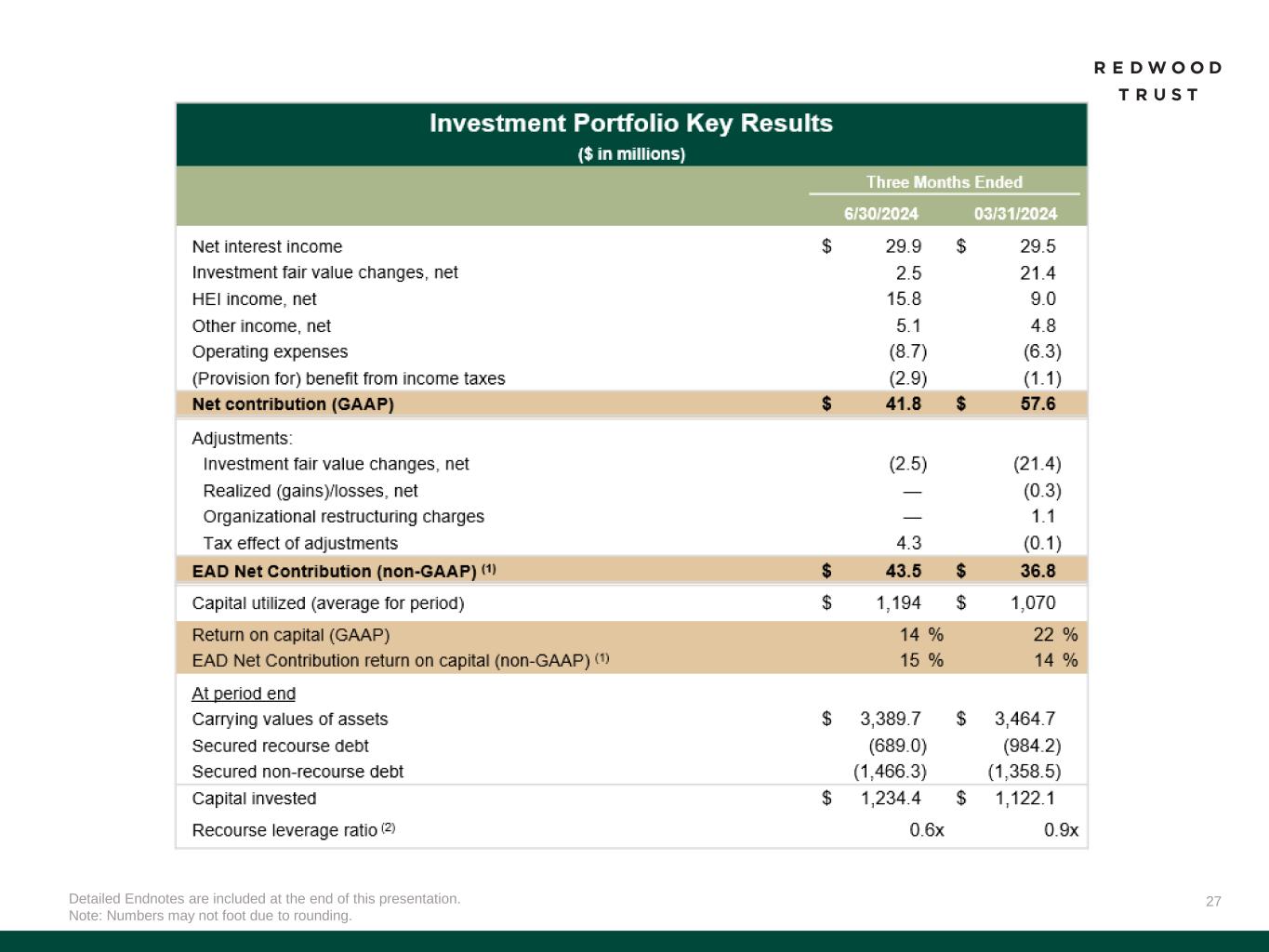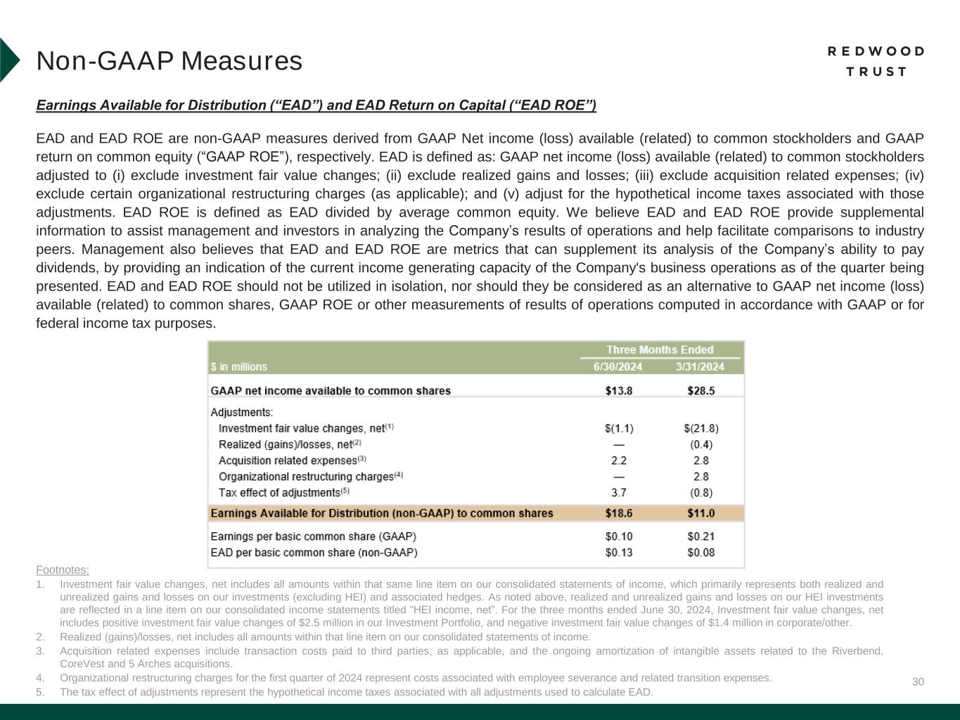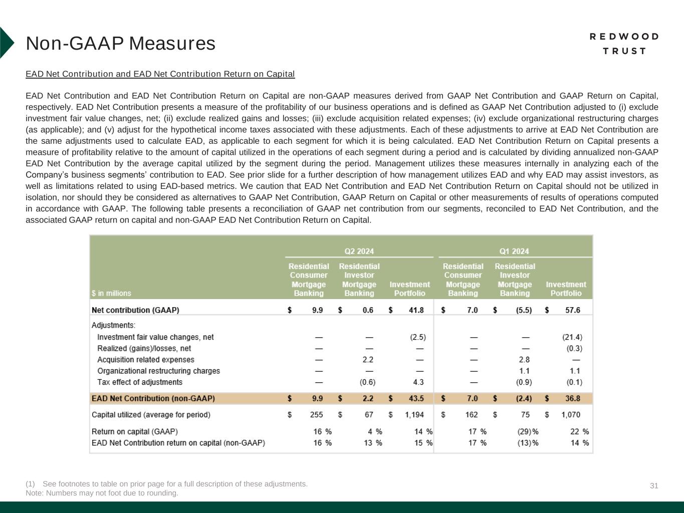 30 Earnings Available for Distribution (“EAD”) and EAD Return on Capital (“EAD ROE”) EAD and EAD ROE are non-GAAP measures derived from GAAP Net income (loss) available (related) to common stockholders and GAAP return on common equity (“GAAP ROE”), respectively. EAD is defined as: GAAP net income (loss) available (related) to common stockholders adjusted to (i) exclude investment fair value changes; (ii) exclude realized gains and losses; (iii) exclude acquisition related expenses; (iv) exclude certain organizational restructuring charges (as applicable); and (v) adjust for the hypothetical income taxes associated with those adjustments. EAD ROE is defined as EAD divided by average common equity. We believe EAD and EAD ROE provide supplemental information to assist management and investors in analyzing the Company’s results of operations and help facilitate comparisons to industry peers. Management also believes that EAD and EAD ROE are metrics that can supplement its analysis of the Company’s ability to pay dividends, by providing an indication of the current income generating capacity of the Company's business operations as of the quarter being presented. EAD and EAD ROE should not be utilized in isolation, nor should they be considered as an alternative to GAAP net income (loss) available (related) to common shares, GAAP ROE or other measurements of results of operations computed in accordance with GAAP or for federal income tax purposes. Footnotes: 1. Investment fair value changes, net includes all amounts within that same line item on our consolidated statements of income, which primarily represents both realized and unrealized gains and losses on our investments (excluding HEI) and associated hedges. As noted above, realized and unrealized gains and losses on our HEI investments are reflected in a line item on our consolidated income statements titled “HEI income, net”. For the three months ended June 30, 2024, Investment fair value changes, net includes positive investment fair value changes of $2.5 million in our Investment Portfolio, and negative investment fair value changes of $1.4 million in corporate/other. 2. Realized (gains)/losses, net includes all amounts within that line item on our consolidated statements of income. 3. Acquisition related expenses include transaction costs paid to third parties, as applicable, and the ongoing amortization of intangible assets related to the Riverbend, CoreVest and 5 Arches acquisitions. 4. Organizational restructuring charges for the first quarter of 2024 represent costs associated with employee severance and related transition expenses. 5. The tax effect of adjustments represent the hypothetical income taxes associated with all adjustments used to calculate EAD. Non-GAAP Measures