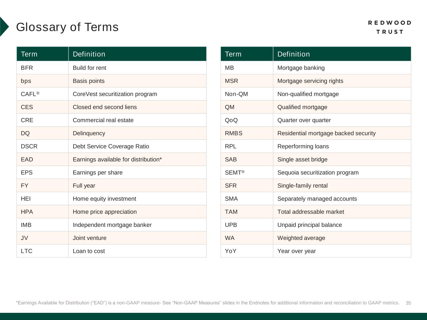 35*Earnings Available for Distribution (“EAD”) is a non-GAAP measure- See “Non-GAAP Measures” slides in the Endnotes for additional information and reconciliation to GAAP metrics. Glossary of Terms Term Definition BFR Build for rent bps Basis points CAFL® CoreVest securitization program CES Closed end second liens CRE Commercial real estate DQ Delinquency DSCR Debt Service Coverage Ratio EAD Earnings available for distribution* EPS Earnings per share FY Full year HEI Home equity investment HPA Home price appreciation IMB Independent mortgage banker JV Joint venture LTC Loan to cost Term Definition MB Mortgage banking MSR Mortgage servicing rights Non-QM Non-qualified mortgage QM Qualified mortgage QoQ Quarter over quarter RMBS Residential mortgage backed security RPL Reperforming loans SAB Single asset bridge SEMT® Sequoia securitization program SFR Single-family rental SMA Separately managed accounts TAM Total addressable market UPB Unpaid principal balance WA Weighted average YoY Year over year