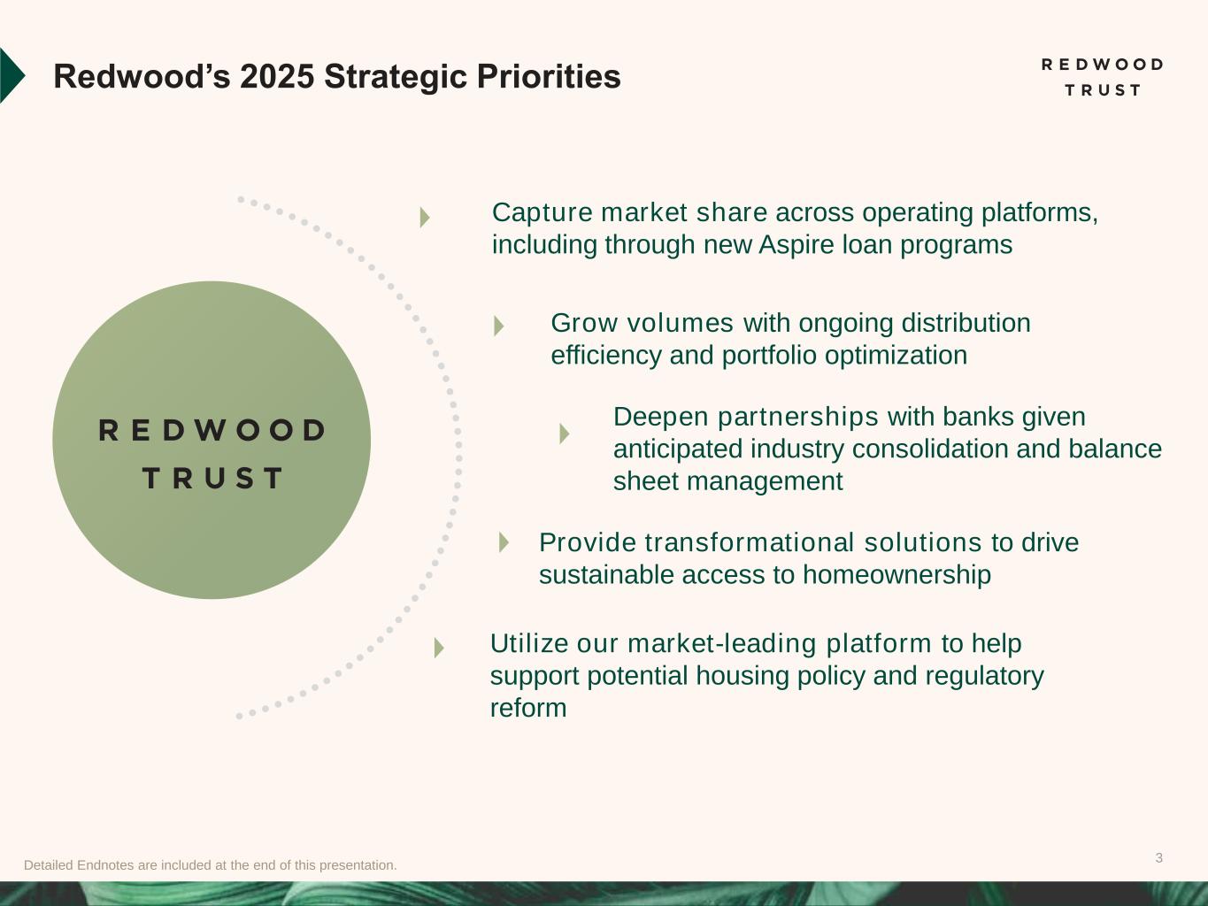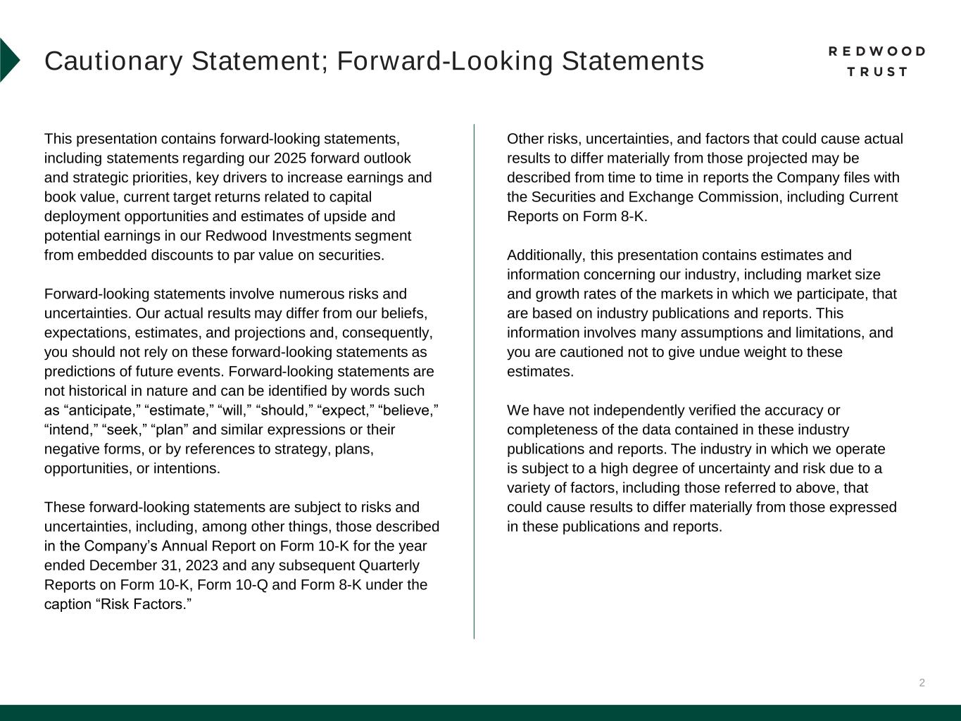 2 This presentation contains forward-looking statements, including statements regarding our 2025 forward outlook and strategic priorities, key drivers to increase earnings and book value, current target returns related to capital deployment opportunities and estimates of upside and potential earnings in our Redwood Investments segment from embedded discounts to par value on securities. Forward-looking statements involve numerous risks and uncertainties. Our actual results may differ from our beliefs, expectations, estimates, and projections and, consequently, you should not rely on these forward-looking statements as predictions of future events. Forward-looking statements are not historical in nature and can be identified by words such as “anticipate,” “estimate,” “will,” “should,” “expect,” “believe,” “intend,” “seek,” “plan” and similar expressions or their negative forms, or by references to strategy, plans, opportunities, or intentions. These forward-looking statements are subject to risks and uncertainties, including, among other things, those described in the Company’s Annual Report on Form 10-K for the year ended December 31, 2023 and any subsequent Quarterly Reports on Form 10-K, Form 10-Q and Form 8-K under the caption “Risk Factors.” Cautionary Statement; Forward-Looking Statements Other risks, uncertainties, and factors that could cause actual results to differ materially from those projected may be described from time to time in reports the Company files with the Securities and Exchange Commission, including Current Reports on Form 8-K. Additionally, this presentation contains estimates and information concerning our industry, including market size and growth rates of the markets in which we participate, that are based on industry publications and reports. This information involves many assumptions and limitations, and you are cautioned not to give undue weight to these estimates. We have not independently verified the accuracy or completeness of the data contained in these industry publications and reports. The industry in which we operate is subject to a high degree of uncertainty and risk due to a variety of factors, including those referred to above, that could cause results to differ materially from those expressed in these publications and reports.
