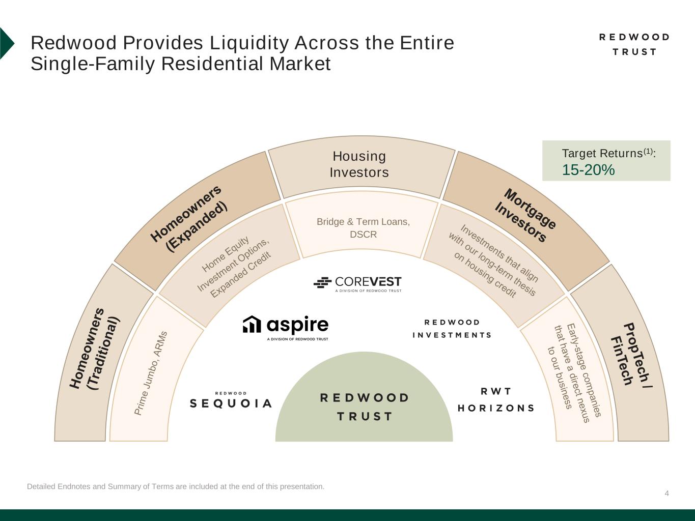 3 Detailed Endnotes are included at the end of this presentation. Redwood’s 2025 Strategic Priorities Provide transformational solutions to drive sustainable access to homeownership Utilize our market-leading platform to help support potential housing policy and regulatory reform Deepen partnerships with banks given anticipated industry consolidation and balance sheet management Grow volumes with ongoing distribution efficiency and portfolio optimization Capture market share across operating platforms, including through new Aspire loan programs