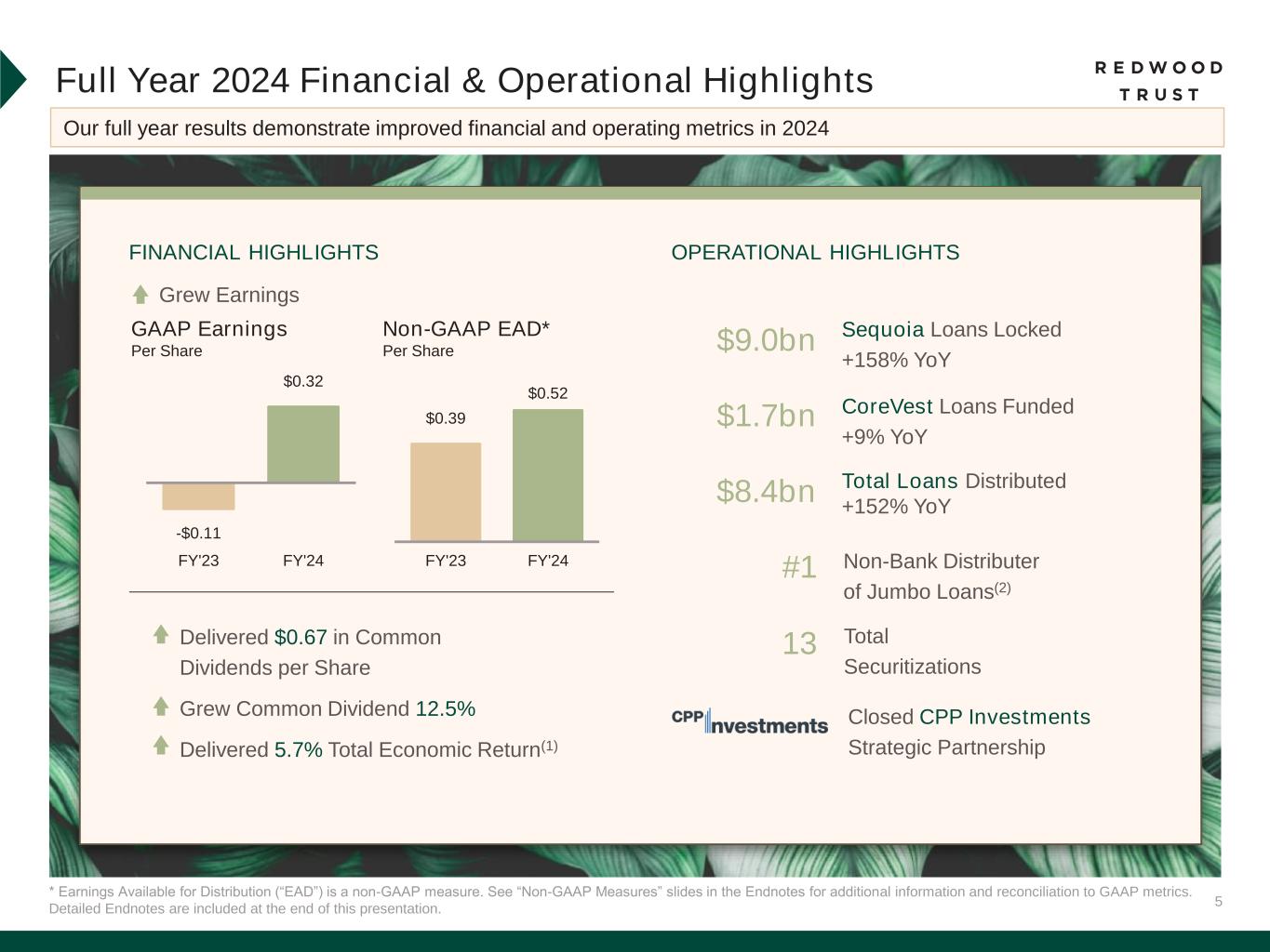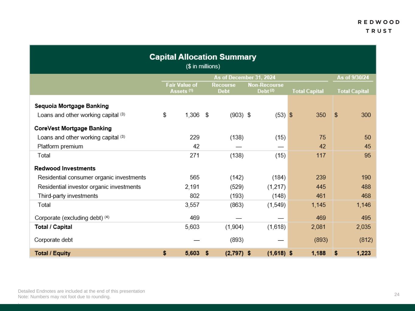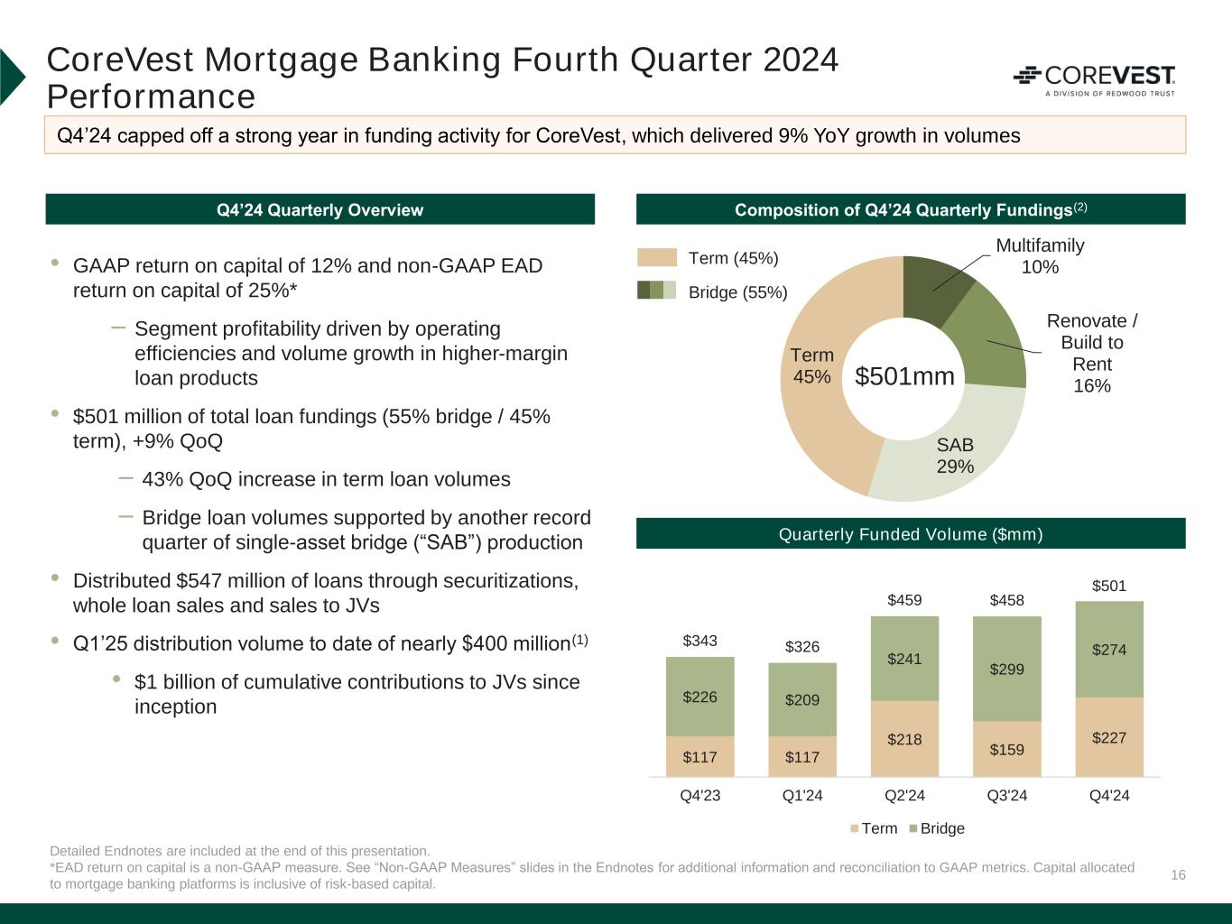 14 113 48 FY'23 FY'24 Detailed Endnotes are included at the end of this presentation. *EAD return on capital is a non-GAAP measure. See “Non-GAAP Measures” slides in the Endnotes for additional information and reconciliation to GAAP metrics. Operating Businesses: Increased Efficiency & Profitability We have strengthened our operations, improving our efficiency metrics and supporting higher returns for shareholders Optimized Use of Capital(2)Increased Efficiency(1) Cost Per Loan Our operating platforms demonstrated improvements in efficiency in 2024 We were successful in 2024 achieving higher volumes while utilizing less capital 0.71% 0.29% FY'23 FY'24 Capital Efficiency (Days Loans Held on Balance Sheet) Return on Capital(3) 10% 22% FY'23 FY'24 GAAP ROC Increased efficiencies resulted in greater profitability S e q u o ia Capital Efficiency (Average Capital) 1.57% 1.14% FY'23 FY'24 Net Cost to Originate $92 $61 FY'23 FY'24 -3% 17% FY'23 FY'24 Non-GAAP EAD ROC* C o re V e s t 59% improvement 34% Improvement 58% improvement 28% improvement