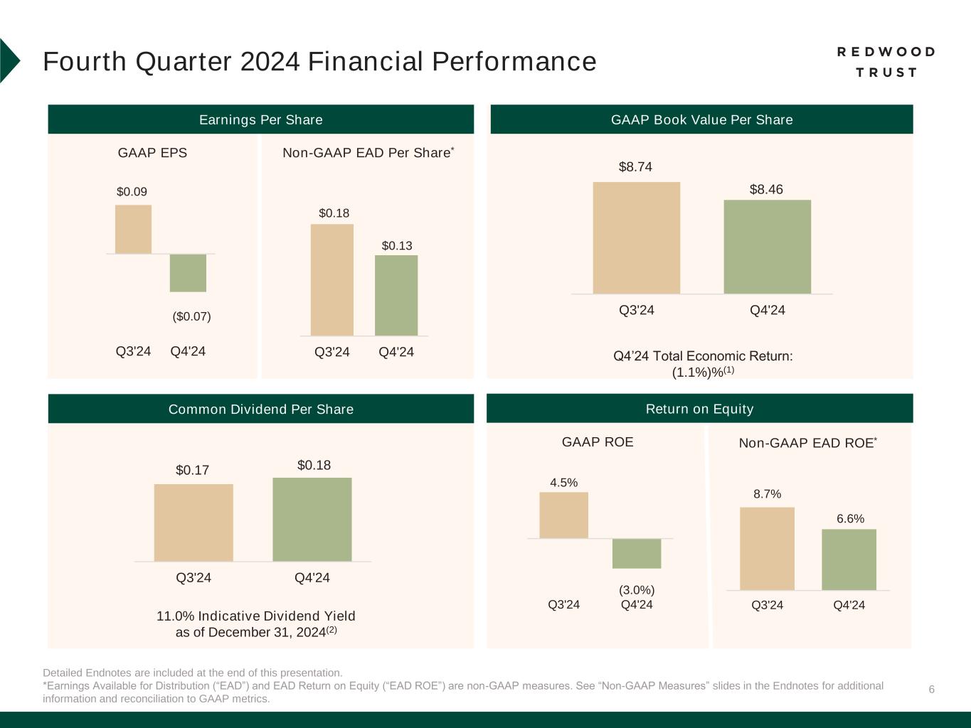 5 * Earnings Available for Distribution (“EAD”) is a non-GAAP measure. See “Non-GAAP Measures” slides in the Endnotes for additional information and reconciliation to GAAP metrics. Detailed Endnotes are included at the end of this presentation. Full Year 2024 Financial & Operational Highlights Our full year results demonstrate improved financial and operating metrics in 2024 FINANCIAL HIGHLIGHTS GAAP Earnings Per Share Non-GAAP EAD* Per Share -$0.11 $0.32 FY'23 FY'24 $0.39 $0.52 FY'23 FY'24 Delivered $0.67 in Common Dividends per Share Grew Common Dividend 12.5% Delivered 5.7% Total Economic Return(1) $9.0bn Sequoia Loans Locked +158% YoY $1.7bn CoreVest Loans Funded +9% YoY $8.4bn Total Loans Distributed +152% YoY #1 Non-Bank Distributer of Jumbo Loans(2) 13 Total Securitizations Closed CPP Investments Strategic Partnership OPERATIONAL HIGHLIGHTS Grew Earnings
