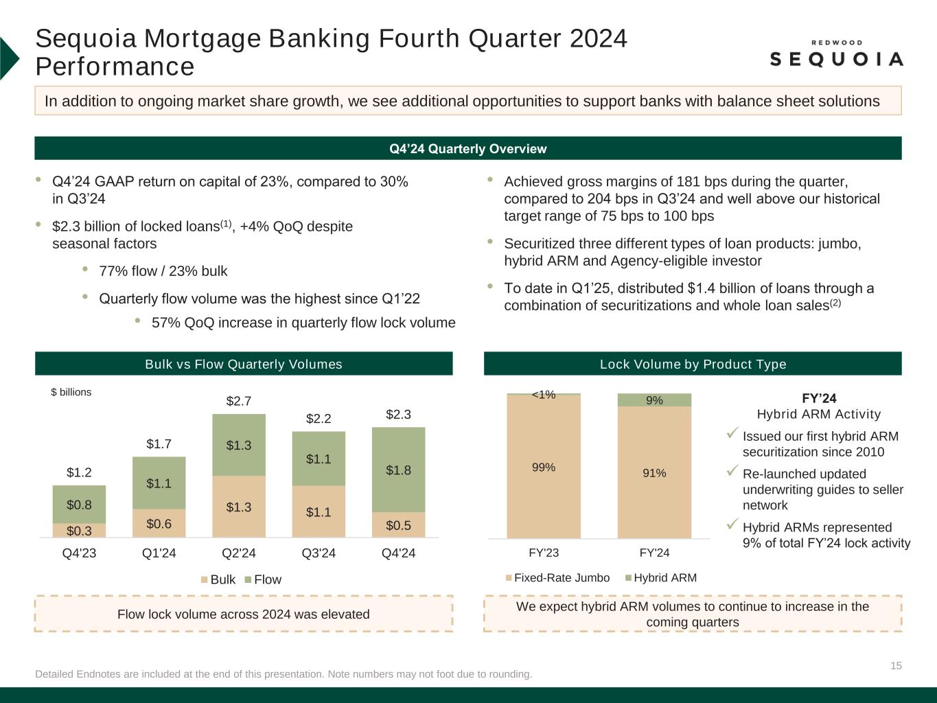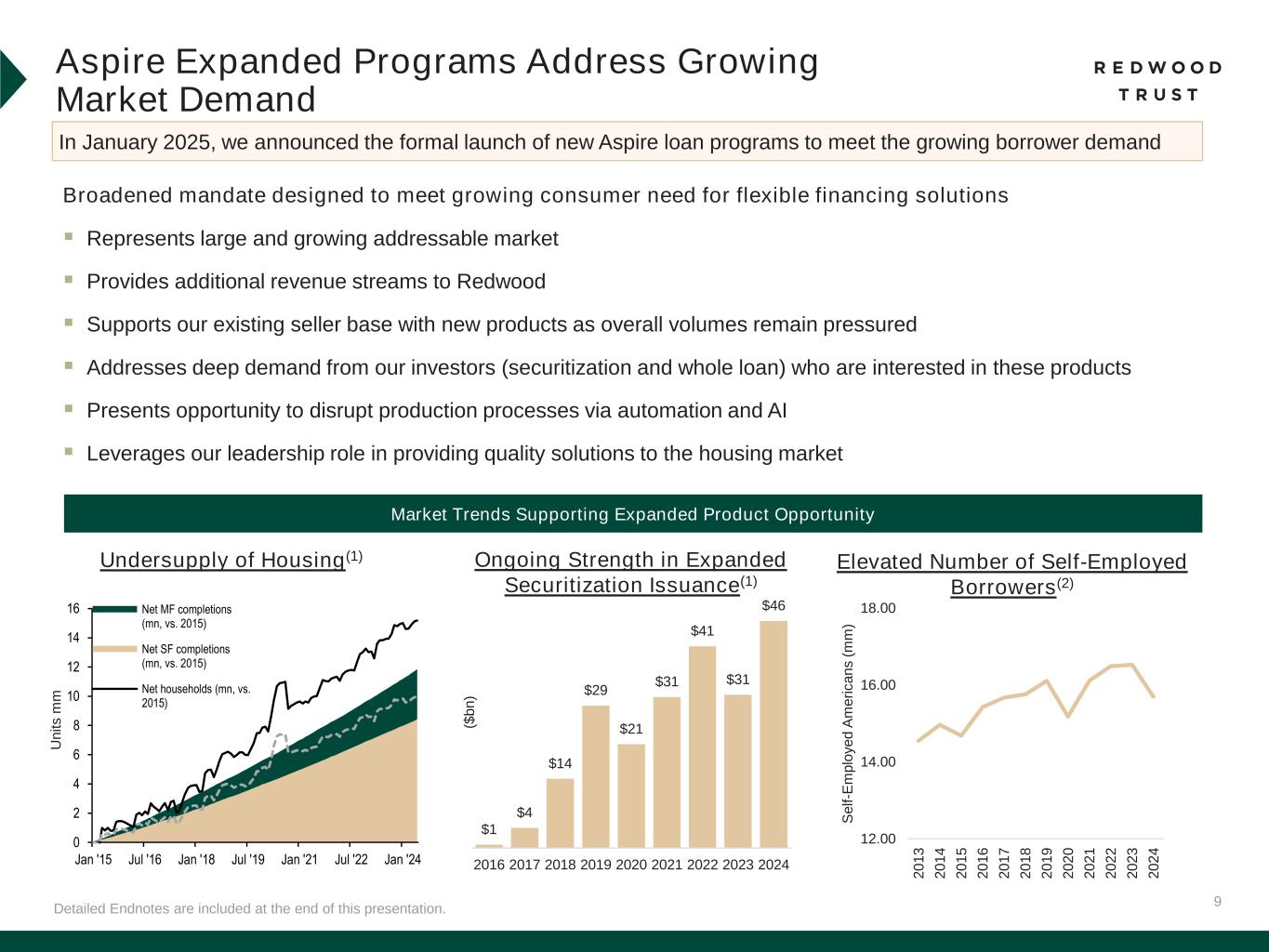 8Detailed Endnotes are included at the end of this presentation. Fourth Quarter 2024 & Recent Business Performance Financing & Capital ▪ At December 31, 2024: ▪ Unrestricted cash and cash equivalents of $245 million ▪ Unencumbered assets of approximately $325 million ▪ Completed an opportunistic $40 million reopening of our 7.75% convertible notes due 2027, effectively extending the overall maturity profile of our convertible debt outstanding ▪ $2.3 billion of lock volume (+4% QoQ)(1) ▪ Lock volume composition: 23% bulk / 77% flow ▪ Quarterly flow volume increased 57% from Q3'24 and was the highest since the first quarter 2022 ▪ Distributed $2.5 billion of collateral through three SEMT securitizations ($1.1 billion) and whole loan sales ($1.4 billion) ▪ $501 million of loan fundings (+9% QoQ) ▪ Funding volume composition: 55% bridge / 45% term ▪ Term loan volume increased by 43% to $227 million, the highest level since mid- 2022 ▪ Distributed $547 million of loans through securitizations, whole loan sales and sales to JVs ▪ Deployed approximately $81 million of capital into accretive internally sourced and third- party investments Q1’25 QTD Activity(2) ▪ Distributed approximately $1.4 billion of Sequoia loans through two securitizations and various whole loan sales(3) ▪ Distributed nearly $400 million of CoreVest loans through whole loan sales and sales to JVs(3) ▪ Formally launched new expanded loan programs through Aspire ▪ Issued $90 million of senior unsecured notes due 2030 (formerly Residential Consumer Mortgage Banking) (formerly Residential Investor Mortgage Banking) (formerly Investment Portfolio)