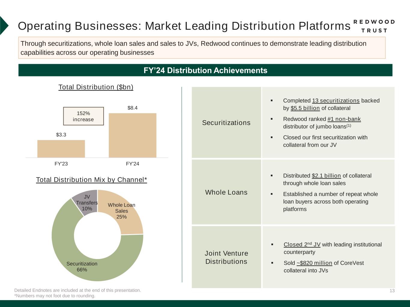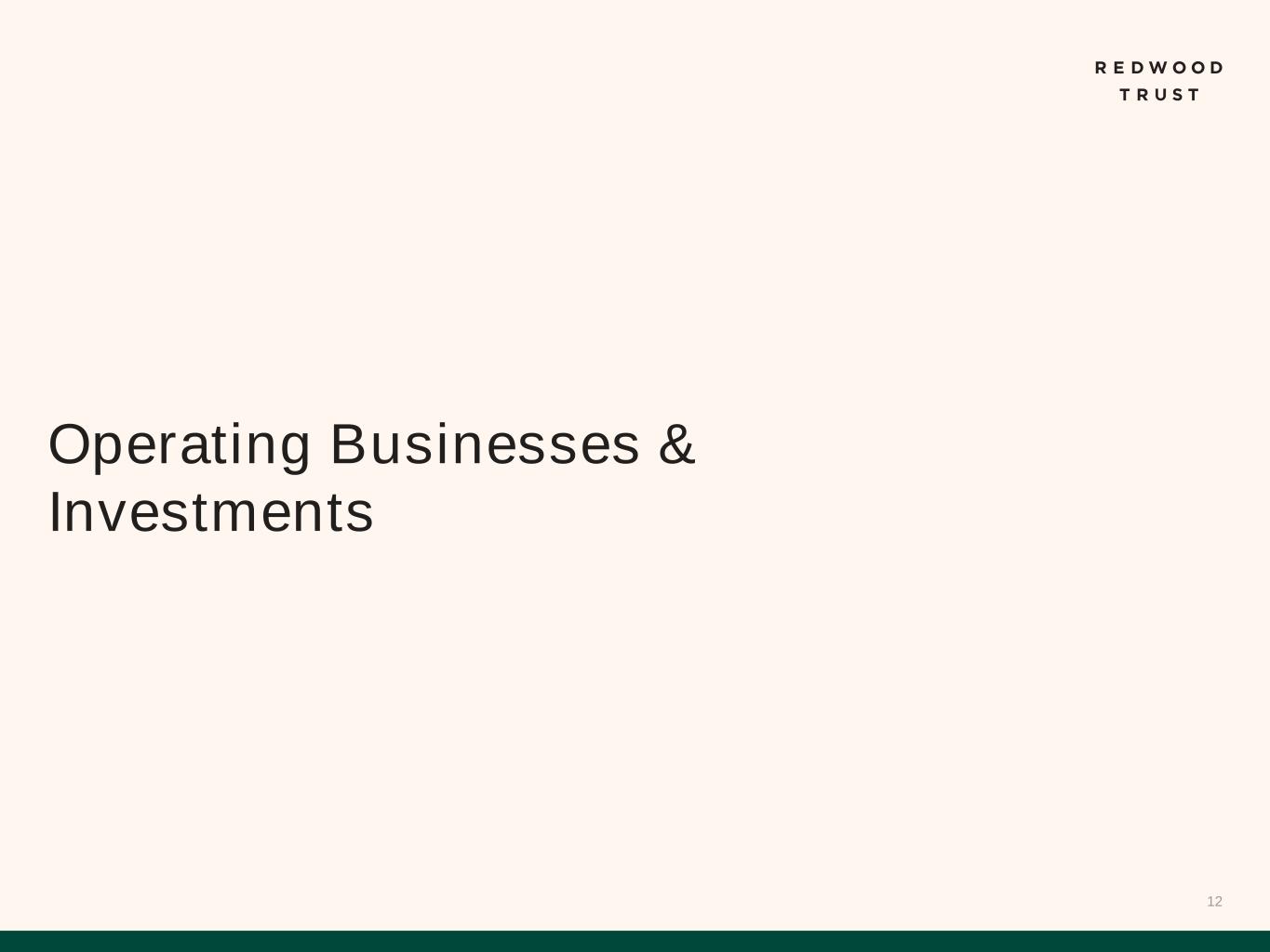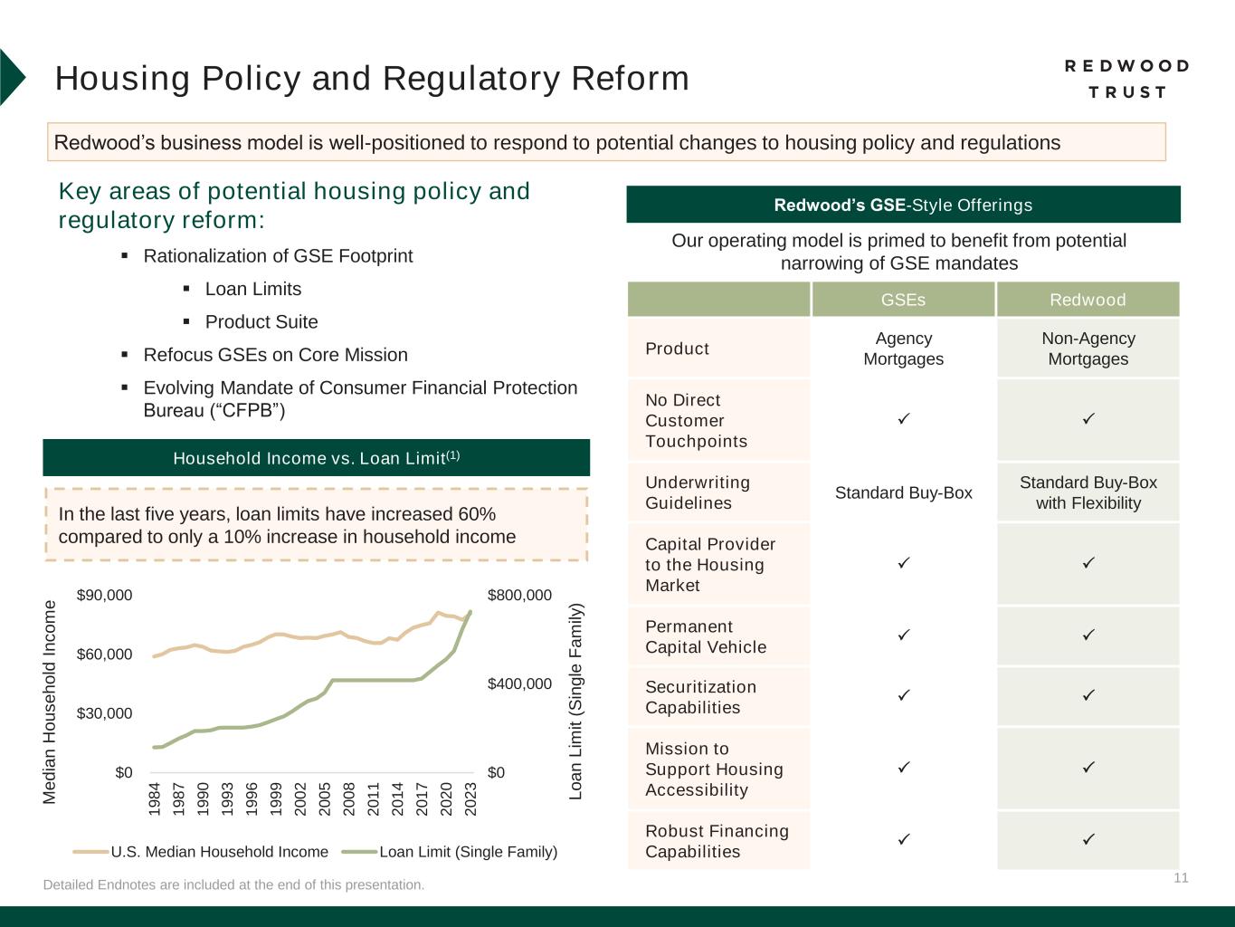 11 Detailed Endnotes are included at the end of this presentation. Housing Policy and Regulatory Reform Redwood’s business model is well-positioned to respond to potential changes to housing policy and regulations $0 $400,000 $800,000 $0 $30,000 $60,000 $90,000 1 9 8 4 1 9 8 7 1 9 9 0 1 9 9 3 1 9 9 6 1 9 9 9 2 0 0 2 2 0 0 5 2 0 0 8 2 0 1 1 2 0 1 4 2 0 1 7 2 0 2 0 2 0 2 3 L o a n L im it ( S in g le F a m ily ) M e d ia n H o u s e h o ld I n c o m e U.S. Median Household Income Loan Limit (Single Family) In the last five years, loan limits have increased 60% compared to only a 10% increase in household income Household Income vs. Loan Limit(1) GSEs Redwood Product Agency Mortgages Non-Agency Mortgages No Direct Customer Touchpoints   Underwriting Guidelines Standard Buy-Box Standard Buy-Box with Flexibility Capital Provider to the Housing Market   Permanent Capital Vehicle   Securitization Capabilities   Mission to Support Housing Accessibility   Robust Financing Capabilities   Redwood’s GSE-Style Offerings Our operating model is primed to benefit from potential narrowing of GSE mandates Key areas of potential housing policy and regulatory reform: ▪ Rationalization of GSE Footprint ▪ Loan Limits ▪ Product Suite ▪ Refocus GSEs on Core Mission ▪ Evolving Mandate of Consumer Financial Protection Bureau (“CFPB”)