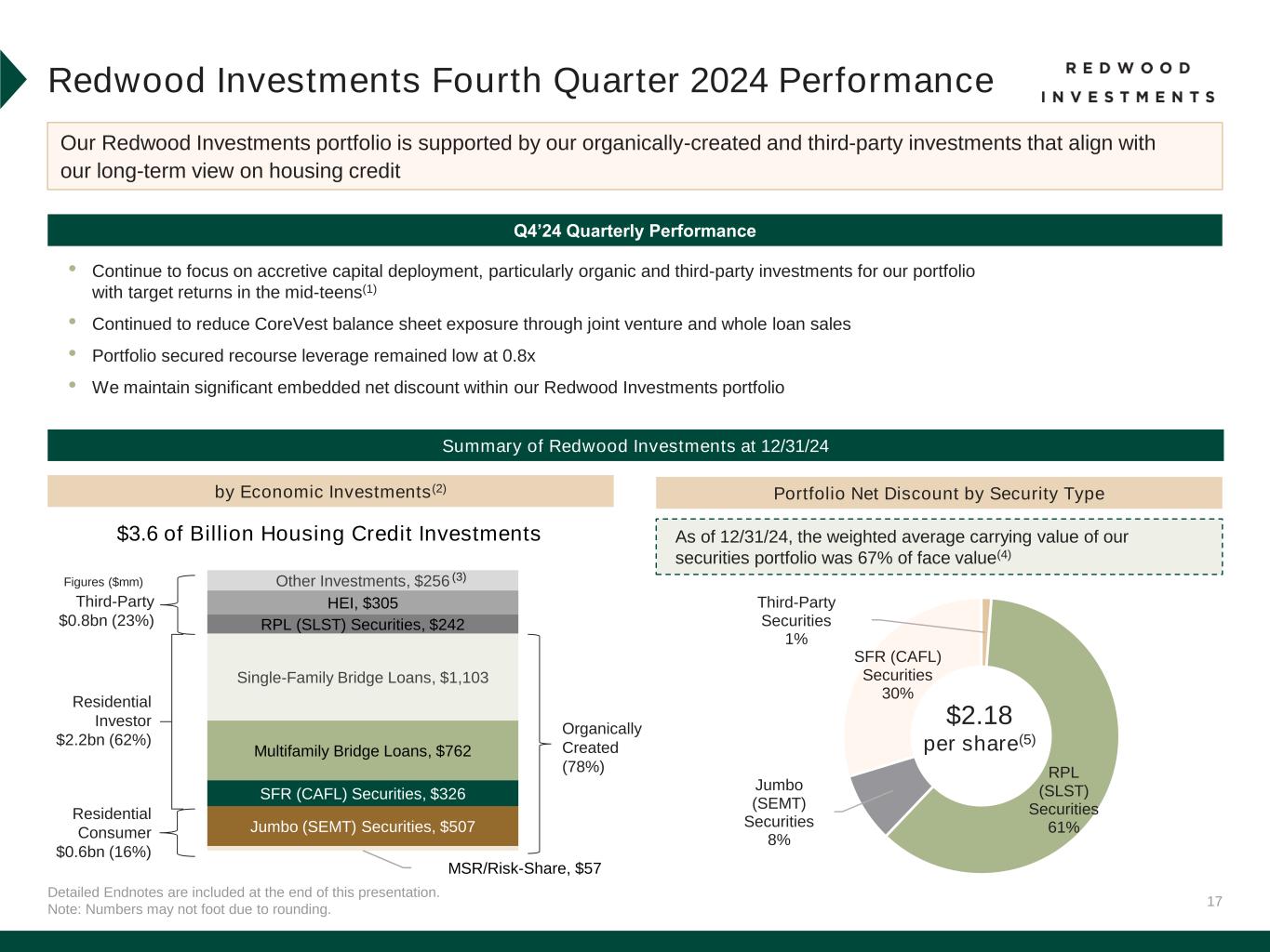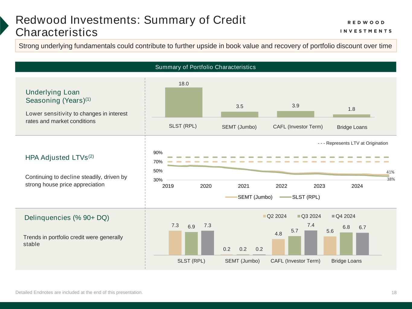 17 Detailed Endnotes are included at the end of this presentation. Note: Numbers may not foot due to rounding. Redwood Investments Fourth Quarter 2024 Performance Our Redwood Investments portfolio is supported by our organically-created and third-party investments that align with our long-term view on housing credit Q4’24 Quarterly Performance $3.6 of Billion Housing Credit Investments Organically Created (78%) $2.18 per share(5) Residential Consumer $0.6bn (16%) Residential Investor $2.2bn (62%) Third-Party $0.8bn (23%) Figures ($mm) Summary of Redwood Investments at 12/31/24 by Economic Investments(2) • Continue to focus on accretive capital deployment, particularly organic and third-party investments for our portfolio with target returns in the mid-teens(1) • Continued to reduce CoreVest balance sheet exposure through joint venture and whole loan sales • Portfolio secured recourse leverage remained low at 0.8x • We maintain significant embedded net discount within our Redwood Investments portfolio As of 12/31/24, the weighted average carrying value of our securities portfolio was 67% of face value(4) Portfolio Net Discount by Security Type MSR/Risk-Share, $57 Jumbo (SEMT) Securities, $507 SFR (CAFL) Securities, $326 Multifamily Bridge Loans, $762 Single-Family Bridge Loans, $1,103 RPL (SLST) Securities, $242 HEI, $305 Other Investments, $256 (3) Third-Party Securities 1% RPL (SLST) Securities 61% Jumbo (SEMT) Securities 8% SFR (CAFL) Securities 30%