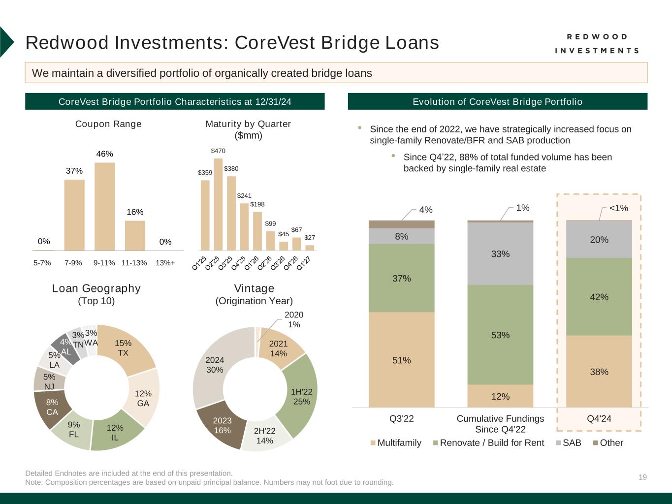 18Detailed Endnotes are included at the end of this presentation. Redwood Investments: Summary of Credit Characteristics Underlying Loan Seasoning (Years)(1) Delinquencies (% 90+ DQ) Summary of Portfolio Characteristics SLST (RPL) SEMT (Jumbo) CAFL (Investor Term) Bridge Loans - - - Represents LTV at Origination SLST (RPL) SEMT (Jumbo) CAFL (Investor Term) Bridge Loans 18.0 3.5 3.9 1.8 7.3 0.2 4.8 5.6 6.9 0.2 5.7 6.87.3 0.2 7.4 6.7 Q2 2024 Q3 2024 Q4 2024 Lower sensitivity to changes in interest rates and market conditions HPA Adjusted LTVs(2) Continuing to decline steadily, driven by strong house price appreciation Trends in portfolio credit were generally stable Strong underlying fundamentals could contribute to further upside in book value and recovery of portfolio discount over time 41% 38%30% 50% 70% 90% 2019 2020 2021 2022 2023 2024 SEMT (Jumbo) SLST (RPL)