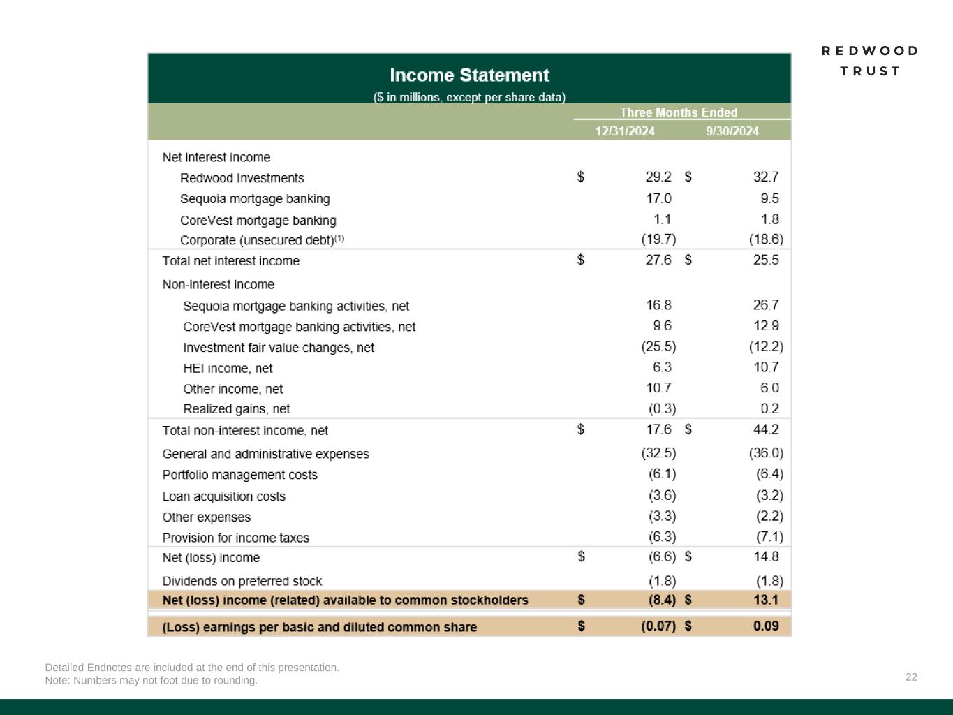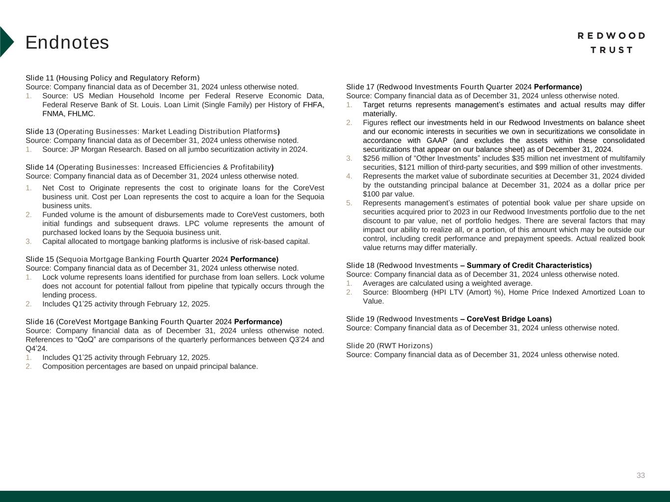 33 Slide 11 (Housing Policy and Regulatory Reform) Source: Company financial data as of December 31, 2024 unless otherwise noted. 1. Source: US Median Household Income per Federal Reserve Economic Data, Federal Reserve Bank of St. Louis. Loan Limit (Single Family) per History of FHFA, FNMA, FHLMC. Slide 13 (Operating Businesses: Market Leading Distribution Platforms)​ Source: Company financial data as of December 31, 2024 unless otherwise noted. 1. Source: JP Morgan Research. Based on all jumbo securitization activity in 2024. Slide 14 (Operating Businesses: Increased Efficiencies & Profitability)​ Source: Company financial data as of December 31, 2024 unless otherwise noted. 1. Net Cost to Originate represents the cost to originate loans for the CoreVest business unit. Cost per Loan represents the cost to acquire a loan for the Sequoia business units. 2. Funded volume is the amount of disbursements made to CoreVest customers, both initial fundings and subsequent draws. LPC volume represents the amount of purchased locked loans by the Sequoia business unit. 3. Capital allocated to mortgage banking platforms is inclusive of risk-based capital. Slide 15 (Sequoia Mortgage Banking Fourth Quarter 2024 Performance)​ Source: Company financial data as of December 31, 2024 unless otherwise noted. 1. Lock volume represents loans identified for purchase from loan sellers. Lock volume does not account for potential fallout from pipeline that typically occurs through the lending process. 2. Includes Q1’25 activity through February 12, 2025. Slide 16 (CoreVest Mortgage Banking Fourth Quarter 2024 Performance)​ Source: Company financial data as of December 31, 2024 unless otherwise noted. References to “QoQ” are comparisons of the quarterly performances between Q3’24 and Q4’24. 1. Includes Q1’25 activity through February 12, 2025. 2. Composition percentages are based on unpaid principal balance. Slide 17 (Redwood Investments Fourth Quarter 2024 Performance)​ Source: Company financial data as of December 31, 2024 unless otherwise noted. 1. Target returns represents management’s estimates and actual results may differ materially. 2. Figures reflect our investments held in our Redwood Investments on balance sheet and our economic interests in securities we own in securitizations we consolidate in accordance with GAAP (and excludes the assets within these consolidated securitizations that appear on our balance sheet) as of December 31, 2024. 3. $256 million of “Other Investments” includes $35 million net investment of multifamily securities, $121 million of third-party securities, and $99 million of other investments. 4. Represents the market value of subordinate securities at December 31, 2024 divided by the outstanding principal balance at December 31, 2024 as a dollar price per $100 par value. 5. Represents management’s estimates of potential book value per share upside on securities acquired prior to 2023 in our Redwood Investments portfolio due to the net discount to par value, net of portfolio hedges. There are several factors that may impact our ability to realize all, or a portion, of this amount which may be outside our control, including credit performance and prepayment speeds. Actual realized book value returns may differ materially. Slide 18 (Redwood Investments – Summary of Credit Characteristics)​ Source: Company financial data as of December 31, 2024 unless otherwise noted. 1. Averages are calculated using a weighted average. 2. Source: Bloomberg (HPI LTV (Amort) %), Home Price Indexed Amortized Loan to Value. Slide 19 (Redwood Investments – CoreVest Bridge Loans)​ Source: Company financial data as of December 31, 2024 unless otherwise noted. Slide 20 (RWT Horizons) Source: Company financial data as of December 31, 2024 unless otherwise noted. Endnotes