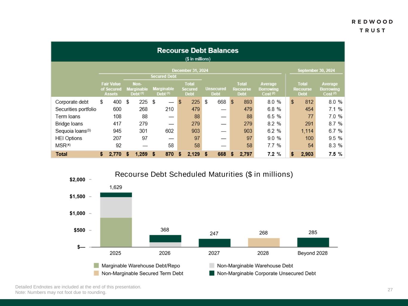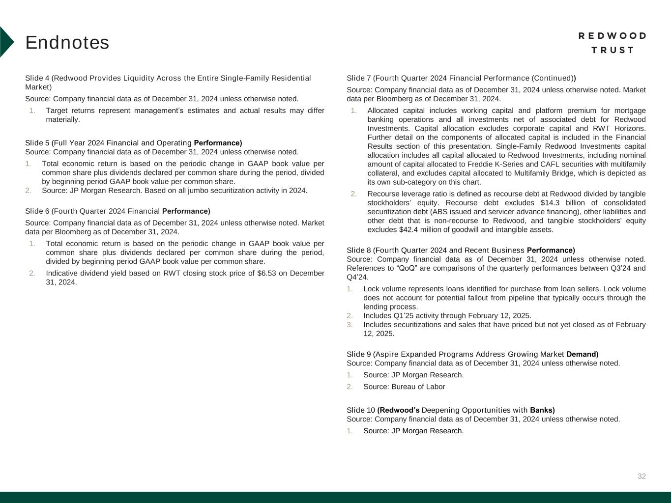 32 Slide 4 (Redwood Provides Liquidity Across the Entire Single-Family Residential Market) Source: Company financial data as of December 31, 2024 unless otherwise noted. 1. Target returns represent management’s estimates and actual results may differ materially. Slide 5 (Full Year 2024 Financial and Operating Performance)​ Source: Company financial data as of December 31, 2024 unless otherwise noted. 1. Total economic return is based on the periodic change in GAAP book value per common share plus dividends declared per common share during the period, divided by beginning period GAAP book value per common share. 2. Source: JP Morgan Research. Based on all jumbo securitization activity in 2024. Slide 6 (Fourth Quarter 2024 Financial Performance)​ Source: Company financial data as of December 31, 2024 unless otherwise noted. Market data per Bloomberg as of December 31, 2024. 1. Total economic return is based on the periodic change in GAAP book value per common share plus dividends declared per common share during the period, divided by beginning period GAAP book value per common share. 2. Indicative dividend yield based on RWT closing stock price of $6.53 on December 31, 2024. Slide 7 (Fourth Quarter 2024 Financial Performance (Continued))​ Source: Company financial data as of December 31, 2024 unless otherwise noted. Market data per Bloomberg as of December 31, 2024. 1. Allocated capital includes working capital and platform premium for mortgage banking operations and all investments net of associated debt for Redwood Investments. Capital allocation excludes corporate capital and RWT Horizons. Further detail on the components of allocated capital is included in the Financial Results section of this presentation. Single-Family Redwood Investments capital allocation includes all capital allocated to Redwood Investments, including nominal amount of capital allocated to Freddie K-Series and CAFL securities with multifamily collateral, and excludes capital allocated to Multifamily Bridge, which is depicted as its own sub-category on this chart. 2. Recourse leverage ratio is defined as recourse debt at Redwood divided by tangible stockholders' equity. Recourse debt excludes $14.3 billion of consolidated securitization debt (ABS issued and servicer advance financing), other liabilities and other debt that is non-recourse to Redwood, and tangible stockholders' equity excludes $42.4 million of goodwill and intangible assets. Slide 8 (Fourth Quarter 2024 and Recent Business Performance)​ Source: Company financial data as of December 31, 2024 unless otherwise noted. References to “QoQ” are comparisons of the quarterly performances between Q3’24 and Q4’24. 1. Lock volume represents loans identified for purchase from loan sellers. Lock volume does not account for potential fallout from pipeline that typically occurs through the lending process. 2. Includes Q1’25 activity through February 12, 2025. 3. Includes securitizations and sales that have priced but not yet closed as of February 12, 2025. Slide 9 (Aspire Expanded Programs Address Growing Market Demand)​ Source: Company financial data as of December 31, 2024 unless otherwise noted. 1. Source: JP Morgan Research. 2. Source: Bureau of Labor Slide 10 (Redwood’s Deepening Opportunities with Banks)​ Source: Company financial data as of December 31, 2024 unless otherwise noted. 1. Source: JP Morgan Research. Endnotes