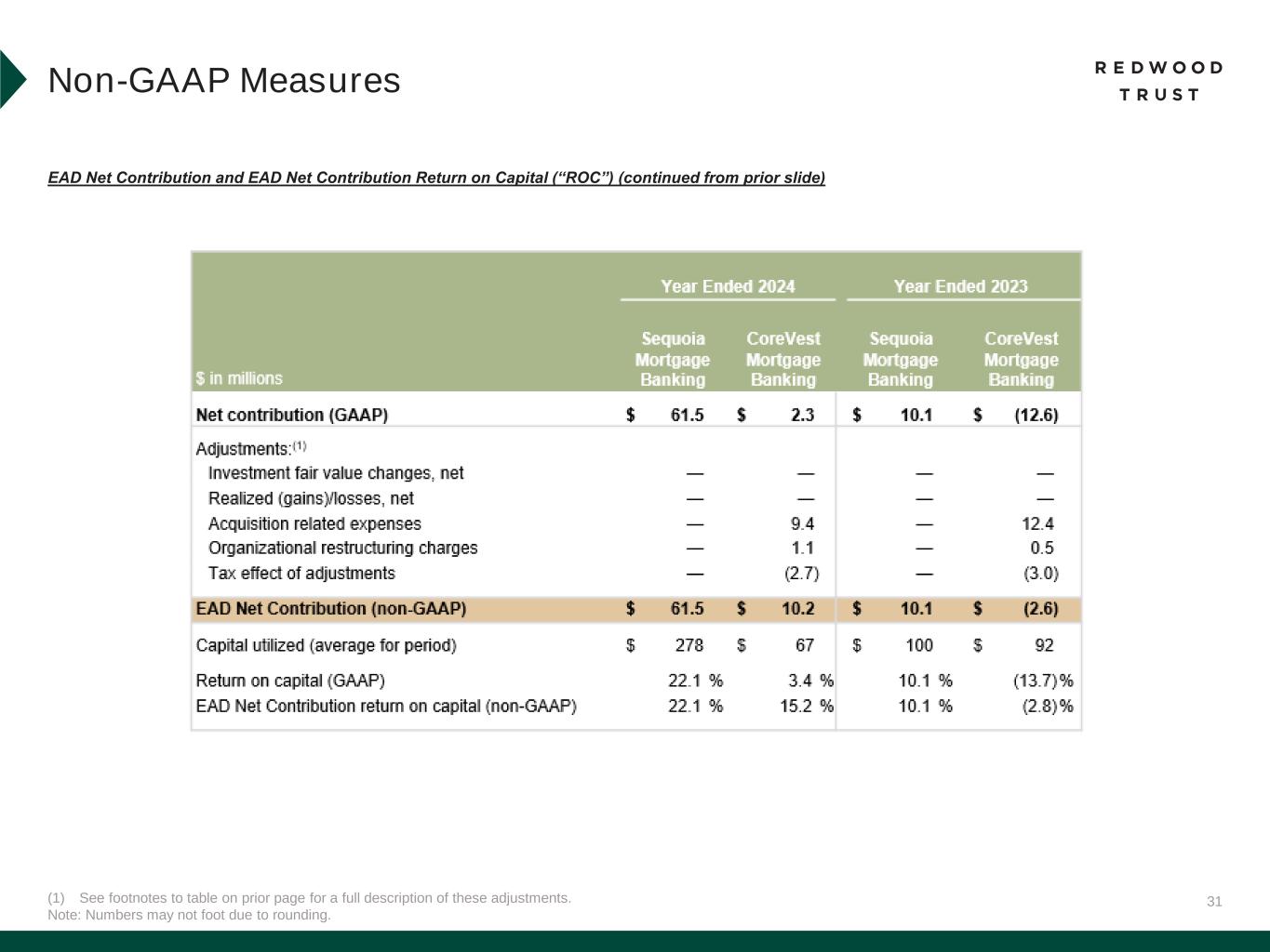 30 EAD Net Contribution and EAD Net Contribution Return on Capital (“ROC”) EAD Net Contribution and EAD Net Contribution Return on Capital are non-GAAP measures derived from GAAP Net Contribution and GAAP Return on Capital, respectively. EAD Net Contribution presents a measure of the profitability of our business operations and is defined as: GAAP Net Contribution adjusted to (i) exclude investment fair value changes, net; (ii) exclude realized gains and losses; (iii) exclude acquisition related expenses; (iv) exclude certain organizational restructuring charges (as applicable); and (v) adjust for the hypothetical income taxes associated with these adjustments. Each of these adjustments to arrive at EAD Net Contribution are the same adjustments used to calculate EAD, as applicable to each segment for which it is being calculated. EAD Net Contribution Return on Capital presents a measure of profitability relative to the amount of capital utilized in the operations of each segment during a period and is calculated by dividing annualized non-GAAP EAD Net Contribution by the average capital utilized by the segment during the period. Management utilizes these measures internally in analyzing each of the Company’s business segments’ contribution to EAD. See prior slide for a further description of how management utilizes EAD and why EAD may assist investors, as well as limitations related to using EAD-based metrics. We caution that EAD Net Contribution and EAD Net Contribution Return on Capital should not be utilized in isolation, nor should they be considered as alternatives to GAAP Net Contribution, GAAP Return on Capital or other measurements of results of operations computed in accordance with GAAP. The following table presents a reconciliation of GAAP net contribution from our segments, reconciled to EAD Net Contribution, and the associated GAAP return on capital and non-GAAP EAD Net Contribution Return on Capital. (1) See footnotes to table on prior page for a full description of these adjustments. Note: Numbers may not foot due to rounding. Non-GAAP Measures