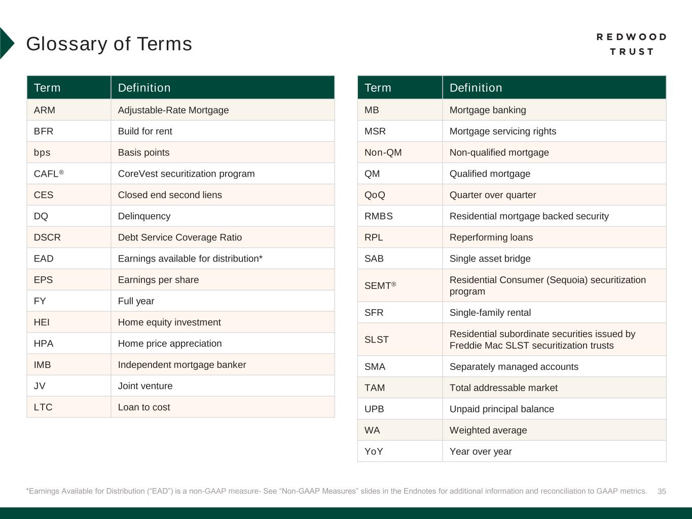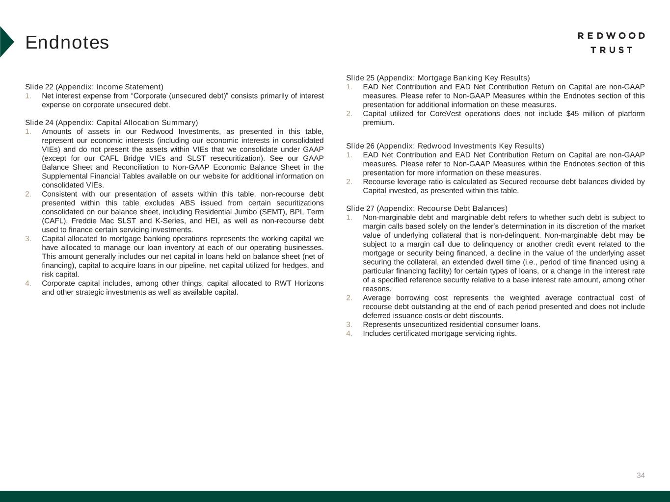 34 Slide 22 (Appendix: Income Statement) 1. Net interest expense from “Corporate (unsecured debt)” consists primarily of interest expense on corporate unsecured debt. Slide 24 (Appendix: Capital Allocation Summary) 1. Amounts of assets in our Redwood Investments, as presented in this table, represent our economic interests (including our economic interests in consolidated VIEs) and do not present the assets within VIEs that we consolidate under GAAP (except for our CAFL Bridge VIEs and SLST resecuritization). See our GAAP Balance Sheet and Reconciliation to Non-GAAP Economic Balance Sheet in the Supplemental Financial Tables available on our website for additional information on consolidated VIEs. 2. Consistent with our presentation of assets within this table, non-recourse debt presented within this table excludes ABS issued from certain securitizations consolidated on our balance sheet, including Residential Jumbo (SEMT), BPL Term (CAFL), Freddie Mac SLST and K-Series, and HEI, as well as non-recourse debt used to finance certain servicing investments. 3. Capital allocated to mortgage banking operations represents the working capital we have allocated to manage our loan inventory at each of our operating businesses. This amount generally includes our net capital in loans held on balance sheet (net of financing), capital to acquire loans in our pipeline, net capital utilized for hedges, and risk capital. 4. Corporate capital includes, among other things, capital allocated to RWT Horizons and other strategic investments as well as available capital. Endnotes Slide 25 (Appendix: Mortgage Banking Key Results) 1. EAD Net Contribution and EAD Net Contribution Return on Capital are non-GAAP measures. Please refer to Non-GAAP Measures within the Endnotes section of this presentation for additional information on these measures. 2. Capital utilized for CoreVest operations does not include $45 million of platform premium. Slide 26 (Appendix: Redwood Investments Key Results) 1. EAD Net Contribution and EAD Net Contribution Return on Capital are non-GAAP measures. Please refer to Non-GAAP Measures within the Endnotes section of this presentation for more information on these measures. 2. Recourse leverage ratio is calculated as Secured recourse debt balances divided by Capital invested, as presented within this table. Slide 27 (Appendix: Recourse Debt Balances) 1. Non-marginable debt and marginable debt refers to whether such debt is subject to margin calls based solely on the lender’s determination in its discretion of the market value of underlying collateral that is non-delinquent. Non-marginable debt may be subject to a margin call due to delinquency or another credit event related to the mortgage or security being financed, a decline in the value of the underlying asset securing the collateral, an extended dwell time (i.e., period of time financed using a particular financing facility) for certain types of loans, or a change in the interest rate of a specified reference security relative to a base interest rate amount, among other reasons. 2. Average borrowing cost represents the weighted average contractual cost of recourse debt outstanding at the end of each period presented and does not include deferred issuance costs or debt discounts. 3. Represents unsecuritized residential consumer loans. 4. Includes certificated mortgage servicing rights.