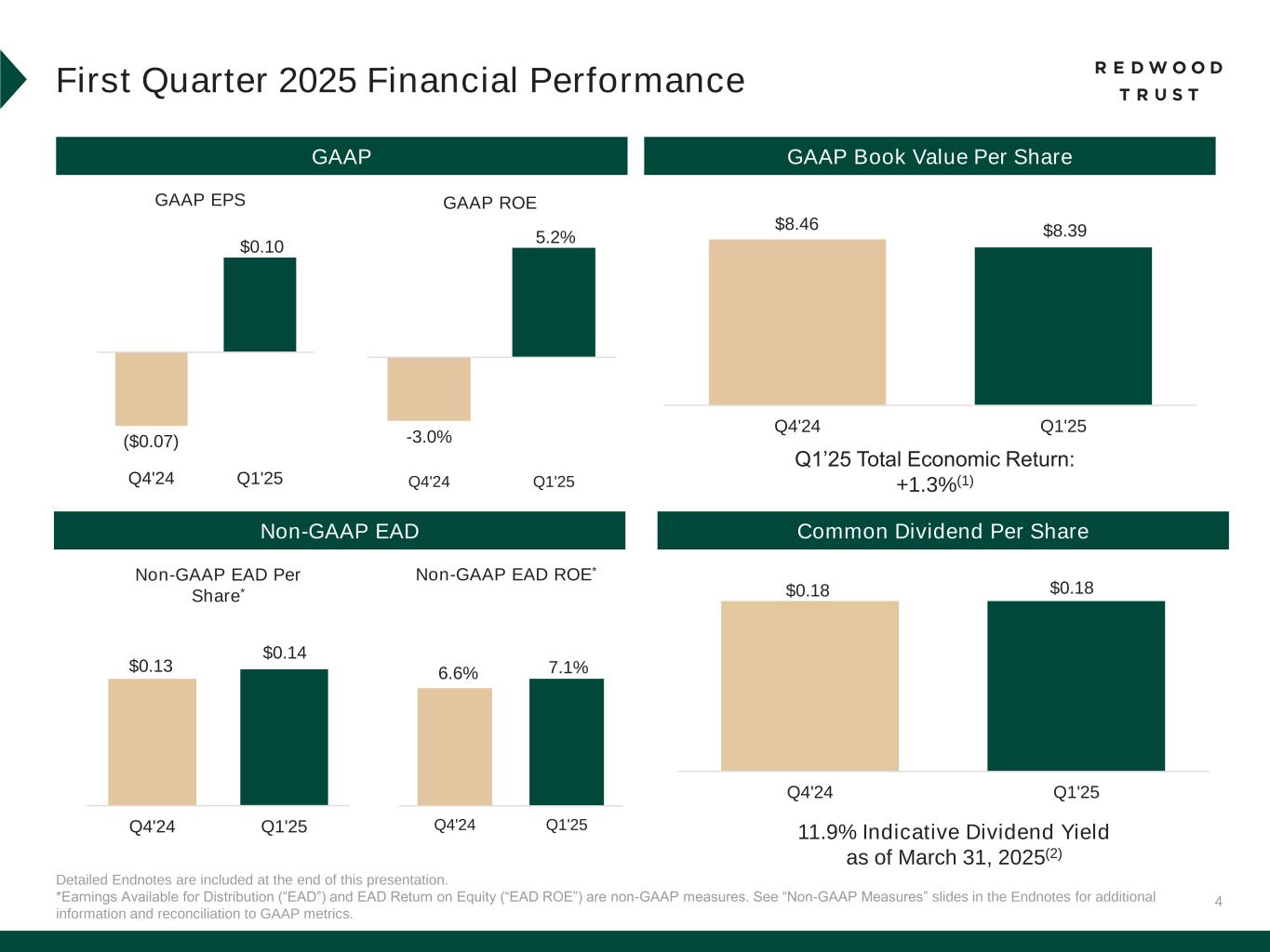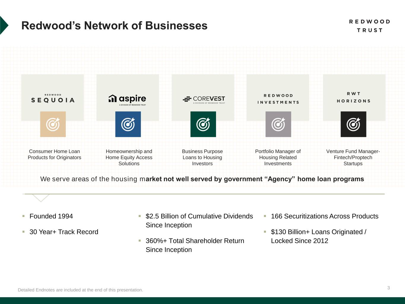 2 This presentation contains forward-looking statements, including statements regarding our 2025 forward outlook and strategic priorities, key drivers to increase earnings, book value, and mortgage banking volumes, current target annualized non-GAAP EAD returns on equity, current target returns related to capital deployment opportunities and estimates of upside and potential earnings in our Redwood Investments segment from embedded discounts to par value on securities. Forward-looking statements involve numerous risks and uncertainties. Our actual results may differ from our beliefs, expectations, estimates, and projections and, consequently, you should not rely on these forward-looking statements as predictions of future events. Forward-looking statements are not historical in nature and can be identified by words such as “anticipate,” “estimate,” “will,” “should,” “expect,” “believe,” “intend,” “seek,” “plan” and similar expressions or their negative forms, or by references to strategy, plans, opportunities, or intentions. These forward-looking statements are subject to risks and uncertainties, including, among other things, those described in the Company’s Annual Report on Form 10-K for the year ended December 31, 2024 and any subsequent Quarterly Reports on Form 10-K, Form 10-Q and Form 8-K under the caption “Risk Factors.” Cautionary Statement; Forward-Looking Statements Other risks, uncertainties, and factors that could cause actual results to differ materially from those projected may be described from time to time in reports the Company files with the Securities and Exchange Commission, including Current Reports on Form 8-K. Additionally, this presentation contains estimates and information concerning our industry, including market size and growth rates of the markets in which we participate, that are based on industry publications and reports. This information involves many assumptions and limitations, and you are cautioned not to give undue weight to these estimates. We have not independently verified the accuracy or completeness of the data contained in these industry publications and reports. The industry in which we operate is subject to a high degree of uncertainty and risk due to a variety of factors, including those referred to above, that could cause results to differ materially from those expressed in these publications and reports.