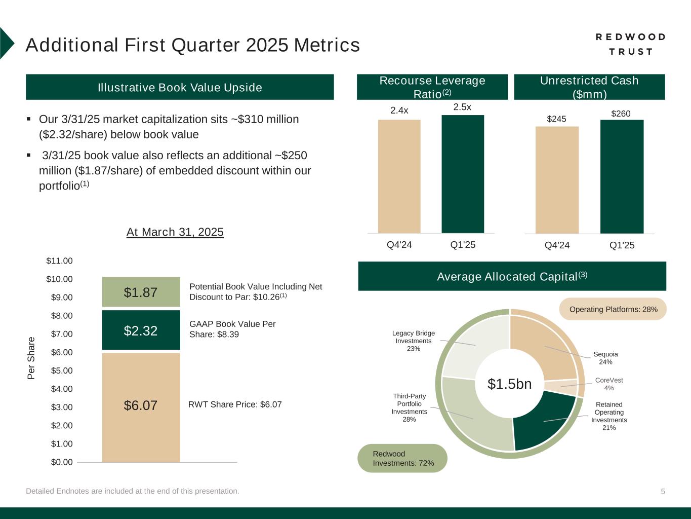 4 Detailed Endnotes are included at the end of this presentation. *Earnings Available for Distribution (“EAD”) and EAD Return on Equity (“EAD ROE”) are non-GAAP measures. See “Non-GAAP Measures” slides in the Endnotes for additional information and reconciliation to GAAP metrics. First Quarter 2025 Financial Performance Q1’25 Total Economic Return: +1.3%(1) GAAP ROE Non-GAAP EAD ROE* GAAP EPS GAAP GAAP Book Value Per Share Common Dividend Per ShareNon-GAAP EAD Non-GAAP EAD Per Share* $8.46 $8.39 Q4'24 Q1'25 $0.13 $0.14 Q4'24 Q1'25 ($0.07) $0.10 Q4'24 Q1'25 -3.0% 5.2% Q4'24 Q1'25 6.6% 7.1% Q4'24 Q1'25 11.9% Indicative Dividend Yield as of March 31, 2025(2) $0.18 $0.18 Q4'24 Q1'25