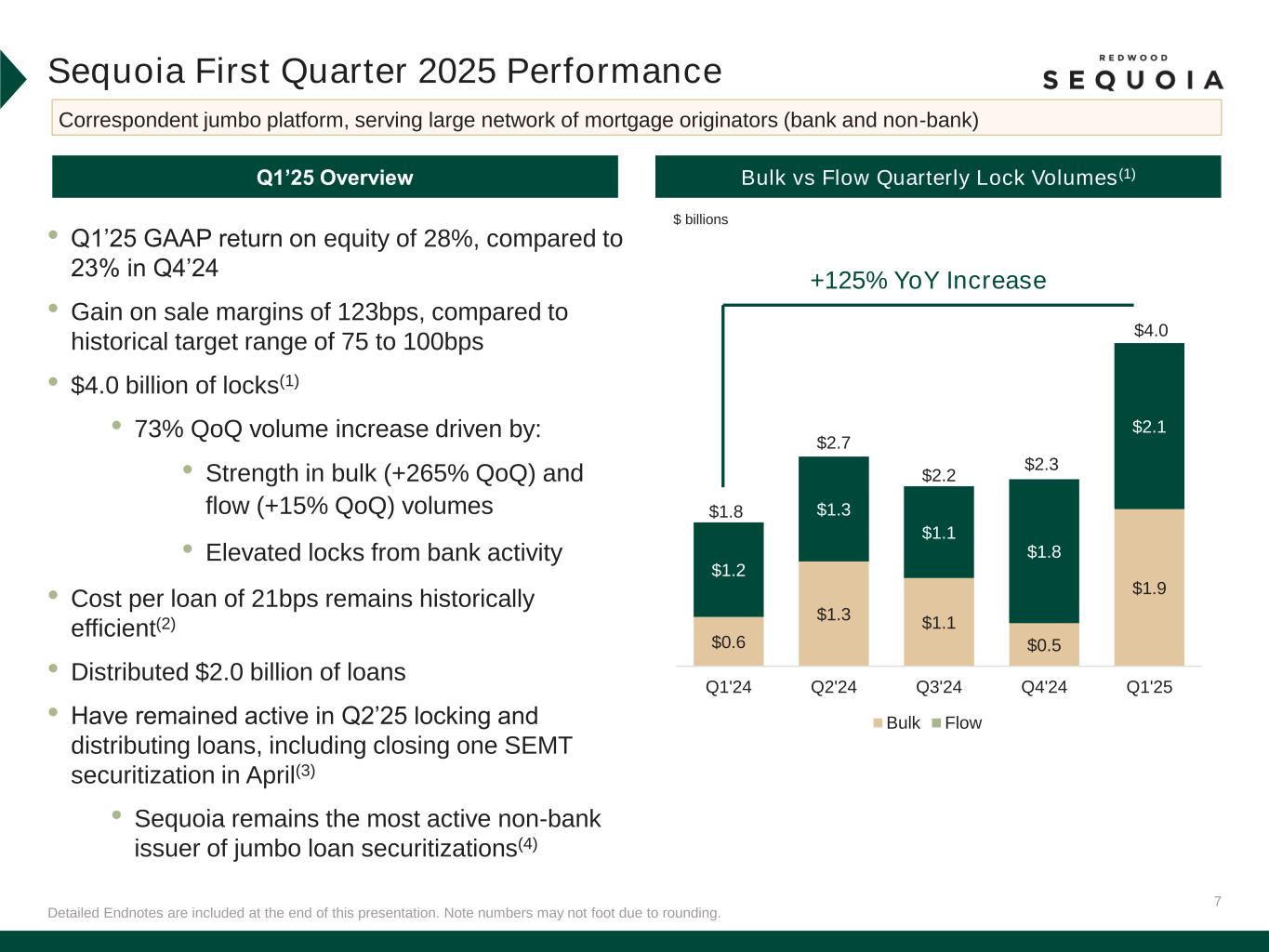 6 ▪ GAAP segment net income of $25.8 million ▪ Segment GAAP ROE of 28% ▪ $4.0 billion of lock volume (+73% QoQ and +125% YoY)(1)(2) ▪ Launched new expanded loan products (e.g. Bank Statement and DSCR loans) in January 2025 ▪ $111 million of lock volume across 25 sellers(1)(2) ▪ GAAP segment net income of $1.3 million ▪ Segment Non-GAAP EAD ROE of 20%* ▪ $482 million of loan fundings (-4% QoQ and +48% YoY) ▪ GAAP Segment net income of $22.9 million ▪ Deployed approximately $100 million of capital primarily into accretive Retained Operating Investments with target returns of 15% to 20%(3) ▪ Four new investments, including two new investments in AI-driven companies and one follow-on investment in an existing RWT Horizons company First Quarter 2025 & Recent Business Performance Detailed Endnotes are included at the end of this presentation. *EAD return on equity is a non-GAAP measure. See “Non-GAAP Measures” slides in the Endnotes for additional information and reconciliation to GAAP metrics. Capital allocated to mortgage banking platforms is inclusive of risk-based capital. QTD Q2’25, we have distributed approximately $520 million of loans across our operating platforms(4)