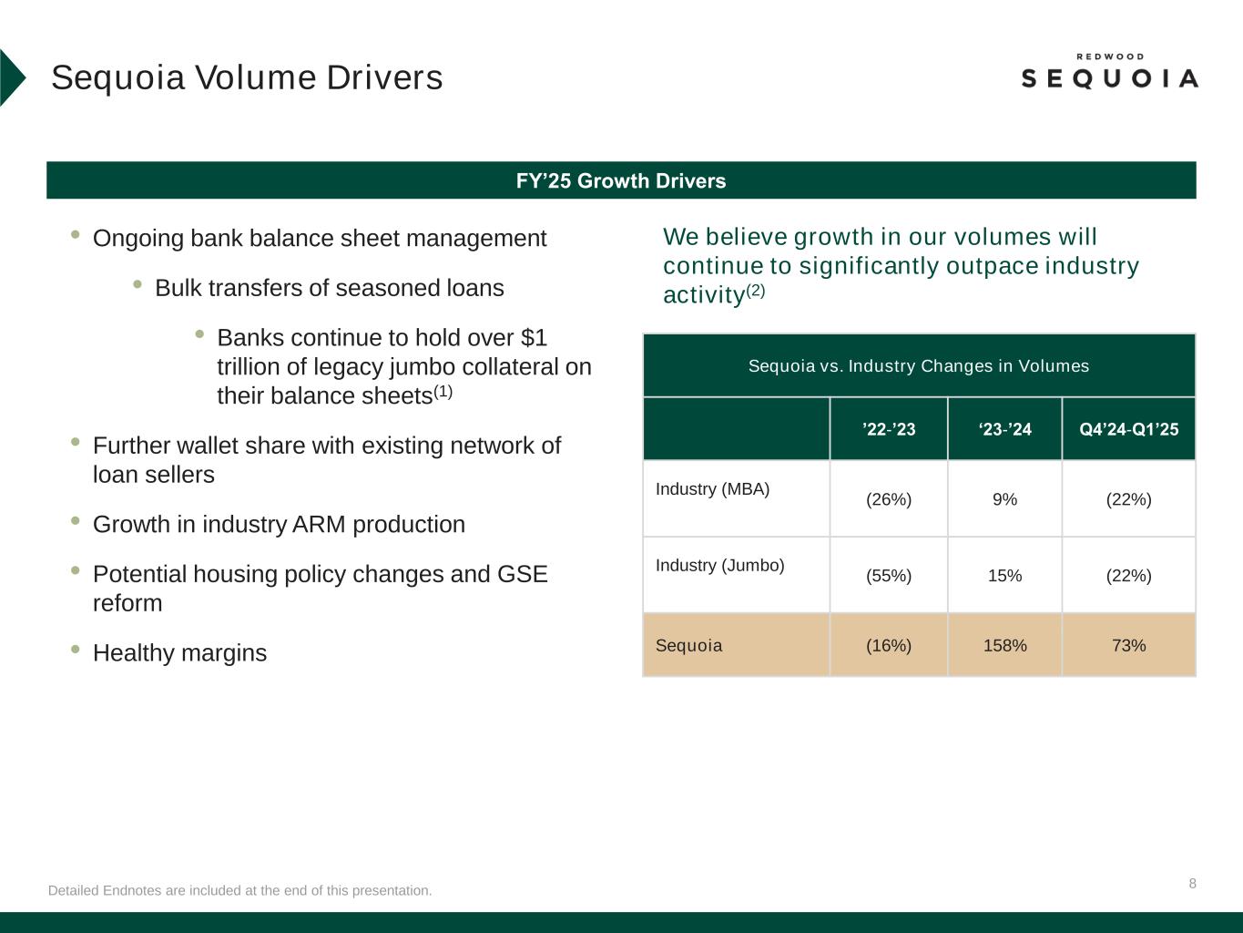 7 Detailed Endnotes are included at the end of this presentation. Note numbers may not foot due to rounding. Sequoia First Quarter 2025 Performance Bulk vs Flow Quarterly Lock Volumes(1) $ billions • Q1’25 GAAP return on equity of 28%, compared to 23% in Q4’24 • Gain on sale margins of 123bps, compared to historical target range of 75 to 100bps • $4.0 billion of locks(1) • 73% QoQ volume increase driven by: • Strength in bulk (+265% QoQ) and flow (+15% QoQ) volumes • Elevated locks from bank activity • Cost per loan of 21bps remains historically efficient(2) • Distributed $2.0 billion of loans • Have remained active in Q2’25 locking and distributing loans, including closing one SEMT securitization in April(3) • Sequoia remains the most active non-bank issuer of jumbo loan securitizations(4) Q1’25 Overview +125% YoY Increase Correspondent jumbo platform, serving large network of mortgage originators (bank and non-bank) $0.6 $1.3 $1.1 $0.5 $1.9 $1.2 $1.3 $1.1 $1.8 $2.1 $1.8 $2.7 $2.2 $2.3 $4.0 Q1'24 Q2'24 Q3'24 Q4'24 Q1'25 Bulk Flow