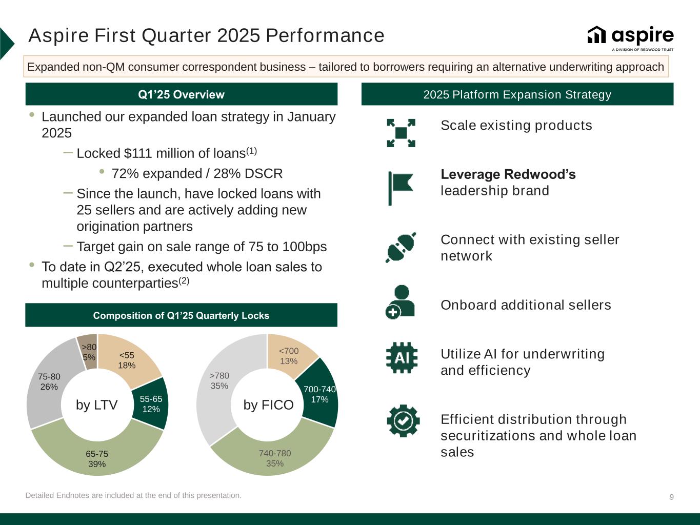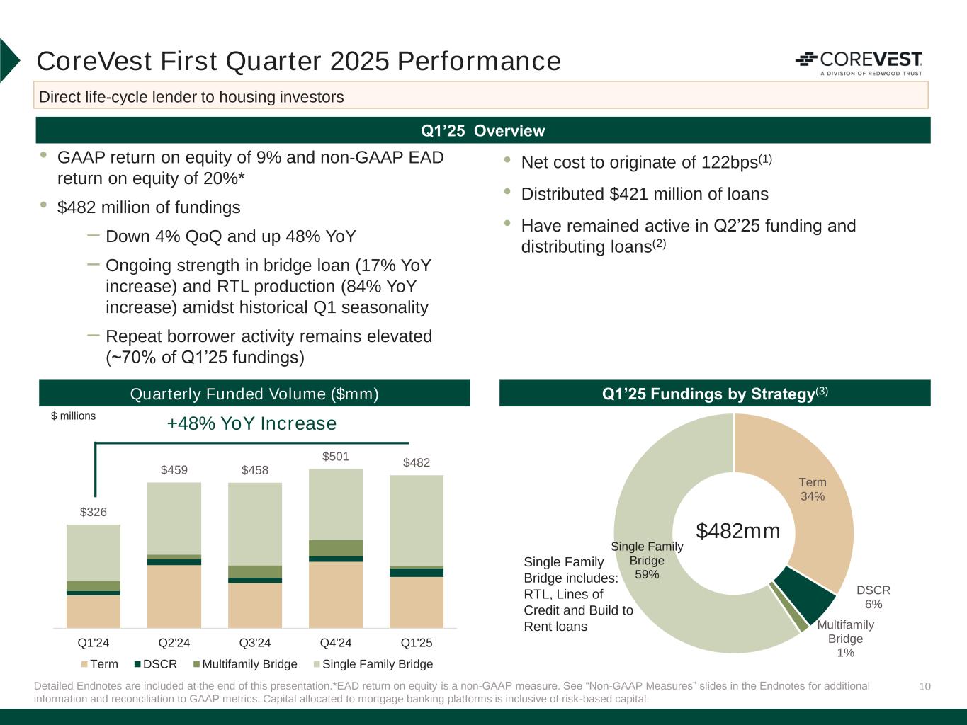9 Aspire First Quarter 2025 Performance Composition of Q1’25 Quarterly Locks Q1’25 Overview Detailed Endnotes are included at the end of this presentation. 2025 Platform Expansion Strategy Scale existing products Leverage Redwood’s leadership brand Connect with existing seller network Onboard additional sellers Utilize AI for underwriting and efficiency Efficient distribution through securitizations and whole loan sales <700 13% 700-740 17% 740-780 35% >780 35% by LTV by FICO Expanded non-QM consumer correspondent business – tailored to borrowers requiring an alternative underwriting approach • Launched our expanded loan strategy in January 2025 – Locked $111 million of loans(1) • 72% expanded / 28% DSCR – Since the launch, have locked loans with 25 sellers and are actively adding new origination partners – Target gain on sale range of 75 to 100bps • To date in Q2’25, executed whole loan sales to multiple counterparties(2) <55 18% 55-65 12% 65-75 39% 75-80 26% >80 5%