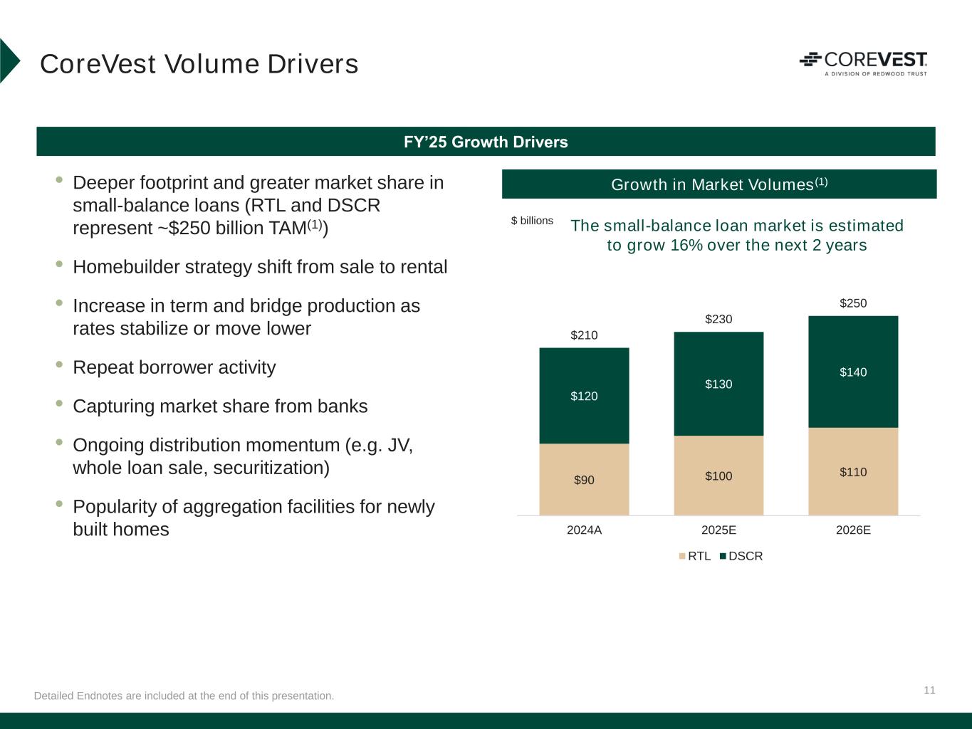 10 • GAAP return on equity of 9% and non-GAAP EAD return on equity of 20%* • $482 million of fundings – Down 4% QoQ and up 48% YoY – Ongoing strength in bridge loan (17% YoY increase) and RTL production (84% YoY increase) amidst historical Q1 seasonality – Repeat borrower activity remains elevated (~70% of Q1’25 fundings) CoreVest First Quarter 2025 Performance Q1’25 Overview Quarterly Funded Volume ($mm) Detailed Endnotes are included at the end of this presentation.*EAD return on equity is a non-GAAP measure. See “Non-GAAP Measures” slides in the Endnotes for additional information and reconciliation to GAAP metrics. Capital allocated to mortgage banking platforms is inclusive of risk-based capital. +48% YoY Increase $ millions Q1’25 Fundings by Strategy(3) • Net cost to originate of 122bps(1) • Distributed $421 million of loans • Have remained active in Q2’25 funding and distributing loans(2) Direct life-cycle lender to housing investors Term 34% DSCR 6% Multifamily Bridge 1% Single Family Bridge 59% Single Family Bridge includes: RTL, Lines of Credit and Build to Rent loans $482mm $326 $459 $458 $501 $482 Q1'24 Q2'24 Q3'24 Q4'24 Q1'25 Term DSCR Multifamily Bridge Single Family Bridge