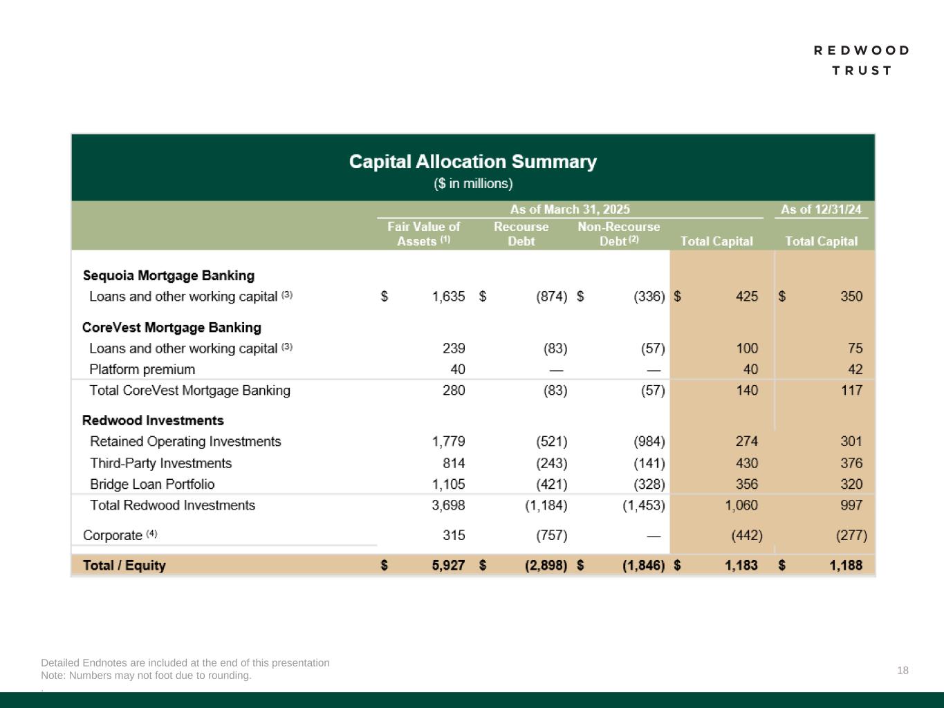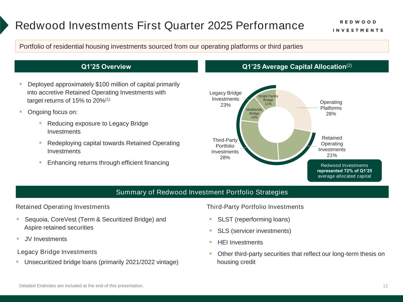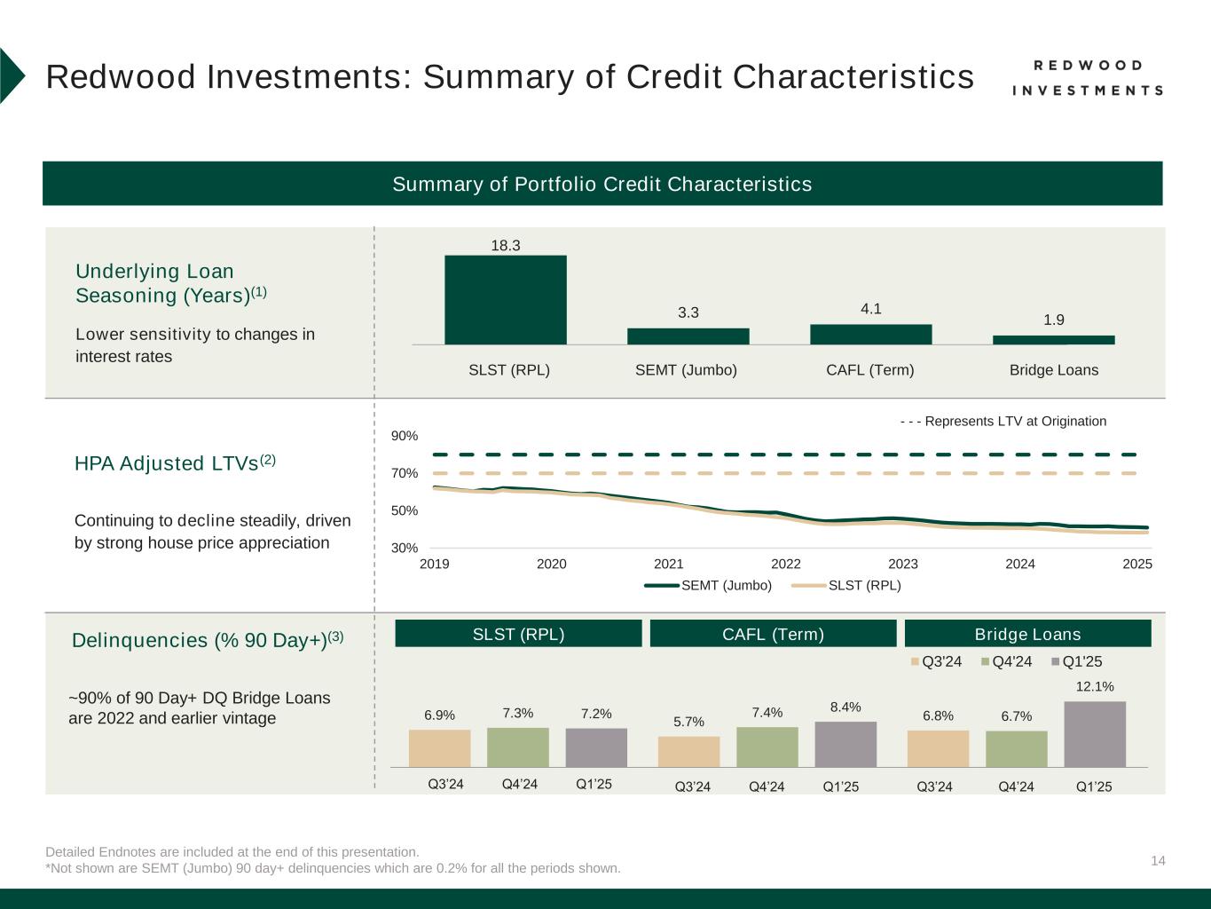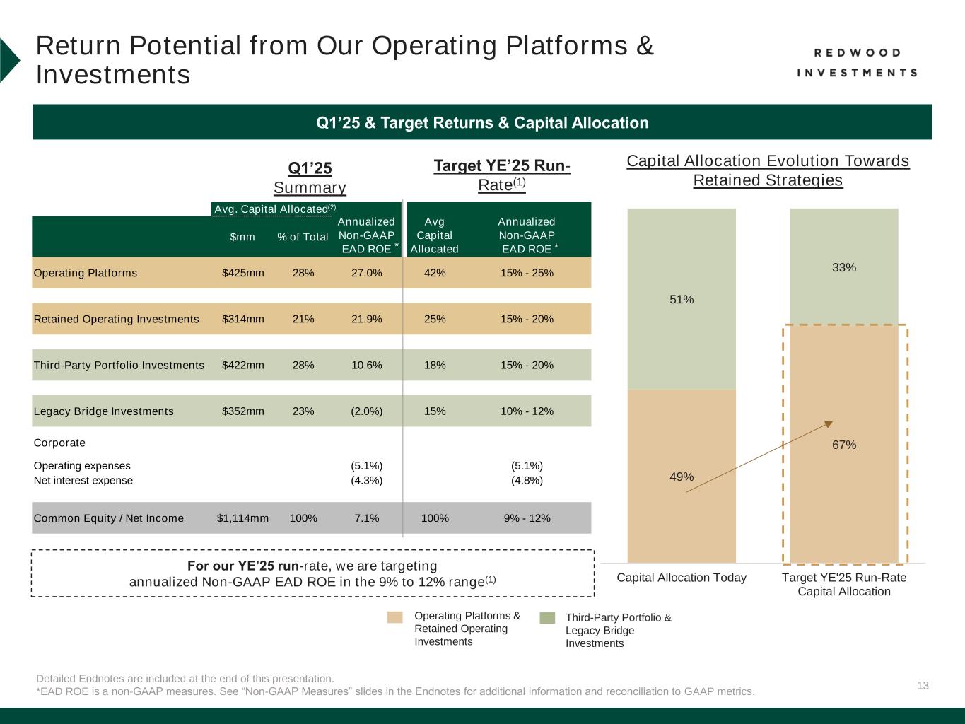 12 Redwood Investments First Quarter 2025 Performance Operating Platforms 28% Retained Operating Investments 21% Third-Party Portfolio Investments 28% Multifamily Bridge 13% Single Family Bridge 11% Detailed Endnotes are included at the end of this presentation. Retained Operating Investments ▪ Sequoia, CoreVest (Term & Securitized Bridge) and Aspire retained securities ▪ JV Investments Summary of Redwood Investment Portfolio Strategies Q1’25 Overview Portfolio of residential housing investments sourced from our operating platforms or third parties ▪ Deployed approximately $100 million of capital primarily into accretive Retained Operating Investments with target returns of 15% to 20%(1) ▪ Ongoing focus on: ▪ Reducing exposure to Legacy Bridge Investments ▪ Redeploying capital towards Retained Operating Investments ▪ Enhancing returns through efficient financing Third-Party Portfolio Investments Legacy Bridge Investments ▪ SLST (reperforming loans) ▪ SLS (servicer investments) ▪ HEI Investments ▪ Other third-party securities that reflect our long-term thesis on housing credit▪ Unsecuritized bridge loans (primarily 2021/2022 vintage) Q1’25 Average Capital Allocation(2) Legacy Bridge Investments 23% Redwood Investments represented 72% of Q1’25 average allocated capital