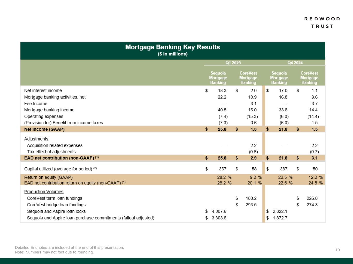 25 Slide 3 (Redwood’s Network of Businesses)​ Source: Company financial data as of March 31, 2025 unless otherwise noted. Market data per Bloomberg as of March 31, 2025. Slide 4 (First Quarter 2025 Financial Performance)​ Source: Company financial data as of March 31, 2025 unless otherwise noted. Market data per Bloomberg as of March 31, 2025. 1. Total economic return is based on the periodic change in GAAP book value per common share plus dividends declared per common share during the period, divided by beginning period GAAP book value per common share. 2. Indicative dividend yield based on RWT closing stock price of $6.07 on March 31, 2025. Slide 5 (Additional First Quarter 2025 Metrics)​ Source: Company financial data as of March 31, 2025 unless otherwise noted. 1. Represents management’s estimates of potential book value per share upside on securities acquired prior to 2023 in our Redwood Investments portfolio due to the net discount to par value, net of portfolio hedges. There are several factors that may impact our ability to realize all, or a portion, of this amount which may be outside our control, including credit performance and prepayment speeds. Actual realized book value returns may differ materially. 2. At March 31, 2025 and December 31, 2024, recourse debt excluded $15.8 billion and $14.3 billion, respectively, of consolidated securitization debt (ABS issued and servicer advance financing), other liabilities and other debt that is non-recourse to Redwood, and tangible stockholders' equity excluded $40.2 million and $42.4 million, respectively, of goodwill and intangible assets. 3. Average allocated capital includes average working capital for mortgage banking operations and average investments net of associated average debt for Redwood Investments. Capital allocation excludes corporate capital and RWT Horizons. Further detail on the components of Q1’25 allocated capital is included in the Financial Results section of this presentation. Slide 6 (First Quarter 2025 and Recent Business Performance)​ Source: Company financial data as of March 31, 2025 unless otherwise noted. References to “QoQ” are comparisons of the quarterly performances between Q4’24 and Q1’25. References to “YoY” are comparisons for the quarterly performances between Q1’24 and Q1’25. 1. Lock volume represents loans identified for purchase from loan sellers. Lock volume does not account for potential fallout from pipeline that typically occurs through the lending process. 2. Aspire lock volume is included in the Sequoia Mortgage Banking business segment results. 3. Represents management’s targets and estimates and actual results may differ materially. 4. Includes securitizations and sales that have priced but not yet closed as of April 29, 2025. Endnotes Slide 7 (Sequoia First Quarter 2025 Performance)​ Source: Company financial data as of March 31, 2025 unless otherwise noted. References to “QoQ” are comparisons of the quarterly performances between Q4’24 and Q1’25. References to “YoY” are comparisons for the quarterly performances between Q1’24 and Q1’25. 1. Lock volume represents loans identified for purchase from loan sellers. Lock volume does not account for potential fallout from pipeline that typically occurs through the lending process. 2. Cost per loan for the Sequoia Mortgage Banking segment is calculated as annual operating expenses of this segment divided by annual loan purchase commitments of this segment. 3. Includes Q2’25 activity through April 29, 2025. 4. Source: JP Morgan Research. Slide 8 (Sequoia Volume Drivers)​ Source: Company financial data as of March 31, 2025 unless otherwise noted. 1. Source: JP Morgan Research. 2. Source: Industry volume per MBA Mortgage Finance disclosed numbers for the periods presented. Slide 9 (Aspire First Quarter 2025 Performance)​ Source: Company financial data as of March 31, 2025 unless otherwise noted. 1. Aspire lock volume is included in the Sequoia Mortgage Banking business segment results. Lock volume represents loans identified for purchase from loan sellers. Lock volume does not account for potential fallout from pipeline that typically occurs through the lending process. 2. Includes Q2’25 activity through April 29, 2025 and may include sales that have priced but not yet closed as of April 29, 2025. Slide 10 (CoreVest First Quarter 2025 Performance)​ Source: Company financial data as of March 31, 2025 unless otherwise noted. References to “QoQ” are comparisons of the quarterly performances between Q4’24 and Q1’25. References to “YoY” are comparisons for the quarterly performances between Q1’24 and Q1’25. 1. Net cost to originate for the CoreVest Mortgage Banking segment is calculated as annual operating expenses of this segment, less upfront origination fees of this segment, divided by origination volume of this segment. 2. Includes sales that have priced but not yet closed as of April 29, 2025. 3. Composition percentages are based on unpaid principal balance. Slide 11 (CoreVest Volume Drivers)​ Source: Company financial data as of March 31, 2025 unless otherwise noted. 1. RTL volume based on Fannie Mae Single Family Total Home Sales and Attom Data Fix & Flip Percentage. DSCR/Term based on the same for the rest of the investor owned %. Analysis uses Wells Fargo Research. Figures are rounded. Actual results may vary materially. Slide 12 (Redwood Investments First Quarter 2025 Performance)​ Source: Company financial data as of March 31, 2025 unless otherwise noted. 1. Represents management’s targets and estimates and actual results may differ materially. 2. Average allocated capital includes average working capital for mortgage banking operations and average investments net of associated average debt for Redwood Investments. Capital allocation excludes corporate capital and RWT Horizons. Further detail on the components of Q1’25 allocated capital is included in the Fin