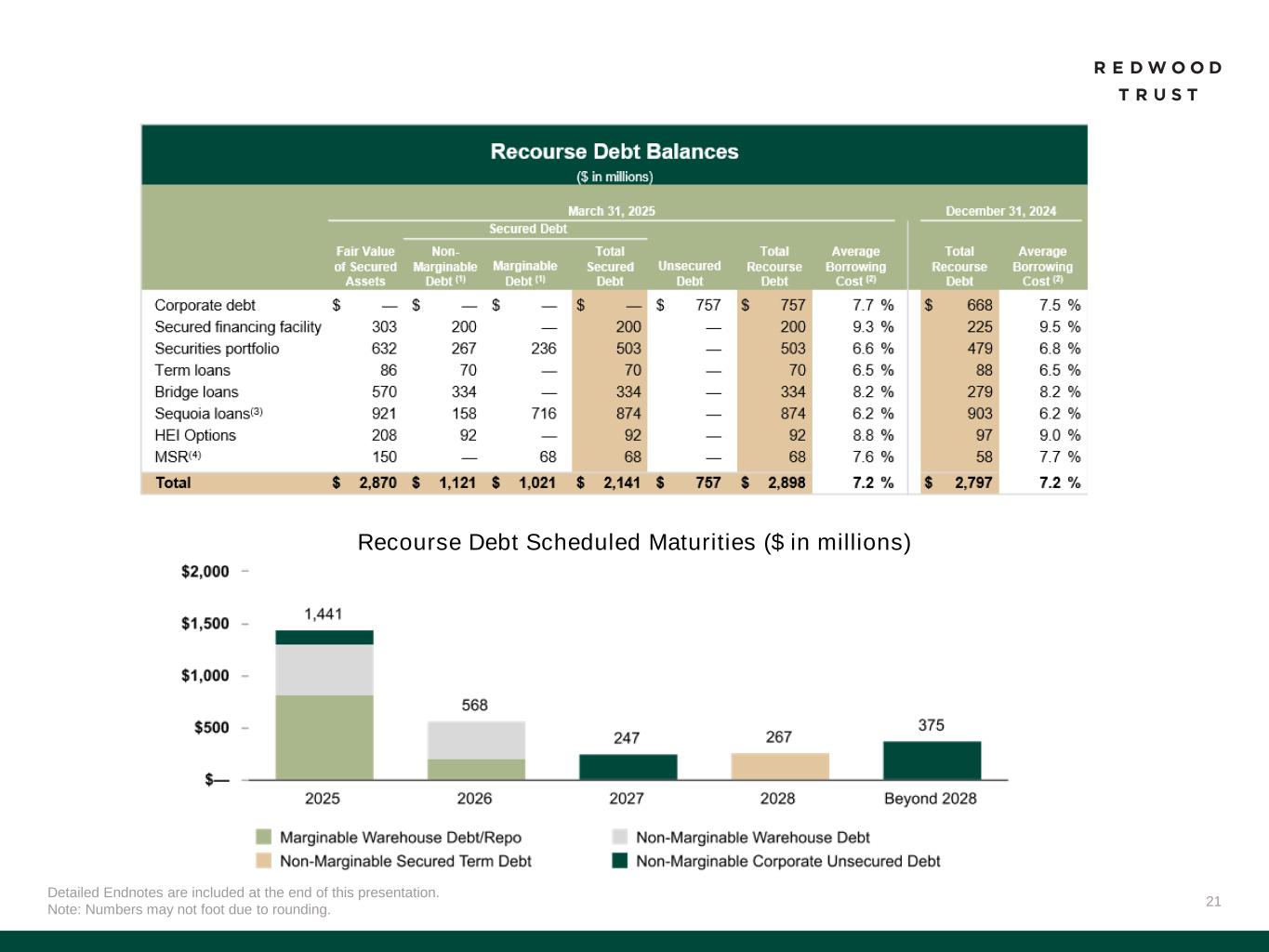 26 Slide 13 (Return Potential from Our Operating Platforms & Investments)​ Source: Company financial data as of March 31, 2025 unless otherwise noted. 1. Represents management’s targets and estimates and actual results may differ materially. Target returns reflect a variety of management’s estimates and assumptions that could prove to be incorrect, such as an investment’s coupon, amortization of premium or discount, costs and fees, and our assumptions regarding prepayments, defaults and loan losses, among other things. Income and cash flows recognized in future periods may be significantly less than the income and cash flows that would have been recognized had target returns been realized. 2. Average allocated capital includes average working capital for mortgage banking operations and average investments net of associated average debt for Redwood Investments. Capital allocation excludes corporate capital and RWT Horizons. Further detail on the components of Q1’25 allocated capital is included in the Financial Results section of this presentation. Slide 14 (Redwood Investments: Summary of Credit Characteristics)​ Source: Company financial data as of March 31, 2025 unless otherwise noted. 1. Averages are calculated using a weighted average. 2. Source: Bloomberg (HPI LTV (Amort) %), Home Price Indexed Amortized Loan to Value. 3. Percentages are based on UPB. Slide 16 (Appendix: Income Statement) 1. Net interest expense from “Corporate (unsecured debt)” consists primarily of interest expense on corporate unsecured debt. Slide 18 (Appendix: Capital Allocation Summary) 1. Amounts of assets in our Redwood Investments segment, as presented in this table, represent our economic interests (including our economic interests in consolidated VIEs) and do not present the assets within VIEs that we consolidate under GAAP (except for our CAFL Bridge VIEs and SLST resecuritization). See our GAAP Balance Sheet and Reconciliation to Non-GAAP Economic Balance Sheet in the Supplemental Financial Tables available on our website for additional information on consolidated VIEs. 2. Consistent with our presentation of assets within this table, non-recourse debt presented within this table excludes ABS issued from certain securitizations consolidated on our balance sheet, including Residential Jumbo (SEMT), BPL Term (CAFL), Freddie Mac SLST and K-Series, and HEI, as well as non-recourse debt used to finance certain servicing investments. 3. Capital allocated to mortgage banking operations represents the working capital we have allocated to manage our loan inventory at each of our mortgage banking segments. This amount generally includes our net capital in loans held on balance sheet (net of financing), capital to acquire / originate loans in our pipeline, net capital utilized for hedges, and risk capital. 4. Corporate capital includes, among other things, capital allocated to RWT Horizons and other strategic investments as well as available capital. Endnotes Slide 19 (Appendix: Mortgage Banking Key Results) 1. EAD Net Contribution and EAD Net Contribution Return on Equity are non-GAAP measures. Please refer to Non-GAAP Measures within the Endnotes section of this presentation for additional information on these measures. 2. Capital utilized for CoreVest operations does not include $40 million of platform premium. Slide 20 (Appendix: Redwood Investments Key Results) 1. EAD Net Contribution and EAD Net Contribution Return on Equity are non-GAAP measures. Please refer to Non-GAAP Measures within the Endnotes section of this presentation for more information on these measures. 2. Recourse leverage ratio is calculated as Secured recourse debt balances divided by Capital invested, as presented within this table. Slide 21 (Appendix: Recourse Debt Balances) 1. Non-marginable debt and marginable debt refers to whether such debt is subject to margin calls based solely on the lender’s determination in its discretion of the market value of underlying collateral that is non-delinquent. Non-marginable debt may be subject to a margin call due to delinquency or another credit event related to the mortgage or security being financed, a decline in the value of the underlying asset securing the collateral, an extended dwell time (i.e., period of time financed using a particular financing facility) for certain types of loans, or a change in the interest rate of a specified reference security relative to a base interest rate amount, among other reasons. 2. Average borrowing cost represents the weighted average contractual cost of recourse debt outstanding at the end of each period presented and does not include deferred issuance costs or debt discounts. 3. Represents unsecuritized residential consumer loans, inclusive of Aspire loans. 4. Includes certificated mortgage servicing rights.