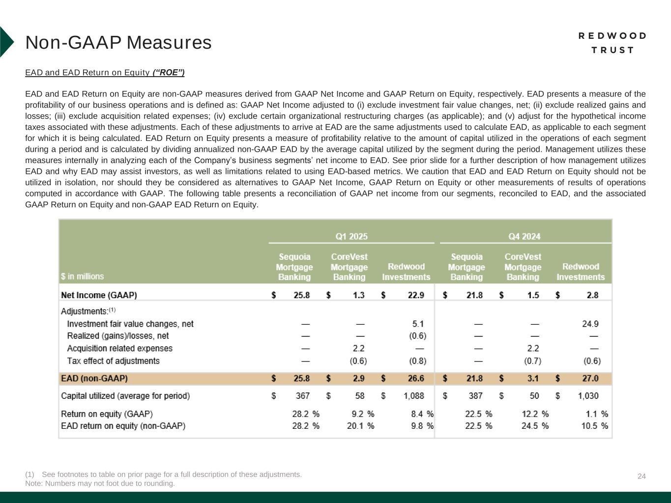 23 Earnings Available for Distribution (“EAD”) and EAD Return on Equity (“EAD ROE”) EAD and EAD ROE are non-GAAP measures derived from GAAP Net income (loss) available (related) to common stockholders and GAAP return on equity (“GAAP ROE”), respectively. EAD is defined as: GAAP net income (loss) available (related) to common stockholders adjusted to (i) exclude investment fair value changes, net; (ii) exclude realized gains and losses; (iii) exclude acquisition related expenses; (iv) exclude certain organizational restructuring charges (as applicable); and (v) adjust for the hypothetical income taxes associated with these adjustments. EAD ROE is defined as EAD divided by average common equity. We believe EAD and EAD ROE provide supplemental information to assist management and investors in analyzing the Company’s results of operations and help facilitate comparisons to industry peers. Management also believes that EAD and EAD ROE are metrics that can supplement its analysis of the Company’s ability to pay dividends, by providing an indication of the current income generating capacity of the Company's business operations as of the quarter being presented. EAD and EAD ROE should not be utilized in isolation, nor should they be considered as an alternative to GAAP net income (loss) available (related) to common shares, GAAP ROE or other measurements of results of operations computed in accordance with GAAP or for federal income tax purposes. Footnotes: 1. Investment fair value changes, net includes all amounts within that same line item on our consolidated statements of income, which primarily represents both realized and unrealized gains and losses on our investments (excluding HEI) and associated hedges. Realized and unrealized gains and losses on our HEI are reflected in a line item on our consolidated income statements titled “HEI income, net”. 2. Realized (gains)/losses, net includes all amounts within that line item on our consolidated statements of income. 3. Acquisition related expenses include transaction costs paid to third parties, as applicable, and the ongoing amortization of intangible assets related to the Riverbend, and CoreVest acquisitions. 4. Tax effect of adjustments represent the hypothetical income taxes associated with all adjustments used to calculate EAD. 5. EAD ROE is calculated by dividing EAD by average common equity for each respective period. Non-GAAP Measures