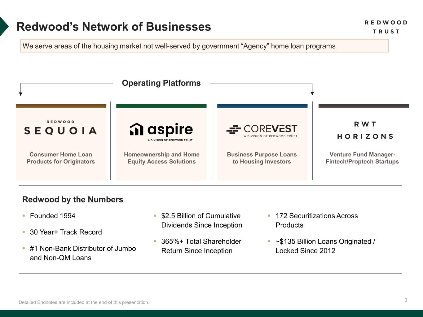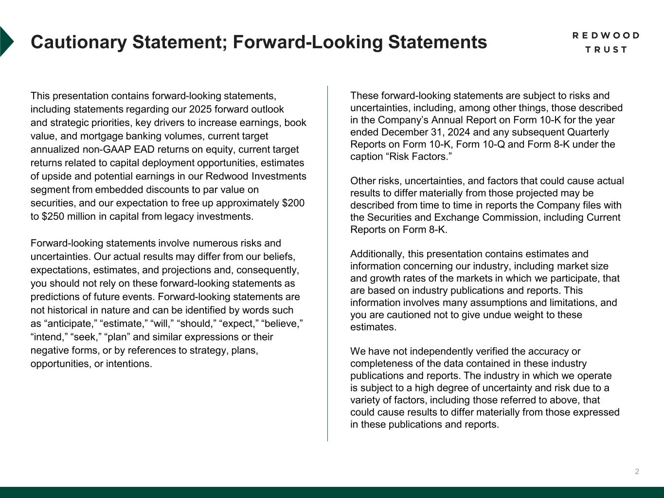 2 This presentation contains forward-looking statements, including statements regarding our 2025 forward outlook and strategic priorities, key drivers to increase earnings, book value, and mortgage banking volumes, current target annualized non-GAAP EAD returns on equity, current target returns related to capital deployment opportunities, estimates of upside and potential earnings in our Redwood Investments segment from embedded discounts to par value on securities, and our expectation to free up approximately $200 to $250 million in capital from legacy investments. Forward-looking statements involve numerous risks and uncertainties. Our actual results may differ from our beliefs, expectations, estimates, and projections and, consequently, you should not rely on these forward-looking statements as predictions of future events. Forward-looking statements are not historical in nature and can be identified by words such as “anticipate,” “estimate,” “will,” “should,” “expect,” “believe,” “intend,” “seek,” “plan” and similar expressions or their negative forms, or by references to strategy, plans, opportunities, or intentions. Cautionary Statement; Forward-Looking Statements These forward-looking statements are subject to risks and uncertainties, including, among other things, those described in the Company’s Annual Report on Form 10-K for the year ended December 31, 2024 and any subsequent Quarterly Reports on Form 10-K, Form 10-Q and Form 8-K under the caption “Risk Factors.” Other risks, uncertainties, and factors that could cause actual results to differ materially from those projected may be described from time to time in reports the Company files with the Securities and Exchange Commission, including Current Reports on Form 8-K. Additionally, this presentation contains estimates and information concerning our industry, including market size and growth rates of the markets in which we participate, that are based on industry publications and reports. This information involves many assumptions and limitations, and you are cautioned not to give undue weight to these estimates. We have not independently verified the accuracy or completeness of the data contained in these industry publications and reports. The industry in which we operate is subject to a high degree of uncertainty and risk due to a variety of factors, including those referred to above, that could cause results to differ materially from those expressed in these publications and reports.