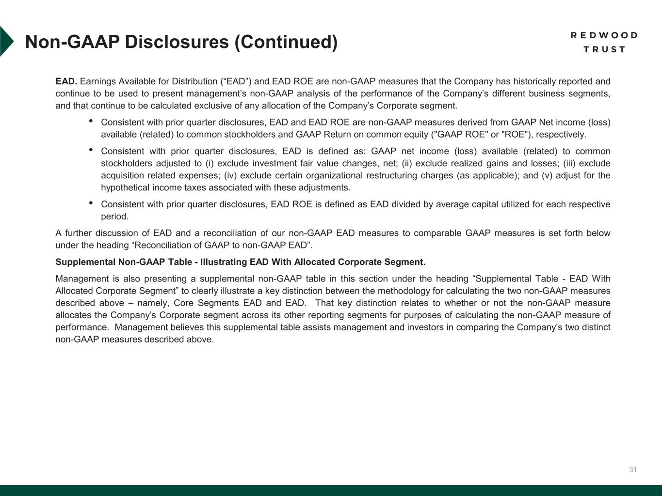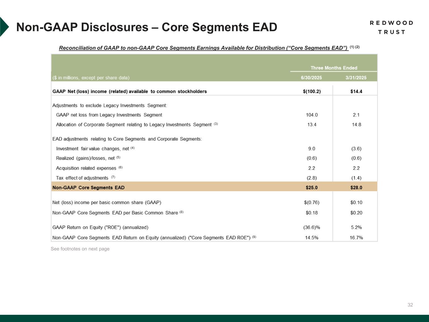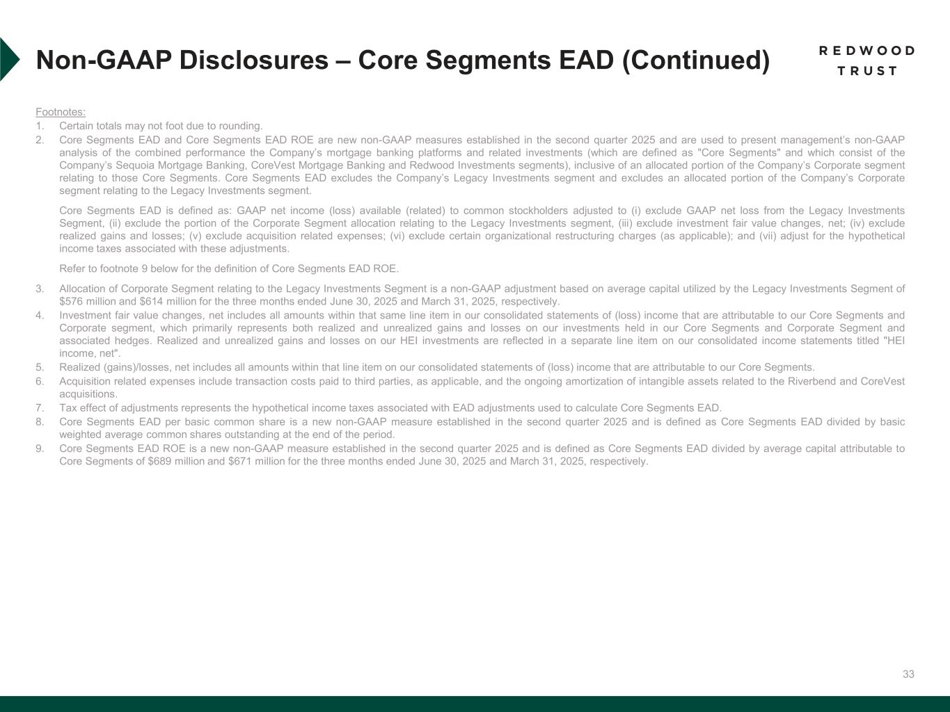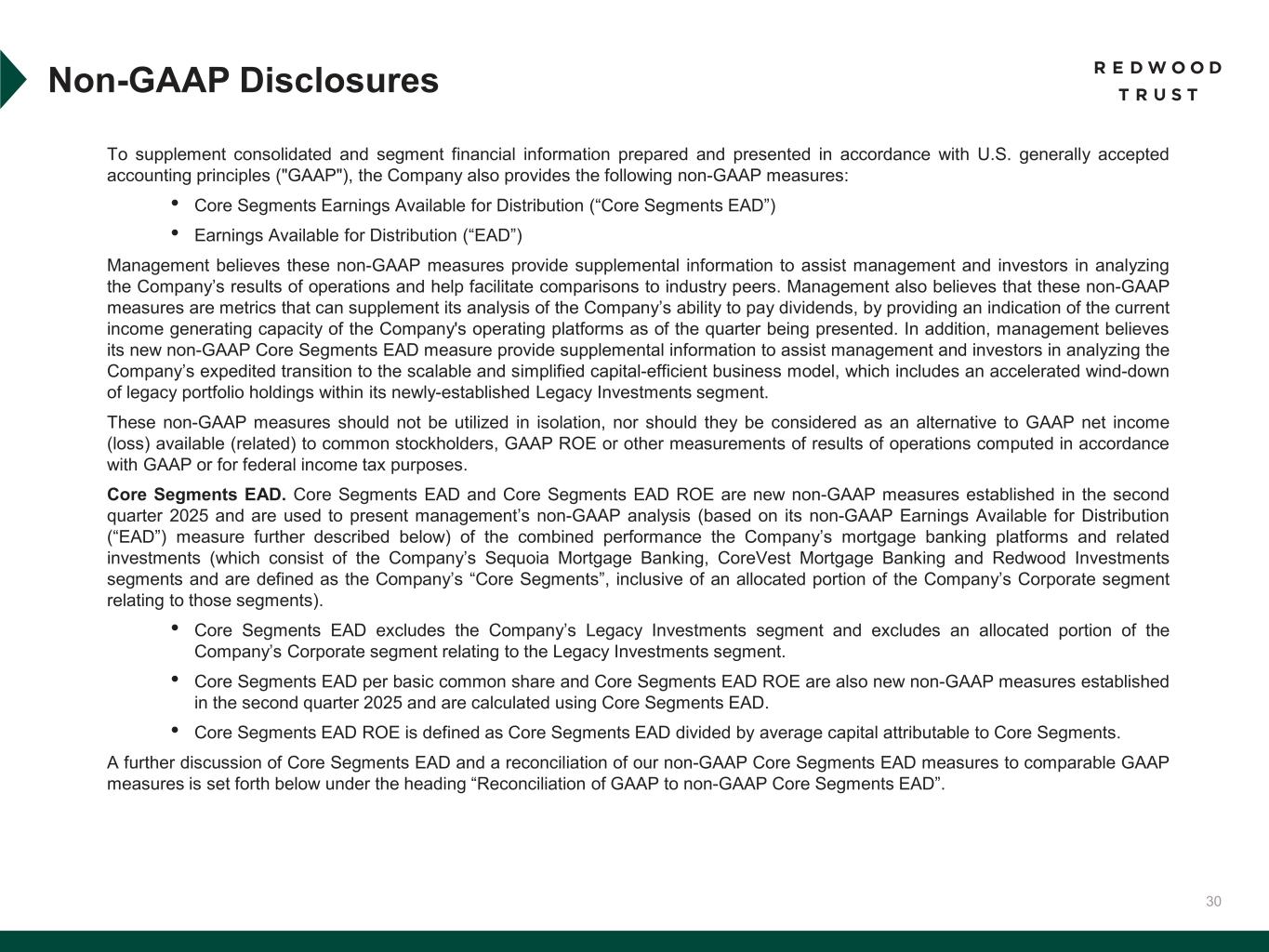 30 To supplement consolidated and segment financial information prepared and presented in accordance with U.S. generally accepted accounting principles ("GAAP"), the Company also provides the following non-GAAP measures: • Core Segments Earnings Available for Distribution (“Core Segments EAD”) • Earnings Available for Distribution (“EAD”) Management believes these non-GAAP measures provide supplemental information to assist management and investors in analyzing the Company’s results of operations and help facilitate comparisons to industry peers. Management also believes that these non-GAAP measures are metrics that can supplement its analysis of the Company’s ability to pay dividends, by providing an indication of the current income generating capacity of the Company's operating platforms as of the quarter being presented. In addition, management believes its new non-GAAP Core Segments EAD measure provide supplemental information to assist management and investors in analyzing the Company’s expedited transition to the scalable and simplified capital-efficient business model, which includes an accelerated wind-down of legacy portfolio holdings within its newly-established Legacy Investments segment. These non-GAAP measures should not be utilized in isolation, nor should they be considered as an alternative to GAAP net income (loss) available (related) to common stockholders, GAAP ROE or other measurements of results of operations computed in accordance with GAAP or for federal income tax purposes. Core Segments EAD. Core Segments EAD and Core Segments EAD ROE are new non-GAAP measures established in the second quarter 2025 and are used to present management’s non-GAAP analysis (based on its non-GAAP Earnings Available for Distribution (“EAD”) measure further described below) of the combined performance the Company’s mortgage banking platforms and related investments (which consist of the Company’s Sequoia Mortgage Banking, CoreVest Mortgage Banking and Redwood Investments segments and are defined as the Company’s “Core Segments”, inclusive of an allocated portion of the Company’s Corporate segment relating to those segments). • Core Segments EAD excludes the Company’s Legacy Investments segment and excludes an allocated portion of the Company’s Corporate segment relating to the Legacy Investments segment. • Core Segments EAD per basic common share and Core Segments EAD ROE are also new non-GAAP measures established in the second quarter 2025 and are calculated using Core Segments EAD. • Core Segments EAD ROE is defined as Core Segments EAD divided by average capital attributable to Core Segments. A further discussion of Core Segments EAD and a reconciliation of our non-GAAP Core Segments EAD measures to comparable GAAP measures is set forth below under the heading “Reconciliation of GAAP to non-GAAP Core Segments EAD”. Non-GAAP Disclosures