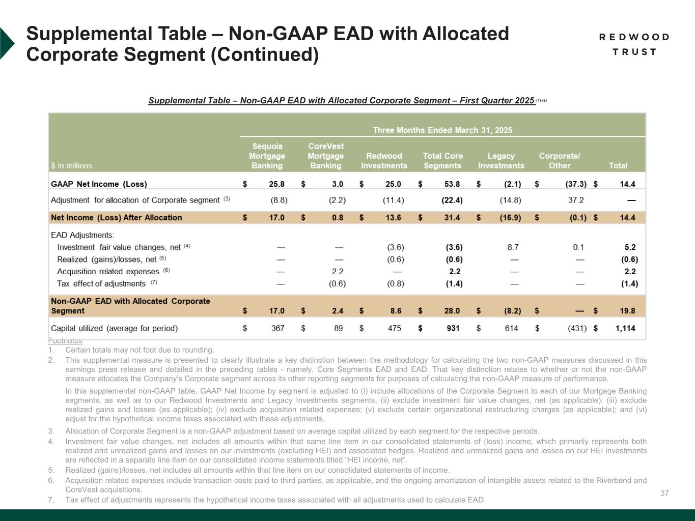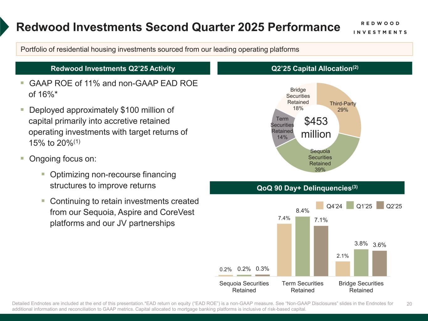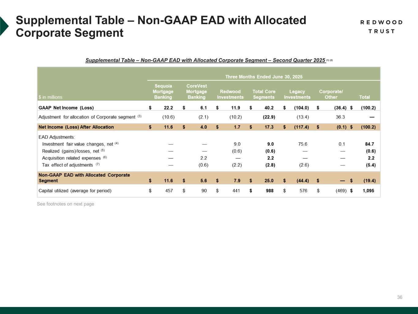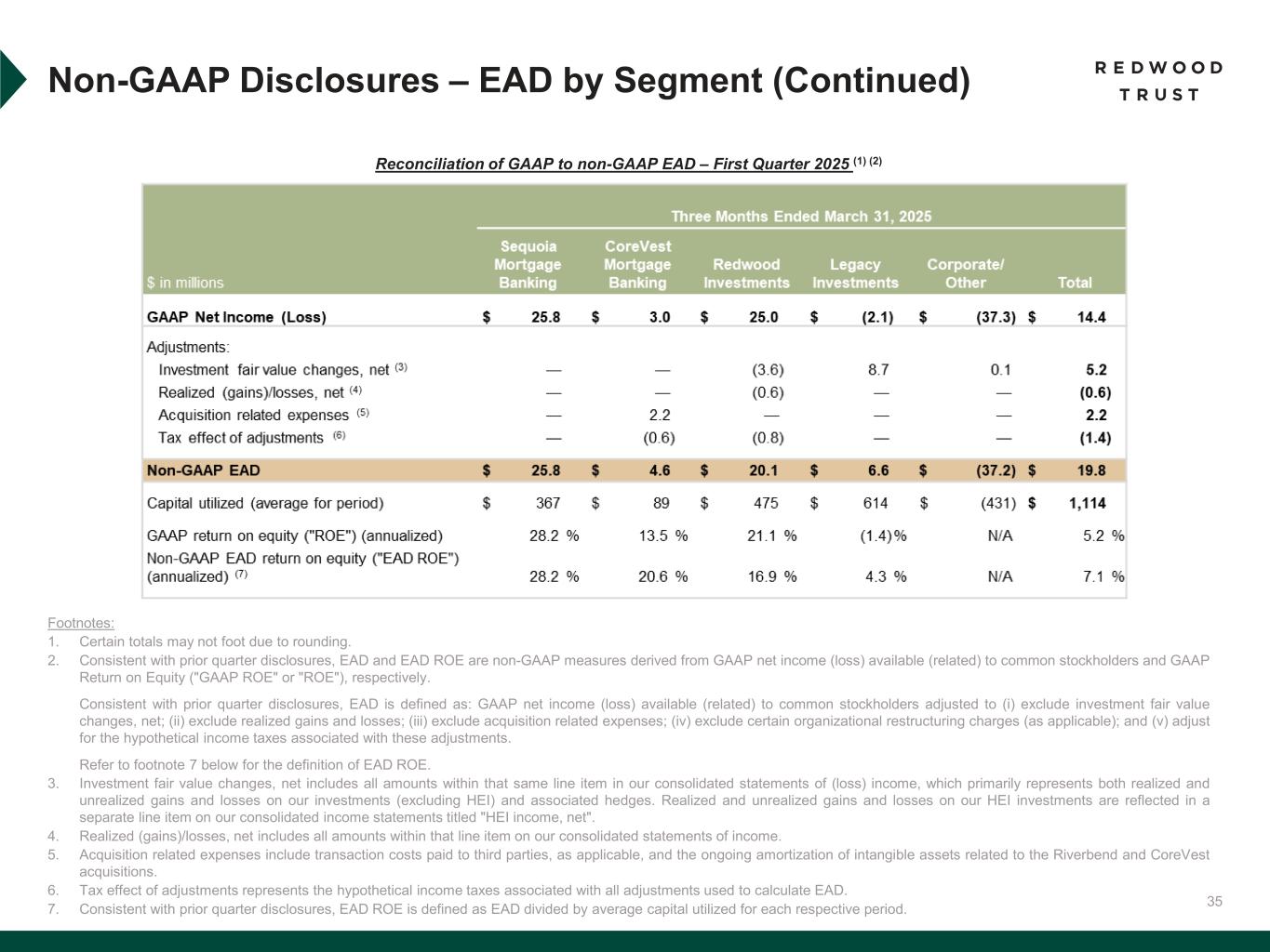 30 To supplement consolidated and segment financial information prepared and presented in accordance with U.S. generally accepted accounting principles ("GAAP"), the Company also provides the following non-GAAP measures: • Core Segments Earnings Available for Distribution (“Core Segments EAD”) • Earnings Available for Distribution (“EAD”) Management believes these non-GAAP measures provide supplemental information to assist management and investors in analyzing the Company’s results of operations and help facilitate comparisons to industry peers. Management also believes that these non-GAAP measures are metrics that can supplement its analysis of the Company’s ability to pay dividends, by providing an indication of the current income generating capacity of the Company's operating platforms as of the quarter being presented. In addition, management believes its new non-GAAP Core Segments EAD measure provide supplemental information to assist management and investors in analyzing the Company’s expedited transition to the scalable and simplified capital-efficient business model, which includes an accelerated wind-down of legacy portfolio holdings within its newly-established Legacy Investments segment. These non-GAAP measures should not be utilized in isolation, nor should they be considered as an alternative to GAAP net income (loss) available (related) to common stockholders, GAAP ROE or other measurements of results of operations computed in accordance with GAAP or for federal income tax purposes. Core Segments EAD. Core Segments EAD and Core Segments EAD ROE are new non-GAAP measures established in the second quarter 2025 and are used to present management’s non-GAAP analysis (based on its non-GAAP Earnings Available for Distribution (“EAD”) measure further described below) of the combined performance the Company’s mortgage banking platforms and related investments (which consist of the Company’s Sequoia Mortgage Banking, CoreVest Mortgage Banking and Redwood Investments segments and are defined as the Company’s “Core Segments”, inclusive of an allocated portion of the Company’s Corporate segment relating to those segments). • Core Segments EAD excludes the Company’s Legacy Investments segment and excludes an allocated portion of the Company’s Corporate segment relating to the Legacy Investments segment. • Core Segments EAD per basic common share and Core Segments EAD ROE are also new non-GAAP measures established in the second quarter 2025 and are calculated using Core Segments EAD. • Core Segments EAD ROE is defined as Core Segments EAD divided by average capital attributable to Core Segments. A further discussion of Core Segments EAD and a reconciliation of our non-GAAP Core Segments EAD measures to comparable GAAP measures is set forth below under the heading “Reconciliation of GAAP to non-GAAP Core Segments EAD”. Non-GAAP Disclosures
