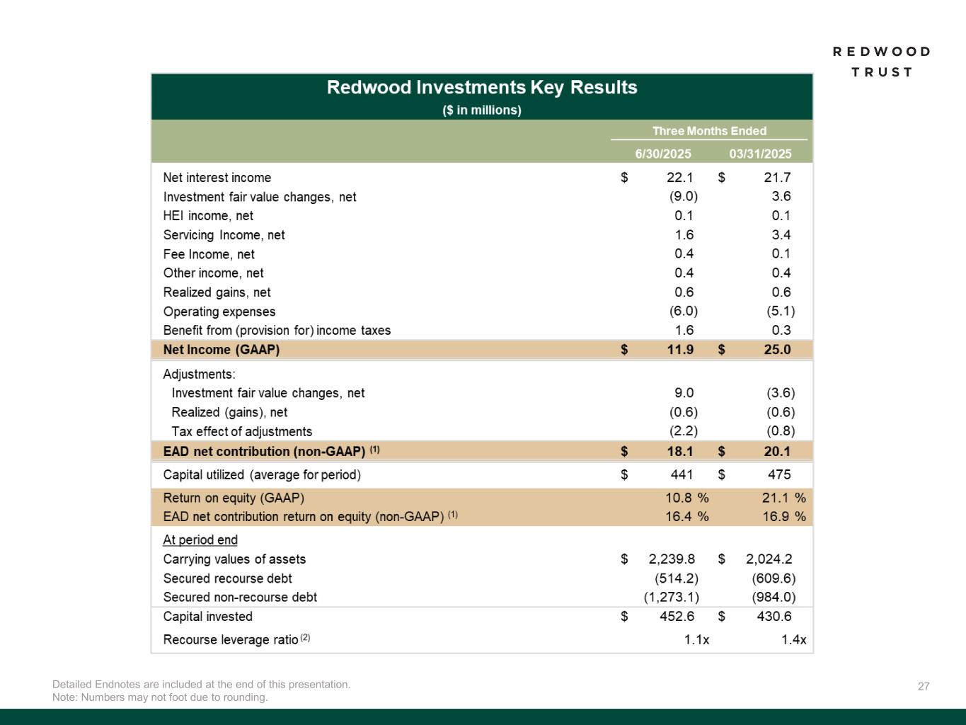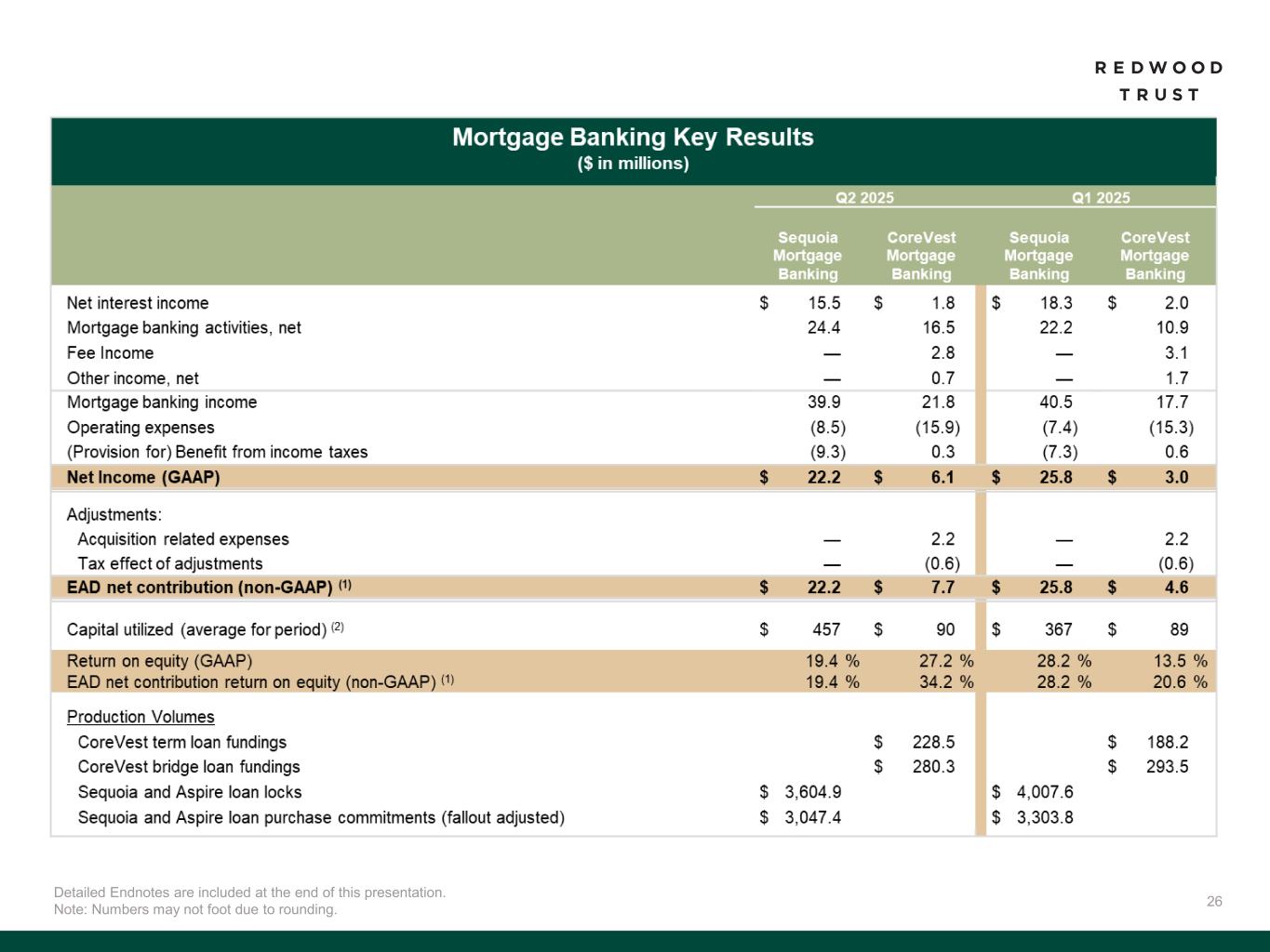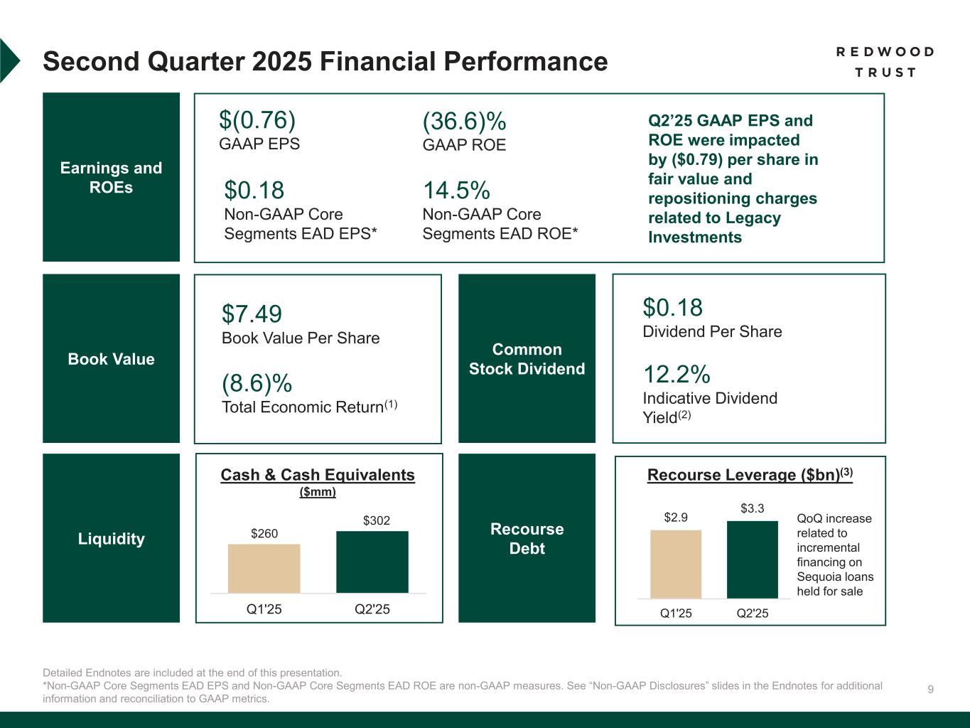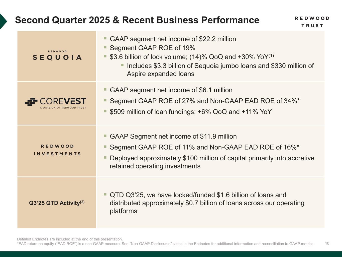 30 To supplement consolidated and segment financial information prepared and presented in accordance with U.S. generally accepted accounting principles ("GAAP"), the Company also provides the following non-GAAP measures: • Core Segments Earnings Available for Distribution (“Core Segments EAD”) • Earnings Available for Distribution (“EAD”) Management believes these non-GAAP measures provide supplemental information to assist management and investors in analyzing the Company’s results of operations and help facilitate comparisons to industry peers. Management also believes that these non-GAAP measures are metrics that can supplement its analysis of the Company’s ability to pay dividends, by providing an indication of the current income generating capacity of the Company's operating platforms as of the quarter being presented. In addition, management believes its new non-GAAP Core Segments EAD measure provide supplemental information to assist management and investors in analyzing the Company’s expedited transition to the scalable and simplified capital-efficient business model, which includes an accelerated wind-down of legacy portfolio holdings within its newly-established Legacy Investments segment. These non-GAAP measures should not be utilized in isolation, nor should they be considered as an alternative to GAAP net income (loss) available (related) to common stockholders, GAAP ROE or other measurements of results of operations computed in accordance with GAAP or for federal income tax purposes. Core Segments EAD. Core Segments EAD and Core Segments EAD ROE are new non-GAAP measures established in the second quarter 2025 and are used to present management’s non-GAAP analysis (based on its non-GAAP Earnings Available for Distribution (“EAD”) measure further described below) of the combined performance the Company’s mortgage banking platforms and related investments (which consist of the Company’s Sequoia Mortgage Banking, CoreVest Mortgage Banking and Redwood Investments segments and are defined as the Company’s “Core Segments”, inclusive of an allocated portion of the Company’s Corporate segment relating to those segments). • Core Segments EAD excludes the Company’s Legacy Investments segment and excludes an allocated portion of the Company’s Corporate segment relating to the Legacy Investments segment. • Core Segments EAD per basic common share and Core Segments EAD ROE are also new non-GAAP measures established in the second quarter 2025 and are calculated using Core Segments EAD. • Core Segments EAD ROE is defined as Core Segments EAD divided by average capital attributable to Core Segments. A further discussion of Core Segments EAD and a reconciliation of our non-GAAP Core Segments EAD measures to comparable GAAP measures is set forth below under the heading “Reconciliation of GAAP to non-GAAP Core Segments EAD”. Non-GAAP Disclosures