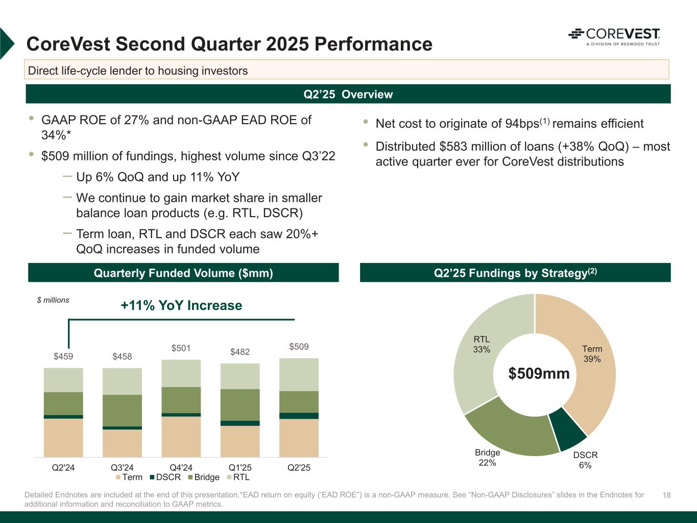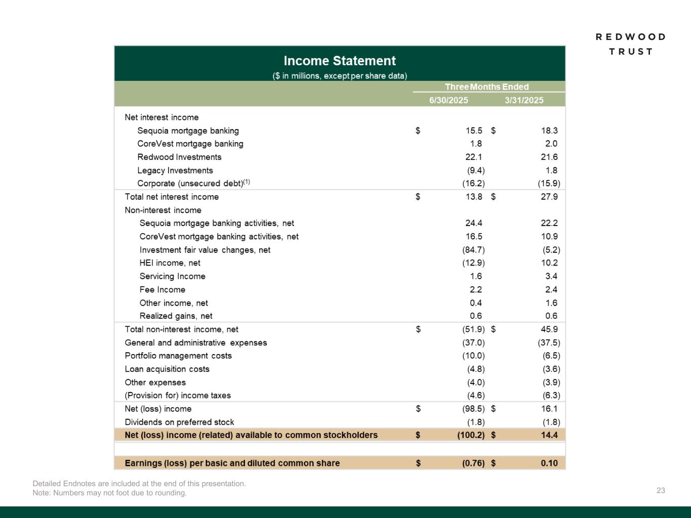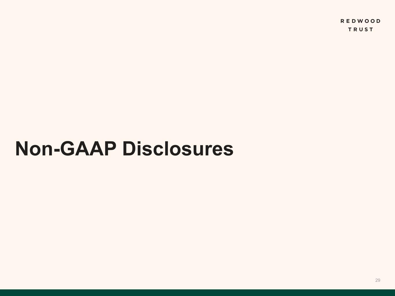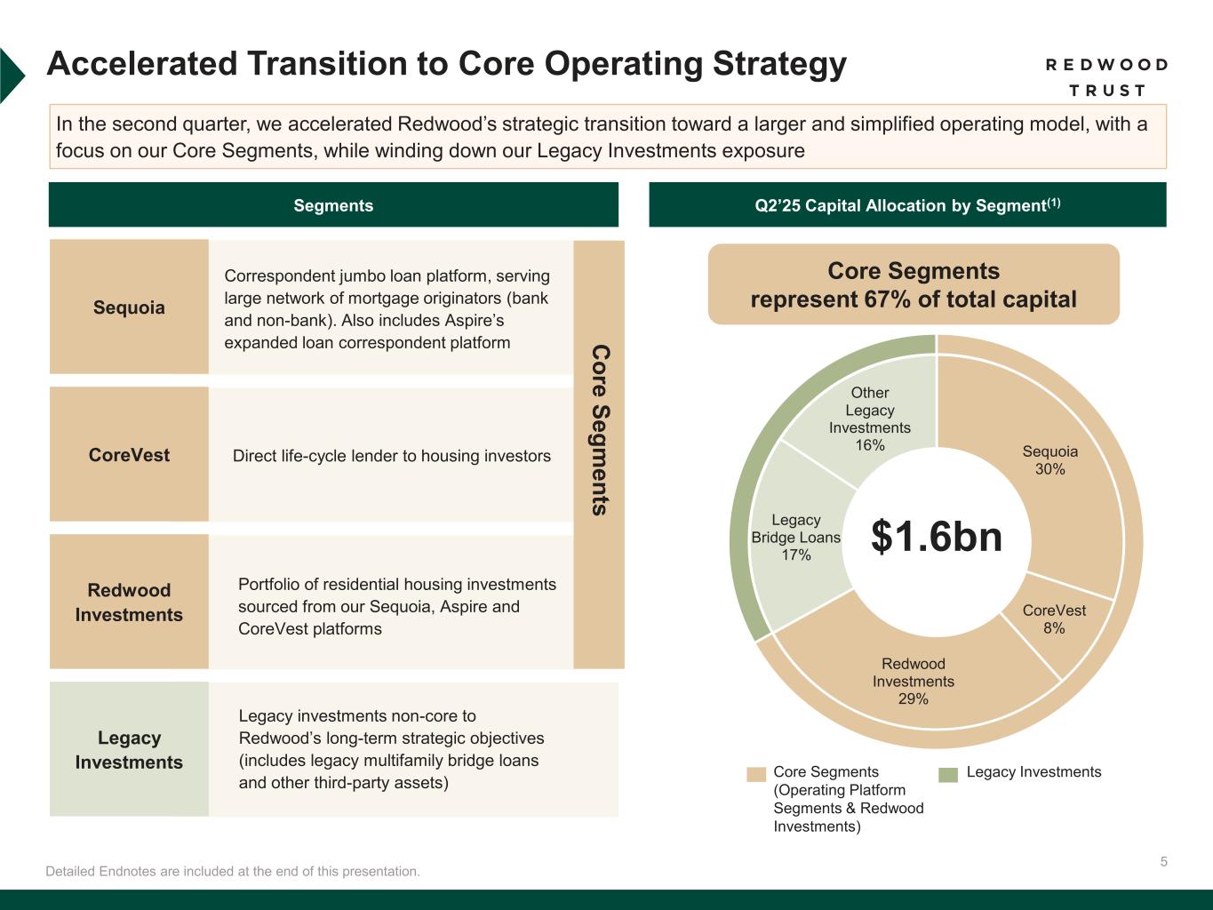 30 To supplement consolidated and segment financial information prepared and presented in accordance with U.S. generally accepted accounting principles ("GAAP"), the Company also provides the following non-GAAP measures: • Core Segments Earnings Available for Distribution (“Core Segments EAD”) • Earnings Available for Distribution (“EAD”) Management believes these non-GAAP measures provide supplemental information to assist management and investors in analyzing the Company’s results of operations and help facilitate comparisons to industry peers. Management also believes that these non-GAAP measures are metrics that can supplement its analysis of the Company’s ability to pay dividends, by providing an indication of the current income generating capacity of the Company's operating platforms as of the quarter being presented. In addition, management believes its new non-GAAP Core Segments EAD measure provide supplemental information to assist management and investors in analyzing the Company’s expedited transition to the scalable and simplified capital-efficient business model, which includes an accelerated wind-down of legacy portfolio holdings within its newly-established Legacy Investments segment. These non-GAAP measures should not be utilized in isolation, nor should they be considered as an alternative to GAAP net income (loss) available (related) to common stockholders, GAAP ROE or other measurements of results of operations computed in accordance with GAAP or for federal income tax purposes. Core Segments EAD. Core Segments EAD and Core Segments EAD ROE are new non-GAAP measures established in the second quarter 2025 and are used to present management’s non-GAAP analysis (based on its non-GAAP Earnings Available for Distribution (“EAD”) measure further described below) of the combined performance the Company’s mortgage banking platforms and related investments (which consist of the Company’s Sequoia Mortgage Banking, CoreVest Mortgage Banking and Redwood Investments segments and are defined as the Company’s “Core Segments”, inclusive of an allocated portion of the Company’s Corporate segment relating to those segments). • Core Segments EAD excludes the Company’s Legacy Investments segment and excludes an allocated portion of the Company’s Corporate segment relating to the Legacy Investments segment. • Core Segments EAD per basic common share and Core Segments EAD ROE are also new non-GAAP measures established in the second quarter 2025 and are calculated using Core Segments EAD. • Core Segments EAD ROE is defined as Core Segments EAD divided by average capital attributable to Core Segments. A further discussion of Core Segments EAD and a reconciliation of our non-GAAP Core Segments EAD measures to comparable GAAP measures is set forth below under the heading “Reconciliation of GAAP to non-GAAP Core Segments EAD”. Non-GAAP Disclosures
