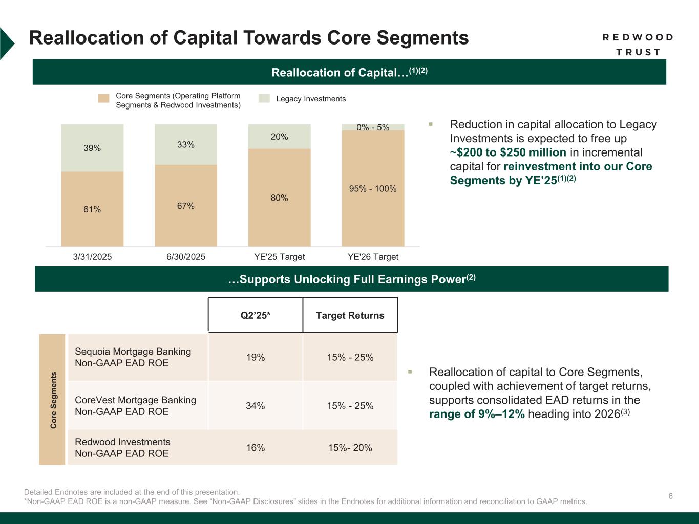 5 Sequoia 30% CoreVest 8% Redwood Investments 29% Legacy Bridge Loans 17% Other Legacy Investments 16% Detailed Endnotes are included at the end of this presentation. Accelerated Transition to Core Operating Strategy In the second quarter, we accelerated Redwood’s strategic transition toward a larger and simplified operating model, with a focus on our Core Segments, while winding down our Legacy Investments exposure $1.6bn Q2’25 Capital Allocation by Segment(1) Sequoia CoreVest Redwood Investments Legacy Investments Correspondent jumbo loan platform, serving large network of mortgage originators (bank and non-bank). Also includes Aspire’s expanded loan correspondent platform Direct life-cycle lender to housing investors Portfolio of residential housing investments sourced from our Sequoia, Aspire and CoreVest platforms Legacy investments non-core to Redwood’s long-term strategic objectives (includes legacy multifamily bridge loans and other third-party assets) Segments Core Segments (Operating Platform Segments & Redwood Investments) Legacy Investments C o re S e g m e n ts Core Segments represent 67% of total capital