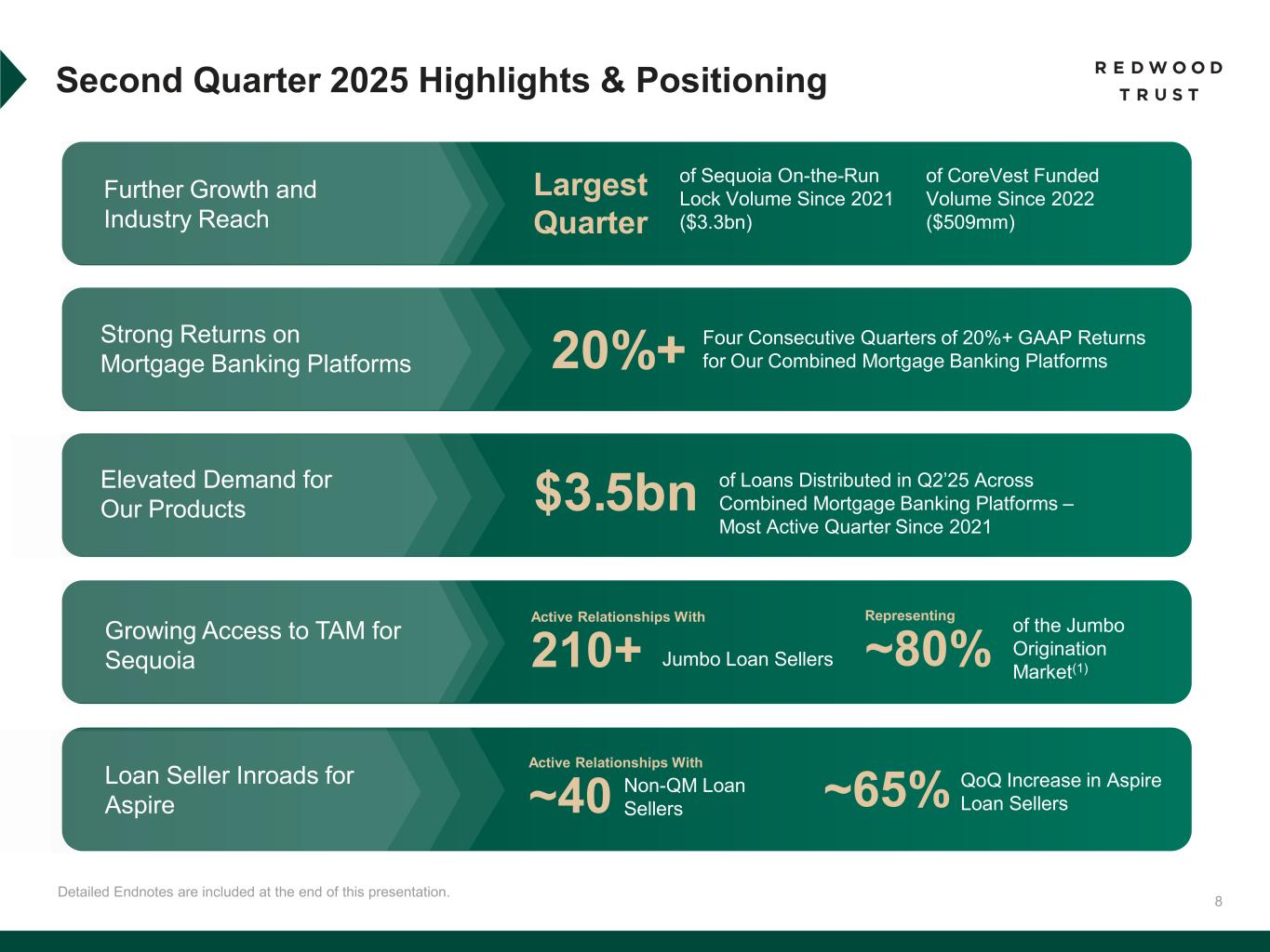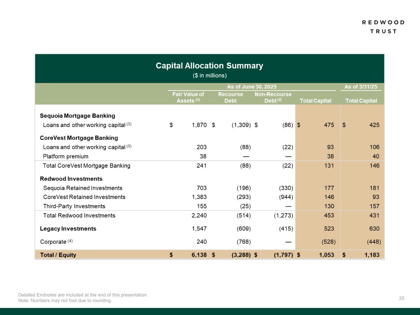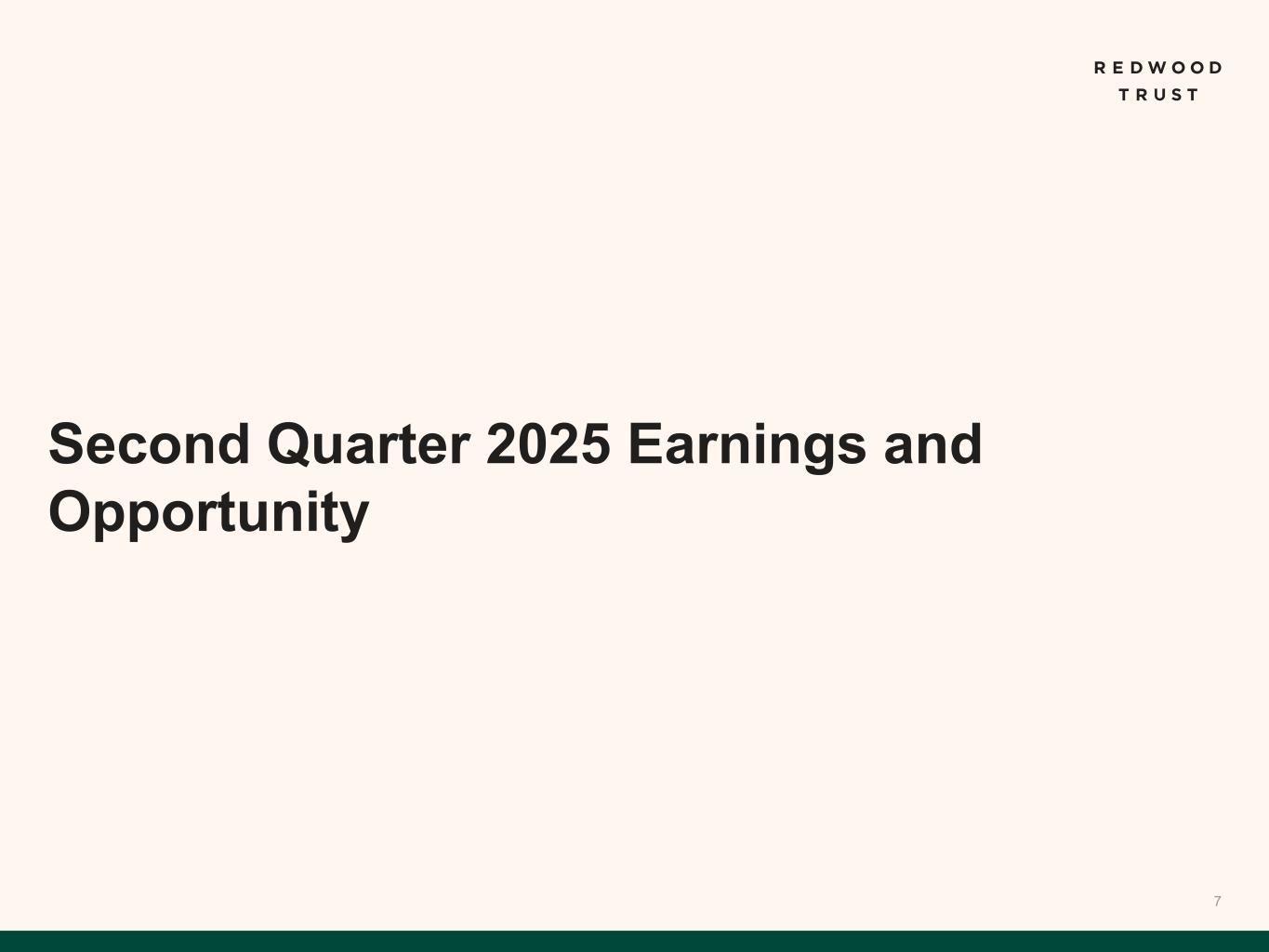 6 Reallocation of Capital Towards Core Segments Detailed Endnotes are included at the end of this presentation. *Non-GAAP EAD ROE is a non-GAAP measure. See “Non-GAAP Disclosures” slides in the Endnotes for additional information and reconciliation to GAAP metrics. …Supports Unlocking Full Earnings Power(2) ▪ Reallocation of capital to Core Segments, coupled with achievement of target returns, supports consolidated EAD returns in the range of 9%–12% heading into 2026(3) Q2’25* Target Returns Sequoia Mortgage Banking Non-GAAP EAD ROE 19% 15% - 25% CoreVest Mortgage Banking Non-GAAP EAD ROE 34% 15% - 25% Redwood Investments Non-GAAP EAD ROE 16% 15%- 20% Reallocation of Capital…(1)(2) ▪ Reduction in capital allocation to Legacy Investments is expected to free up ~$200 to $250 million in incremental capital for reinvestment into our Core Segments by YE’25(1)(2) Legacy InvestmentsCore Segments (Operating Platform Segments & Redwood Investments) C o re S e g m e n ts 61% 67% 80% 95% - 100% 39% 33% 20% 0% - 5% 3/31/2025 6/30/2025 YE'25 Target YE'26 Target