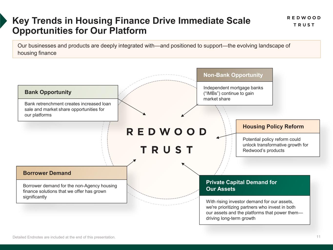 10 ▪ GAAP segment net income of $22.2 million ▪ Segment GAAP ROE of 19% ▪ $3.6 billion of lock volume; (14)% QoQ and +30% YoY(1) ▪ Includes $3.3 billion of Sequoia jumbo loans and $330 million of Aspire expanded loans ▪ GAAP segment net income of $6.1 million ▪ Segment GAAP ROE of 27% and Non-GAAP EAD ROE of 34%* ▪ $509 million of loan fundings; +6% QoQ and +11% YoY ▪ GAAP Segment net income of $11.9 million ▪ Segment GAAP ROE of 11% and Non-GAAP EAD ROE of 16%* ▪ Deployed approximately $100 million of capital primarily into accretive retained operating investments Q3’25 QTD Activity(2) ▪ QTD Q3’25, we have locked/funded $1.6 billion of loans and distributed approximately $0.7 billion of loans across our operating platforms Second Quarter 2025 & Recent Business Performance Detailed Endnotes are included at the end of this presentation. *EAD return on equity (“EAD ROE”) is a non-GAAP measure. See “Non-GAAP Disclosures” slides in the Endnotes for additional information and reconciliation to GAAP metrics.
