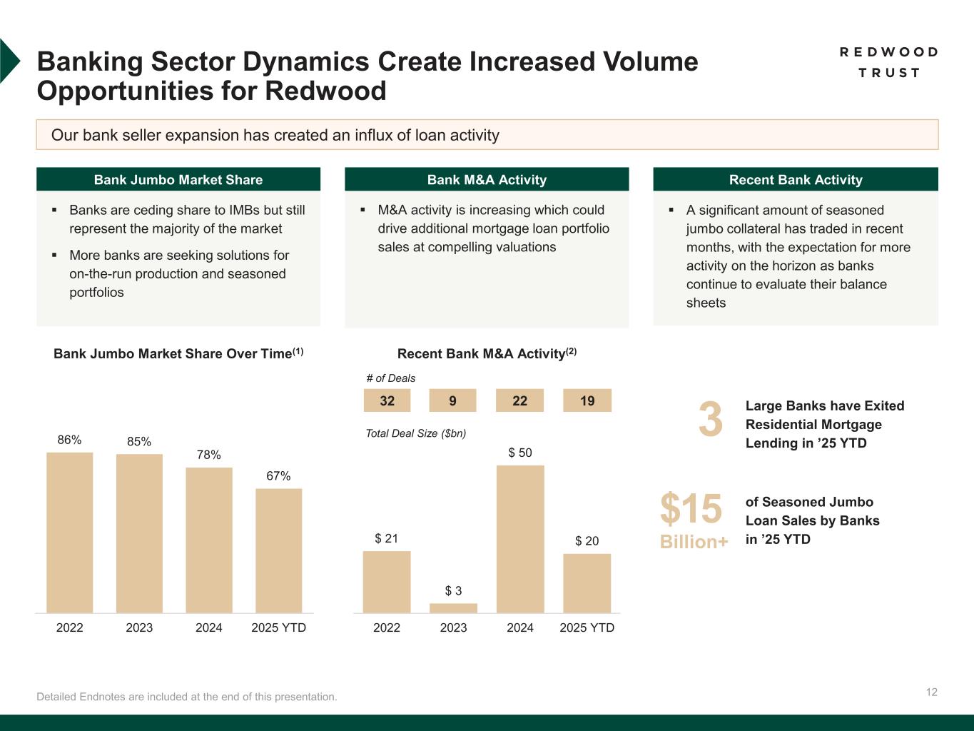 11 Key Trends in Housing Finance Drive Immediate Scale Opportunities for Our Platform Our businesses and products are deeply integrated with—and positioned to support—the evolving landscape of housing finance Detailed Endnotes are included at the end of this presentation. Borrower demand for the non-Agency housing finance solutions that we offer has grown significantly With rising investor demand for our assets, we're prioritizing partners who invest in both our assets and the platforms that power them— driving long-term growth Potential policy reform could unlock transformative growth for Redwood’s products Independent mortgage banks (“IMBs”) continue to gain market share Bank retrenchment creates increased loan sale and market share opportunities for our platforms Borrower Demand Private Capital Demand for Our Assets Housing Policy Reform Non-Bank Opportunity Bank Opportunity