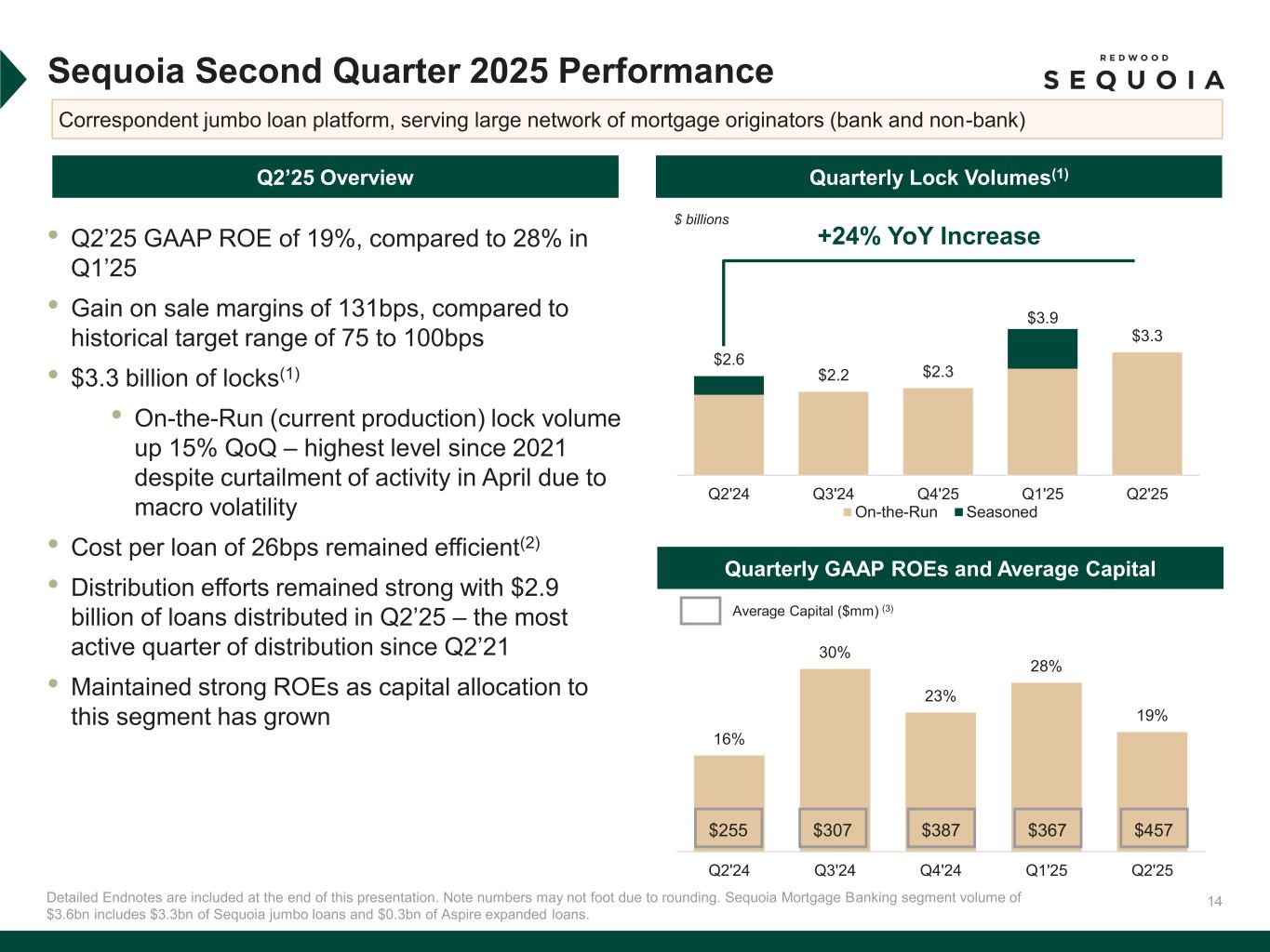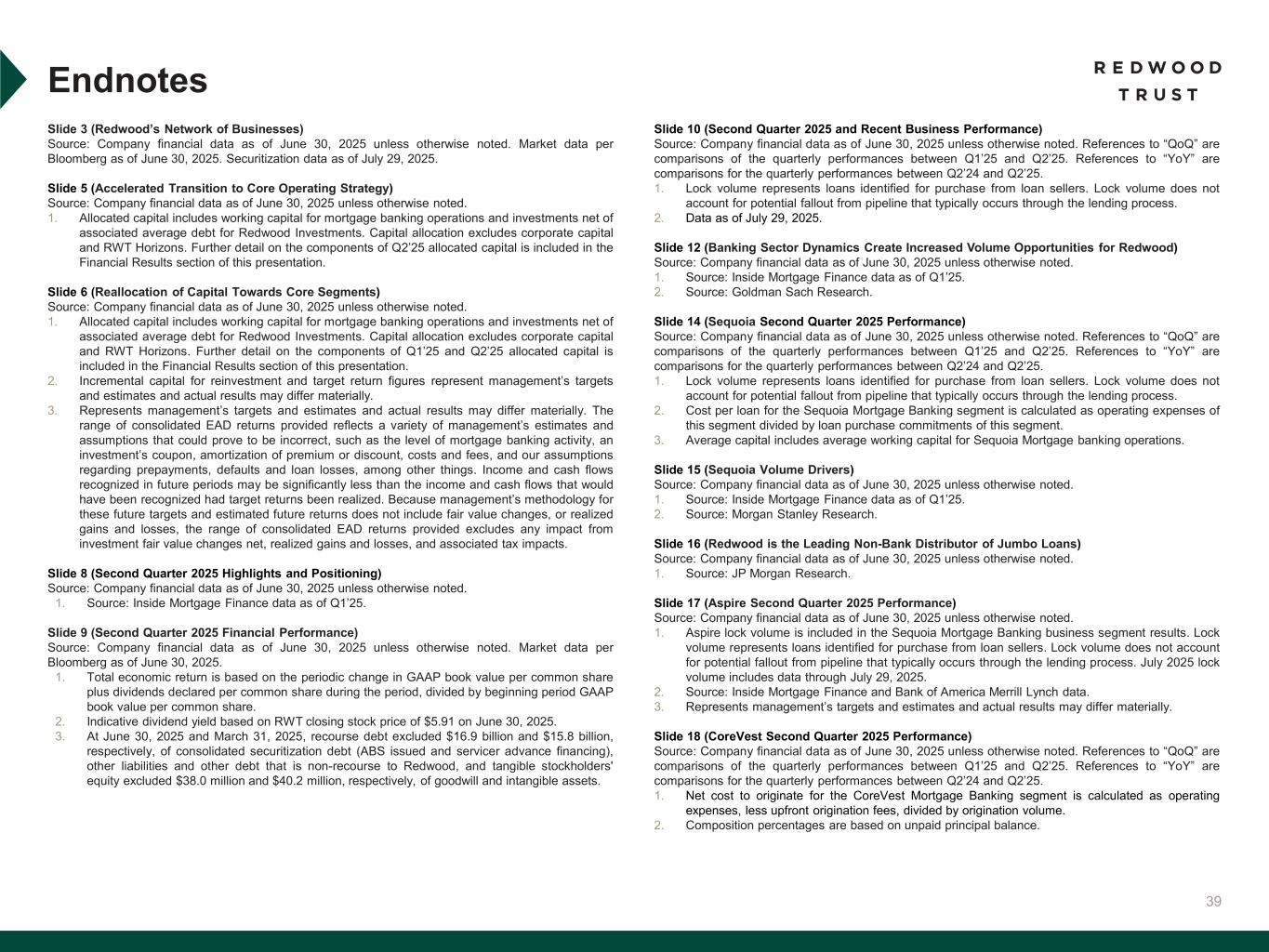 39 Slide 3 (Redwood’s Network of Businesses)​ Source: Company financial data as of June 30, 2025 unless otherwise noted. Market data per Bloomberg as of June 30, 2025. Securitization data as of July 29, 2025. Slide 5 (Accelerated Transition to Core Operating Strategy)​ Source: Company financial data as of June 30, 2025 unless otherwise noted. 1. Allocated capital includes working capital for mortgage banking operations and investments net of associated average debt for Redwood Investments. Capital allocation excludes corporate capital and RWT Horizons. Further detail on the components of Q2’25 allocated capital is included in the Financial Results section of this presentation. Slide 6 (Reallocation of Capital Towards Core Segments)​ Source: Company financial data as of June 30, 2025 unless otherwise noted. 1. Allocated capital includes working capital for mortgage banking operations and investments net of associated average debt for Redwood Investments. Capital allocation excludes corporate capital and RWT Horizons. Further detail on the components of Q1’25 and Q2’25 allocated capital is included in the Financial Results section of this presentation. 2. Incremental capital for reinvestment and target return figures represent management’s targets and estimates and actual results may differ materially. 3. Represents management’s targets and estimates and actual results may differ materially. The range of consolidated EAD returns provided reflects a variety of management’s estimates and assumptions that could prove to be incorrect, such as the level of mortgage banking activity, an investment’s coupon, amortization of premium or discount, costs and fees, and our assumptions regarding prepayments, defaults and loan losses, among other things. Income and cash flows recognized in future periods may be significantly less than the income and cash flows that would have been recognized had target returns been realized. Because management’s methodology for these future targets and estimated future returns does not include fair value changes, or realized gains and losses, the range of consolidated EAD returns provided excludes any impact from investment fair value changes net, realized gains and losses, and associated tax impacts. Slide 8 (Second Quarter 2025 Highlights and Positioning)​ Source: Company financial data as of June 30, 2025 unless otherwise noted. 1. Source: Inside Mortgage Finance data as of Q1’25. Slide 9 (Second Quarter 2025 Financial Performance)​ Source: Company financial data as of June 30, 2025 unless otherwise noted. Market data per Bloomberg as of June 30, 2025. 1. Total economic return is based on the periodic change in GAAP book value per common share plus dividends declared per common share during the period, divided by beginning period GAAP book value per common share. 2. Indicative dividend yield based on RWT closing stock price of $5.91 on June 30, 2025. 3. At June 30, 2025 and March 31, 2025, recourse debt excluded $16.9 billion and $15.8 billion, respectively, of consolidated securitization debt (ABS issued and servicer advance financing), other liabilities and other debt that is non-recourse to Redwood, and tangible stockholders' equity excluded $38.0 million and $40.2 million, respectively, of goodwill and intangible assets. Endnotes Slide 10 (Second Quarter 2025 and Recent Business Performance)​ Source: Company financial data as of June 30, 2025 unless otherwise noted. References to “QoQ” are comparisons of the quarterly performances between Q1’25 and Q2’25. References to “YoY” are comparisons for the quarterly performances between Q2’24 and Q2’25. 1. Lock volume represents loans identified for purchase from loan sellers. Lock volume does not account for potential fallout from pipeline that typically occurs through the lending process. 2. Data as of July 29, 2025. Slide 12 (Banking Sector Dynamics Create Increased Volume Opportunities for Redwood)​ Source: Company financial data as of June 30, 2025 unless otherwise noted. 1. Source: Inside Mortgage Finance data as of Q1’25. 2. Source: Goldman Sach Research. Slide 14 (Sequoia Second Quarter 2025 Performance)​ Source: Company financial data as of June 30, 2025 unless otherwise noted. References to “QoQ” are comparisons of the quarterly performances between Q1’25 and Q2’25. References to “YoY” are comparisons for the quarterly performances between Q2’24 and Q2’25. 1. Lock volume represents loans identified for purchase from loan sellers. Lock volume does not account for potential fallout from pipeline that typically occurs through the lending process. 2. Cost per loan for the Sequoia Mortgage Banking segment is calculated as operating expenses of this segment divided by loan purchase commitments of this segment. 3. Average capital includes average working capital for Sequoia Mortgage banking operations. Slide 15 (Sequoia Volume Drivers)​ Source: Company financial data as of June 30, 2025 unless otherwise noted. 1. Source: Inside Mortgage Finance data as of Q1’25. 2. Source: Morgan Stanley Research. Slide 16 (Redwood is the Leading Non-Bank Distributor of Jumbo Loans)​ Source: Company financial data as of June 30, 2025 unless otherwise noted. 1. Source: JP Morgan Research. Slide 17 (Aspire Second Quarter 2025 Performance)​ Source: Company financial data as of June 30, 2025 unless otherwise noted. 1. Aspire lock volume is included in the Sequoia Mortgage Banking business segment results. Lock volume represents loans identified for purchase from loan sellers. Lock volume does not account for potential fallout from pipeline that typically occurs through the lending process. July 2025 lock volume includes data through July 29, 2025. 2. Source: Inside Mortgage Finance and Bank of America Merrill Lynch data. 3. Represents management’s targets and estimates and actual results may differ materially. Slide 18 (CoreVest Second Quarter 2025 Performance