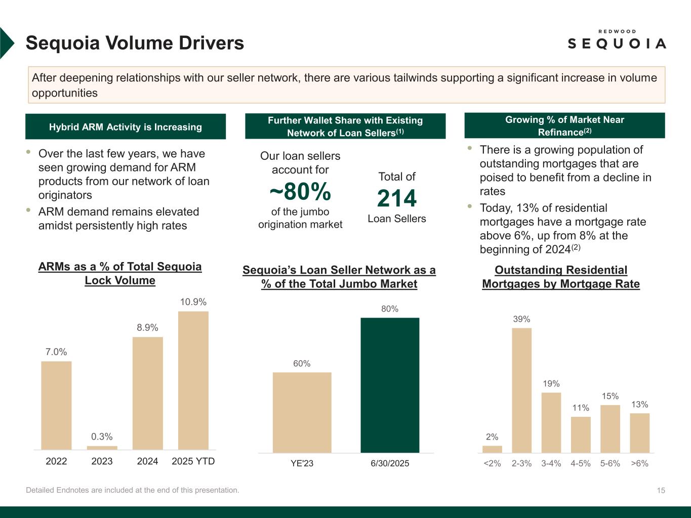 14 16% 30% 23% 28% 19% Q2'24 Q3'24 Q4'24 Q1'25 Q2'25 Detailed Endnotes are included at the end of this presentation. Note numbers may not foot due to rounding. Sequoia Mortgage Banking segment volume of $3.6bn includes $3.3bn of Sequoia jumbo loans and $0.3bn of Aspire expanded loans. Sequoia Second Quarter 2025 Performance Quarterly Lock Volumes(1) $ billions • Q2’25 GAAP ROE of 19%, compared to 28% in Q1’25 • Gain on sale margins of 131bps, compared to historical target range of 75 to 100bps • $3.3 billion of locks(1) • On-the-Run (current production) lock volume up 15% QoQ – highest level since 2021 despite curtailment of activity in April due to macro volatility • Cost per loan of 26bps remained efficient(2) • Distribution efforts remained strong with $2.9 billion of loans distributed in Q2’25 – the most active quarter of distribution since Q2’21 • Maintained strong ROEs as capital allocation to this segment has grown Q2’25 Overview +24% YoY Increase Correspondent jumbo loan platform, serving large network of mortgage originators (bank and non-bank) Quarterly GAAP ROEs and Average Capital $2.6 $2.2 $2.3 $3.9 $3.3 Q2'24 Q3'24 Q4'25 Q1'25 Q2'25 On-the-Run Seasoned $255 $307 $387 $367 $457 Average Capital ($mm) (3)