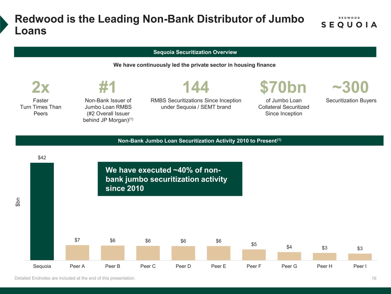 15Detailed Endnotes are included at the end of this presentation. Sequoia Volume Drivers After deepening relationships with our seller network, there are various tailwinds supporting a significant increase in volume opportunities Hybrid ARM Activity is Increasing Growing % of Market Near Refinance(2) • Over the last few years, we have seen growing demand for ARM products from our network of loan originators • ARM demand remains elevated amidst persistently high rates • There is a growing population of outstanding mortgages that are poised to benefit from a decline in rates • Today, 13% of residential mortgages have a mortgage rate above 6%, up from 8% at the beginning of 2024(2) ARMs as a % of Total Sequoia Lock Volume 7.0% 0.3% 8.9% 10.9% 2022 2023 2024 2025 YTD Further Wallet Share with Existing Network of Loan Sellers(1) Our loan sellers account for ~80% of the jumbo origination market 60% 80% YE'23 6/30/2025 2% 39% 19% 11% 15% 13% <2% 2-3% 3-4% 4-5% 5-6% >6% Outstanding Residential Mortgages by Mortgage Rate Sequoia’s Loan Seller Network as a % of the Total Jumbo Market Total of 214 Loan Sellers
