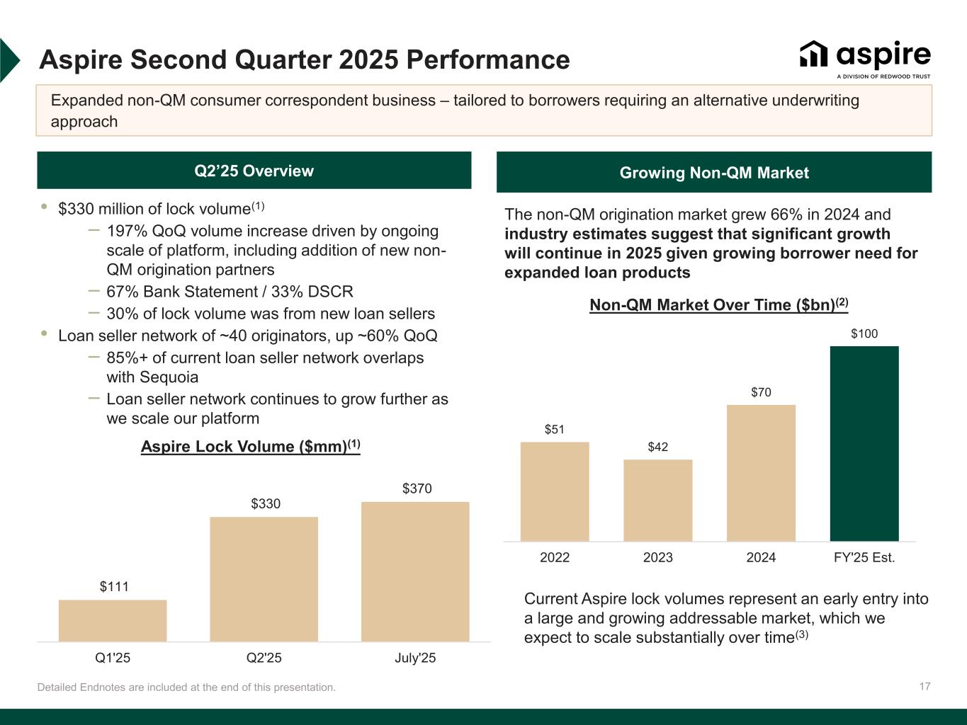 8 Second Quarter 2025 Highlights & Positioning Detailed Endnotes are included at the end of this presentation. Loan Seller Inroads for Aspire ~65% QoQ Increase in Aspire Loan Sellers $3.5bn of Loans Distributed in Q2’25 Across Combined Mortgage Banking Platforms – Most Active Quarter Since 2021 Elevated Demand for Our Products Growing Access to TAM for Sequoia Active Relationships With 210+ Jumbo Loan Sellers Further Growth and Industry Reach Largest Quarter of Sequoia On-the-Run Lock Volume Since 2021 ($3.3bn) of CoreVest Funded Volume Since 2022 ($509mm) 20%+ Four Consecutive Quarters of 20%+ GAAP Returns for Our Combined Mortgage Banking Platforms Strong Returns on Mortgage Banking Platforms Active Relationships With ~40 Non-QM Loan Sellers Representing ~80% of the Jumbo Origination Market(1)