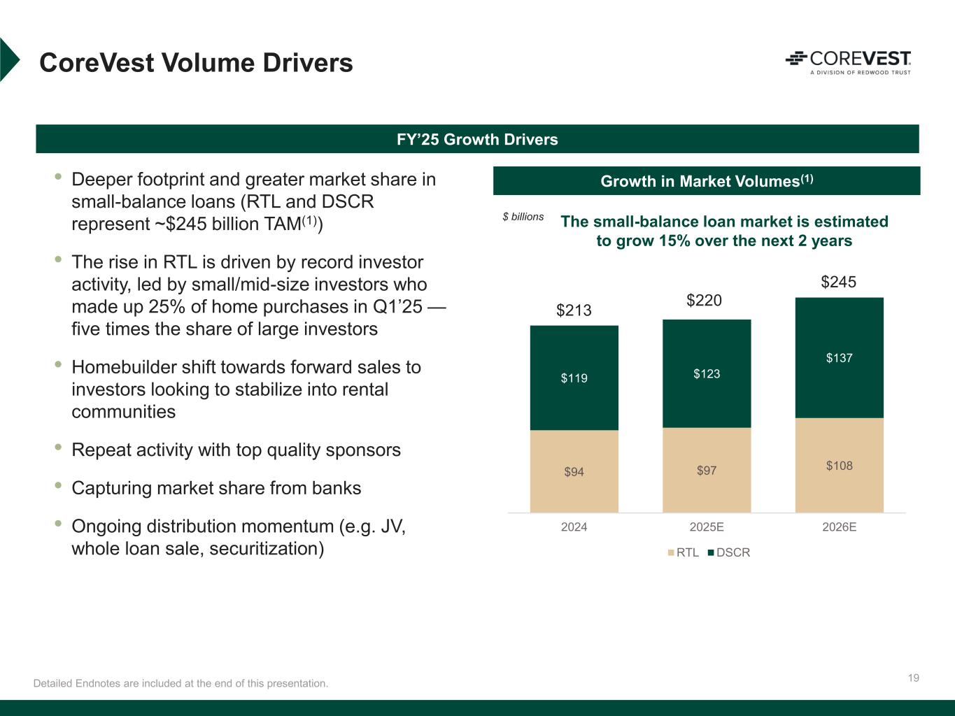 18 • GAAP ROE of 27% and non-GAAP EAD ROE of 34%* • $509 million of fundings, highest volume since Q3’22 – Up 6% QoQ and up 11% YoY – We continue to gain market share in smaller balance loan products (e.g. RTL, DSCR) – Term loan, RTL and DSCR each saw 20%+ QoQ increases in funded volume CoreVest Second Quarter 2025 Performance Q2’25 Overview Quarterly Funded Volume ($mm) Detailed Endnotes are included at the end of this presentation.*EAD return on equity (‘EAD ROE”) is a non-GAAP measure. See “Non-GAAP Disclosures” slides in the Endnotes for additional information and reconciliation to GAAP metrics. +11% YoY Increase $ millions Q2’25 Fundings by Strategy(2) • Net cost to originate of 94bps(1) remains efficient • Distributed $583 million of loans (+38% QoQ) – most active quarter ever for CoreVest distributions Direct life-cycle lender to housing investors $509mm $459 $458 $501 $482 $509 Q2'24 Q3'24 Q4'24 Q1'25 Q2'25 Term DSCR Bridge RTL Term 39% DSCR 6% Bridge 22% RTL 33%