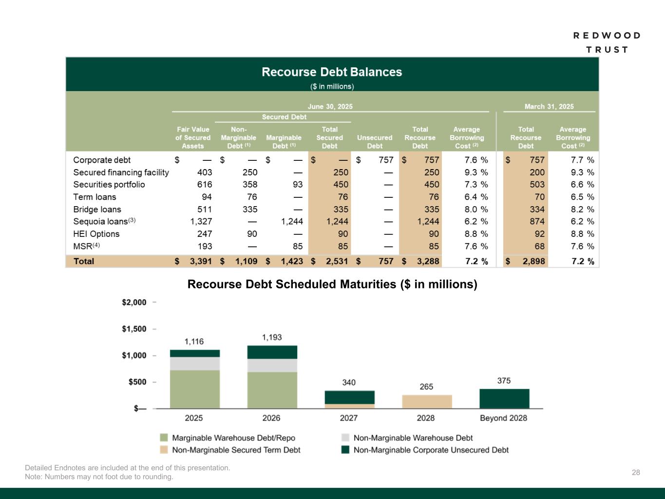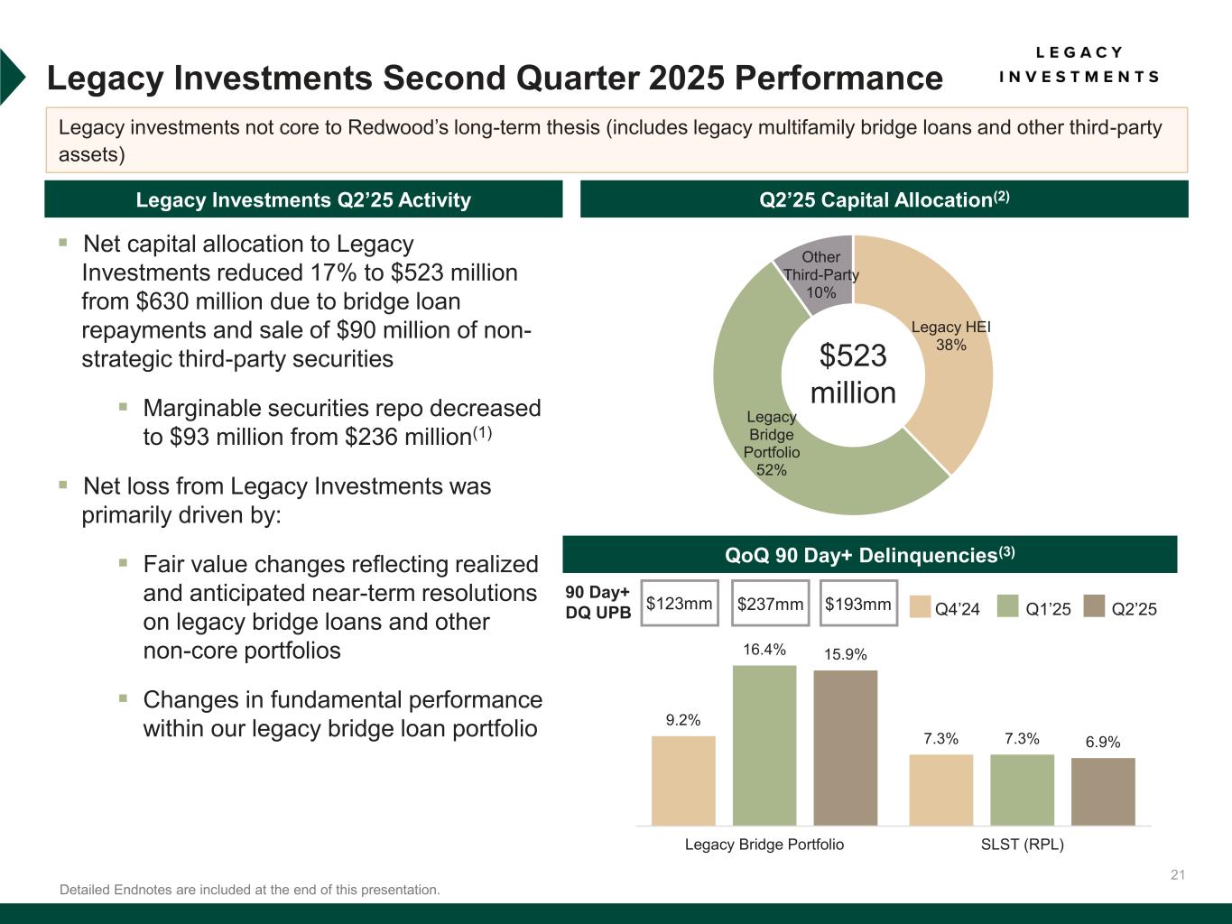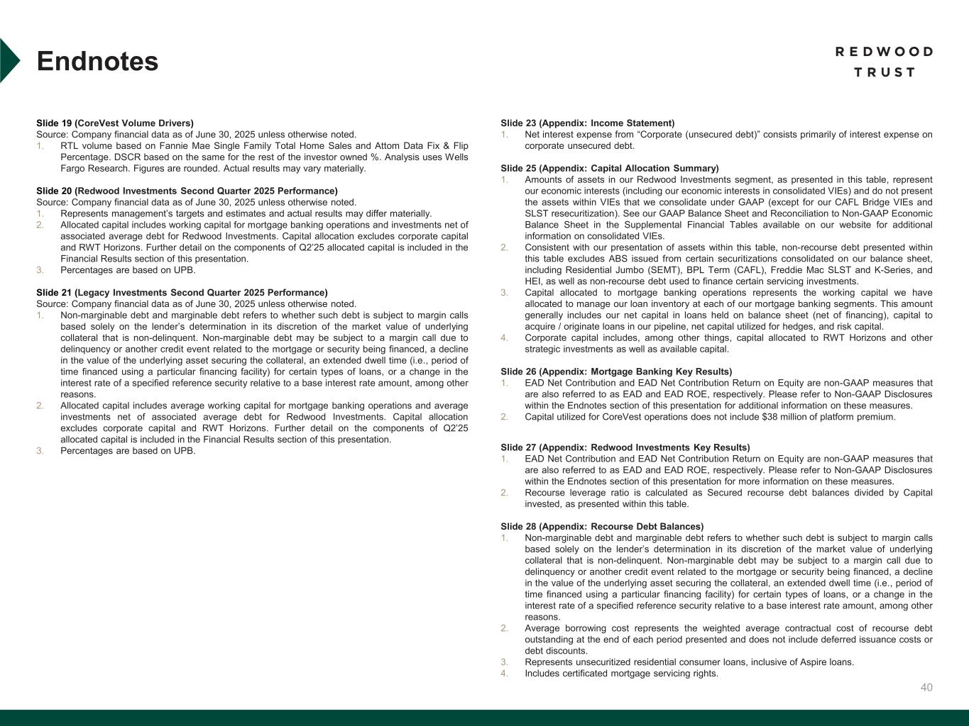 40 Endnotes Slide 23 (Appendix: Income Statement) 1. Net interest expense from “Corporate (unsecured debt)” consists primarily of interest expense on corporate unsecured debt. Slide 25 (Appendix: Capital Allocation Summary) 1. Amounts of assets in our Redwood Investments segment, as presented in this table, represent our economic interests (including our economic interests in consolidated VIEs) and do not present the assets within VIEs that we consolidate under GAAP (except for our CAFL Bridge VIEs and SLST resecuritization). See our GAAP Balance Sheet and Reconciliation to Non-GAAP Economic Balance Sheet in the Supplemental Financial Tables available on our website for additional information on consolidated VIEs. 2. Consistent with our presentation of assets within this table, non-recourse debt presented within this table excludes ABS issued from certain securitizations consolidated on our balance sheet, including Residential Jumbo (SEMT), BPL Term (CAFL), Freddie Mac SLST and K-Series, and HEI, as well as non-recourse debt used to finance certain servicing investments. 3. Capital allocated to mortgage banking operations represents the working capital we have allocated to manage our loan inventory at each of our mortgage banking segments. This amount generally includes our net capital in loans held on balance sheet (net of financing), capital to acquire / originate loans in our pipeline, net capital utilized for hedges, and risk capital. 4. Corporate capital includes, among other things, capital allocated to RWT Horizons and other strategic investments as well as available capital. Slide 26 (Appendix: Mortgage Banking Key Results) 1. EAD Net Contribution and EAD Net Contribution Return on Equity are non-GAAP measures that are also referred to as EAD and EAD ROE, respectively. Please refer to Non-GAAP Disclosures within the Endnotes section of this presentation for additional information on these measures. 2. Capital utilized for CoreVest operations does not include $38 million of platform premium. Slide 27 (Appendix: Redwood Investments Key Results) 1. EAD Net Contribution and EAD Net Contribution Return on Equity are non-GAAP measures that are also referred to as EAD and EAD ROE, respectively. Please refer to Non-GAAP Disclosures within the Endnotes section of this presentation for more information on these measures. 2. Recourse leverage ratio is calculated as Secured recourse debt balances divided by Capital invested, as presented within this table. Slide 28 (Appendix: Recourse Debt Balances) 1. Non-marginable debt and marginable debt refers to whether such debt is subject to margin calls based solely on the lender’s determination in its discretion of the market value of underlying collateral that is non-delinquent. Non-marginable debt may be subject to a margin call due to delinquency or another credit event related to the mortgage or security being financed, a decline in the value of the underlying asset securing the collateral, an extended dwell time (i.e., period of time financed using a particular financing facility) for certain types of loans, or a change in the interest rate of a specified reference security relative to a base interest rate amount, among other reasons. 2. Average borrowing cost represents the weighted average contractual cost of recourse debt outstanding at the end of each period presented and does not include deferred issuance costs or debt discounts. 3. Represents unsecuritized residential consumer loans, inclusive of Aspire loans. 4. Includes certificated mortgage servicing rights. Slide 19 (CoreVest Volume Drivers)​ Source: Company financial data as of June 30, 2025 unless otherwise noted. 1. RTL volume based on Fannie Mae Single Family Total Home Sales and Attom Data Fix & Flip Percentage. DSCR based on the same for the rest of the investor owned %. Analysis uses Wells Fargo Research. Figures are rounded. Actual results may vary materially. Slide 20 (Redwood Investments Second Quarter 2025 Performance)​ Source: Company financial data as of June 30, 2025 unless otherwise noted. 1. Represents management’s targets and estimates and actual results may differ materially. 2. Allocated capital includes working capital for mortgage banking operations and investments net of associated average debt for Redwood Investments. Capital allocation excludes corporate capital and RWT Horizons. Further detail on the components of Q2’25 allocated capital is included in the Financial Results section of this presentation. 3. Percentages are based on UPB. Slide 21 (Legacy Investments Second Quarter 2025 Performance)​ Source: Company financial data as of June 30, 2025 unless otherwise noted. 1. Non-marginable debt and marginable debt refers to whether such debt is subject to margin calls based solely on the lender’s determination in its discretion of the market value of underlying collateral that is non-delinquent. Non-marginable debt may be subject to a margin call due to delinquency or another credit event related to the mortgage or security being financed, a decline in the value of the underlying asset securing the collateral, an extended dwell time (i.e., period of time financed using a particular financing facility) for certain types of loans, or a change in the interest rate of a specified reference security relative to a base interest rate amount, among other reasons. 2. Allocated capital includes average working capital for mortgage banking operations and average investments net of associated average debt for Redwood Investments. Capital allocation excludes corporate capital and RWT Horizons. Further detail on the components of Q2’25 allocated capital is included in the Financial Results section of this presentation. 3. Percentages are based on UPB.