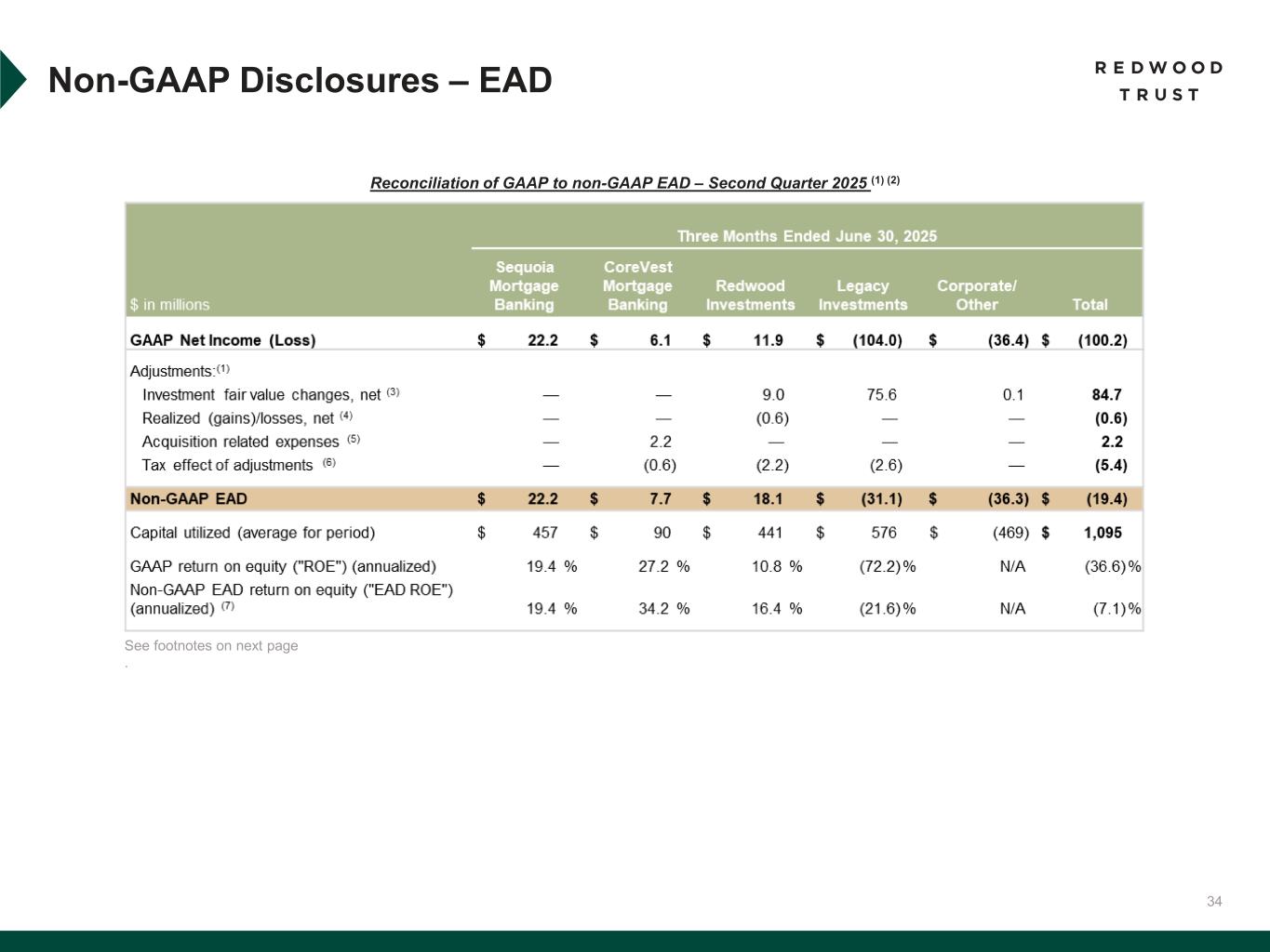 33 Non-GAAP Disclosures – Core Segments EAD (Continued) Footnotes: 1. Certain totals may not foot due to rounding. 2. Core Segments EAD and Core Segments EAD ROE are new non-GAAP measures established in the second quarter 2025 and are used to present management’s non-GAAP analysis of the combined performance the Company’s mortgage banking platforms and related investments (which are defined as "Core Segments" and which consist of the Company’s Sequoia Mortgage Banking, CoreVest Mortgage Banking and Redwood Investments segments), inclusive of an allocated portion of the Company’s Corporate segment relating to those Core Segments. Core Segments EAD excludes the Company’s Legacy Investments segment and excludes an allocated portion of the Company’s Corporate segment relating to the Legacy Investments segment. Core Segments EAD is defined as: GAAP net income (loss) available (related) to common stockholders adjusted to (i) exclude GAAP net loss from the Legacy Investments Segment, (ii) exclude the portion of the Corporate Segment allocation relating to the Legacy Investments segment, (iii) exclude investment fair value changes, net; (iv) exclude realized gains and losses; (v) exclude acquisition related expenses; (vi) exclude certain organizational restructuring charges (as applicable); and (vii) adjust for the hypothetical income taxes associated with these adjustments. Refer to footnote 9 below for the definition of Core Segments EAD ROE. 3. Allocation of Corporate Segment relating to the Legacy Investments Segment is a non-GAAP adjustment based on average capital utilized by the Legacy Investments Segment of $576 million and $614 million for the three months ended June 30, 2025 and March 31, 2025, respectively. 4. Investment fair value changes, net includes all amounts within that same line item in our consolidated statements of (loss) income that are attributable to our Core Segments and Corporate segment, which primarily represents both realized and unrealized gains and losses on our investments held in our Core Segments and Corporate Segment and associated hedges. Realized and unrealized gains and losses on our HEI investments are reflected in a separate line item on our consolidated income statements titled "HEI income, net". 5. Realized (gains)/losses, net includes all amounts within that line item on our consolidated statements of (loss) income that are attributable to our Core Segments. 6. Acquisition related expenses include transaction costs paid to third parties, as applicable, and the ongoing amortization of intangible assets related to the Riverbend and CoreVest acquisitions. 7. Tax effect of adjustments represents the hypothetical income taxes associated with EAD adjustments used to calculate Core Segments EAD. 8. Core Segments EAD per basic common share is a new non-GAAP measure established in the second quarter 2025 and is defined as Core Segments EAD divided by basic weighted average common shares outstanding at the end of the period. 9. Core Segments EAD ROE is a new non-GAAP measure established in the second quarter 2025 and is defined as Core Segments EAD divided by average capital attributable to Core Segments of $689 million and $671 million for the three months ended June 30, 2025 and March 31, 2025, respectively.