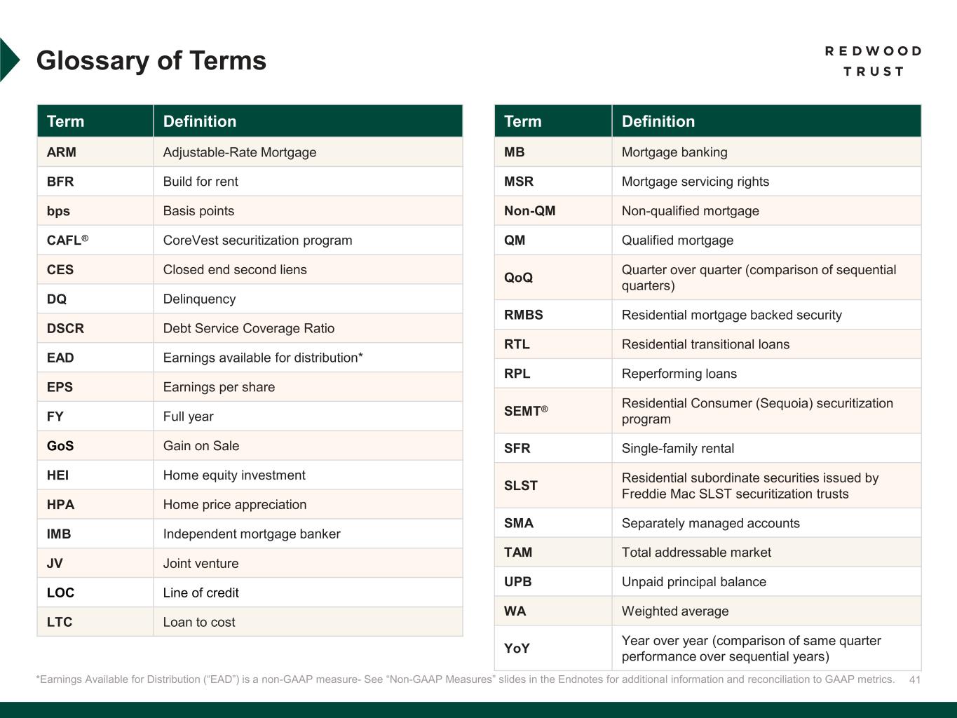 41*Earnings Available for Distribution (“EAD”) is a non-GAAP measure- See “Non-GAAP Measures” slides in the Endnotes for additional information and reconciliation to GAAP metrics. Glossary of Terms Term Definition ARM Adjustable-Rate Mortgage BFR Build for rent bps Basis points CAFL® CoreVest securitization program CES Closed end second liens DQ Delinquency DSCR Debt Service Coverage Ratio EAD Earnings available for distribution* EPS Earnings per share FY Full year GoS Gain on Sale HEI Home equity investment HPA Home price appreciation IMB Independent mortgage banker JV Joint venture LOC Line of credit LTC Loan to cost Term Definition MB Mortgage banking MSR Mortgage servicing rights Non-QM Non-qualified mortgage QM Qualified mortgage QoQ Quarter over quarter (comparison of sequential quarters) RMBS Residential mortgage backed security RTL Residential transitional loans RPL Reperforming loans SEMT® Residential Consumer (Sequoia) securitization program SFR Single-family rental SLST Residential subordinate securities issued by Freddie Mac SLST securitization trusts SMA Separately managed accounts TAM Total addressable market UPB Unpaid principal balance WA Weighted average YoY Year over year (comparison of same quarter performance over sequential years)